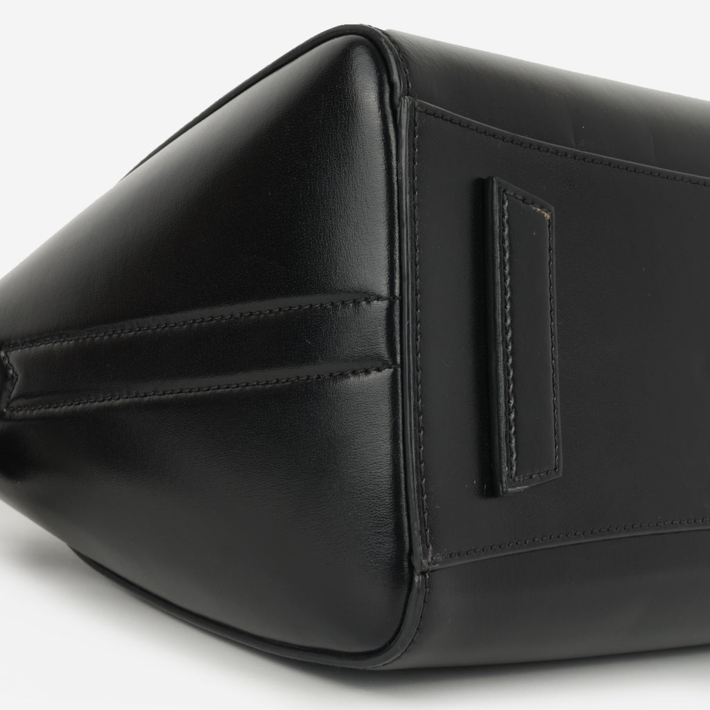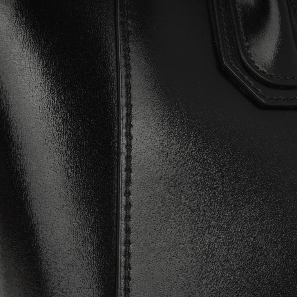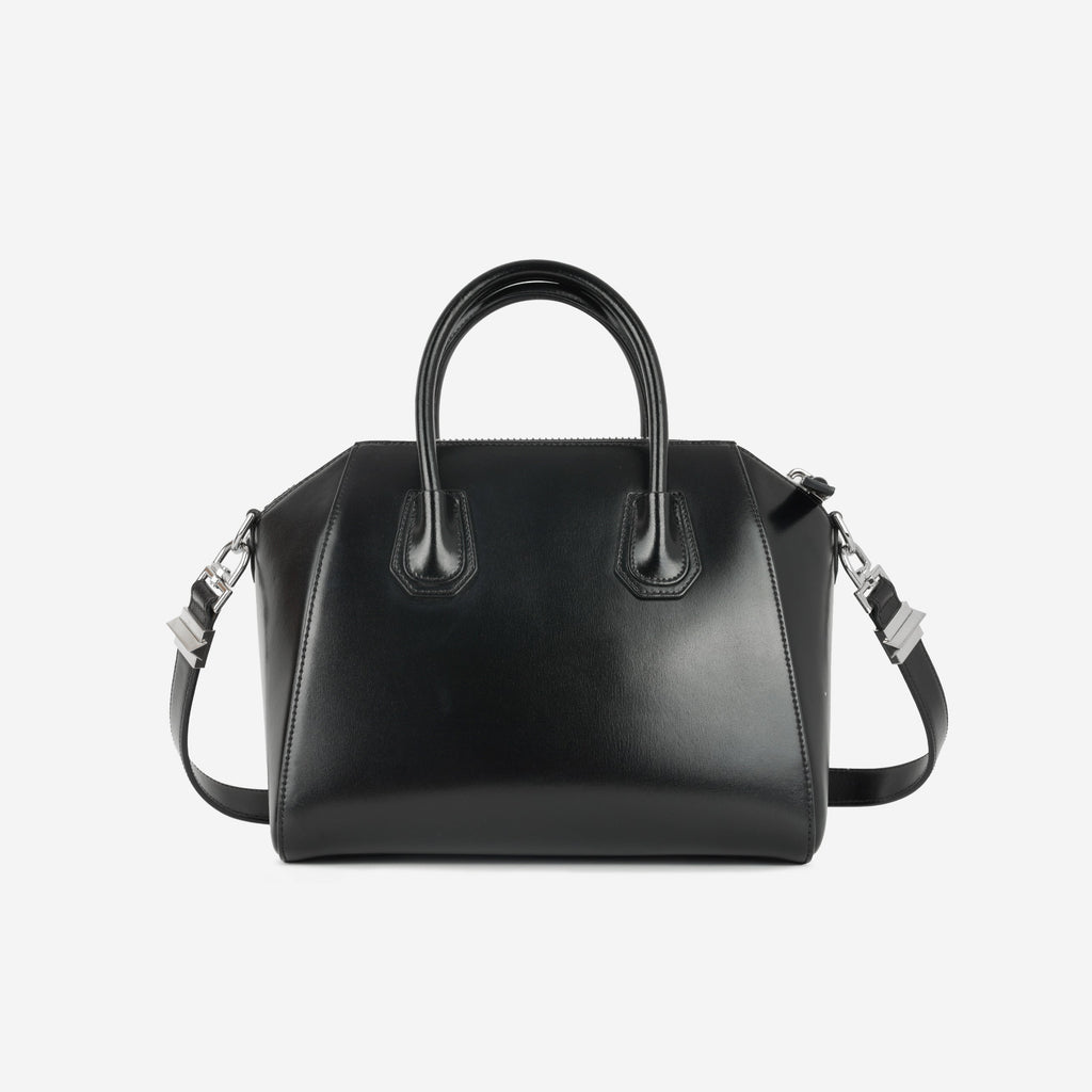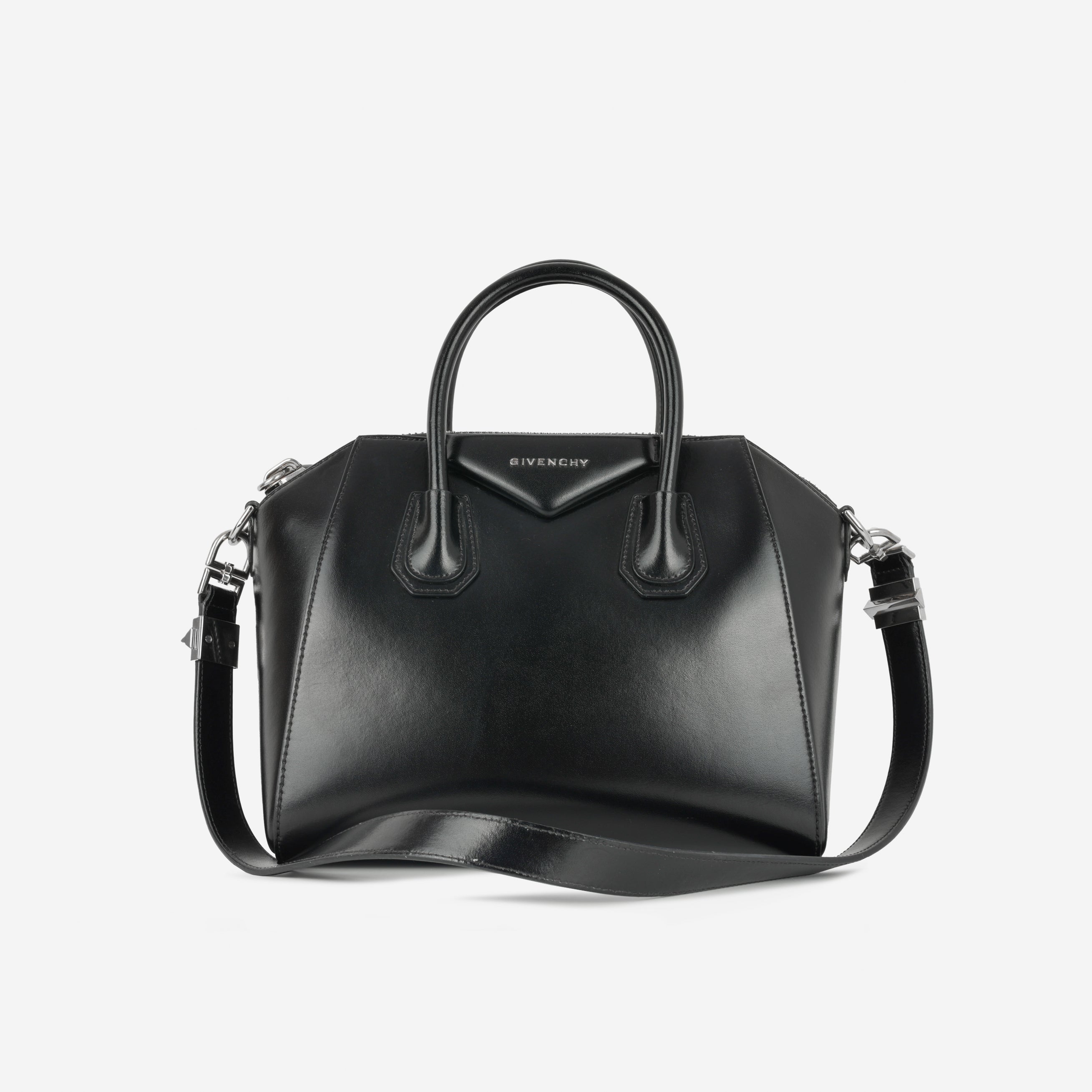 The Givenchy Medium Antigona in black calfskin leather with silver hardware is a modern classic and a cornerstone of the Givenchy handbag collection.