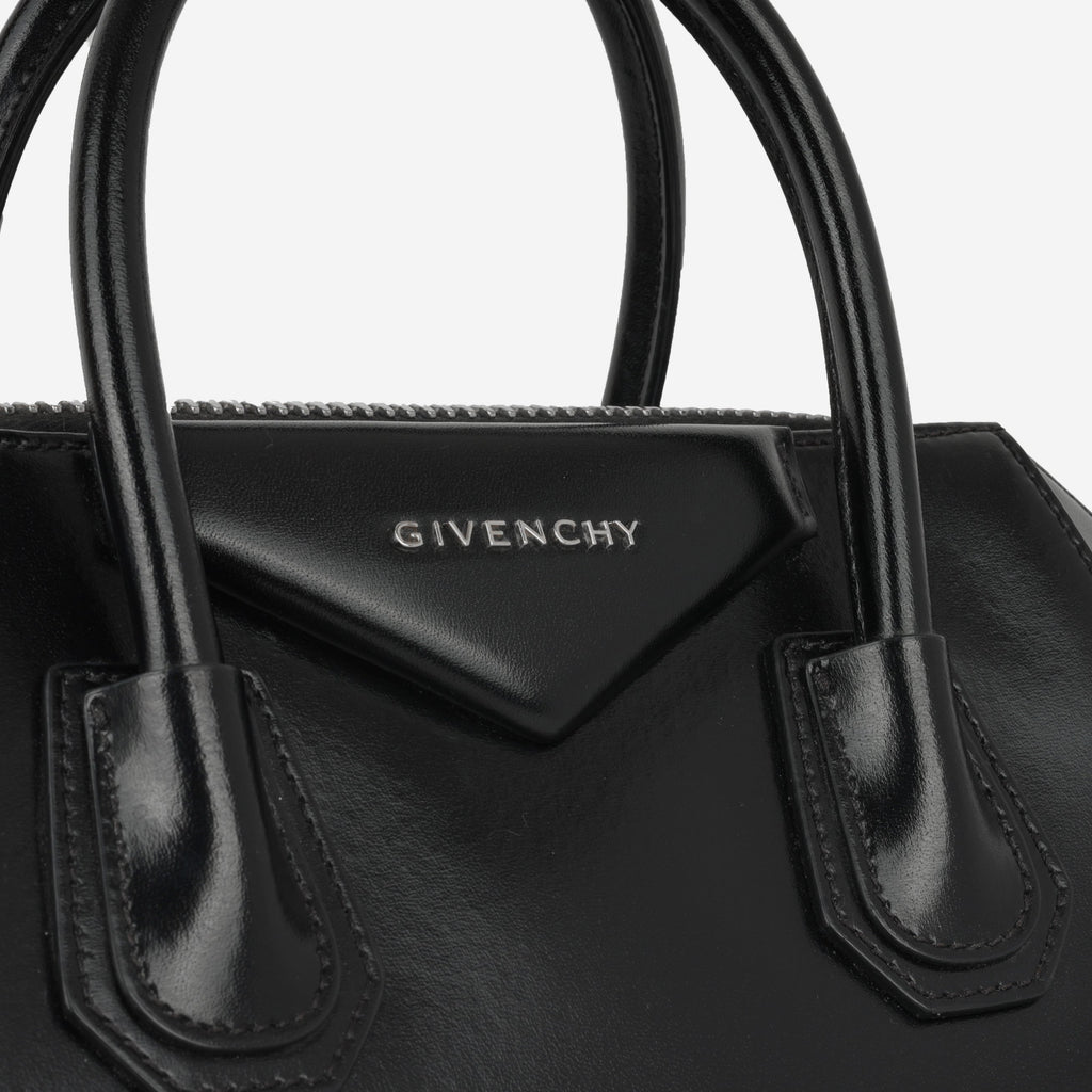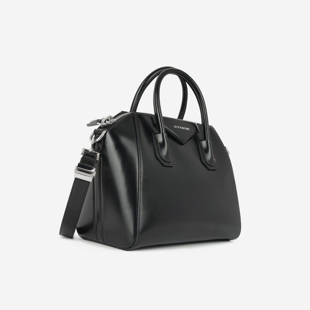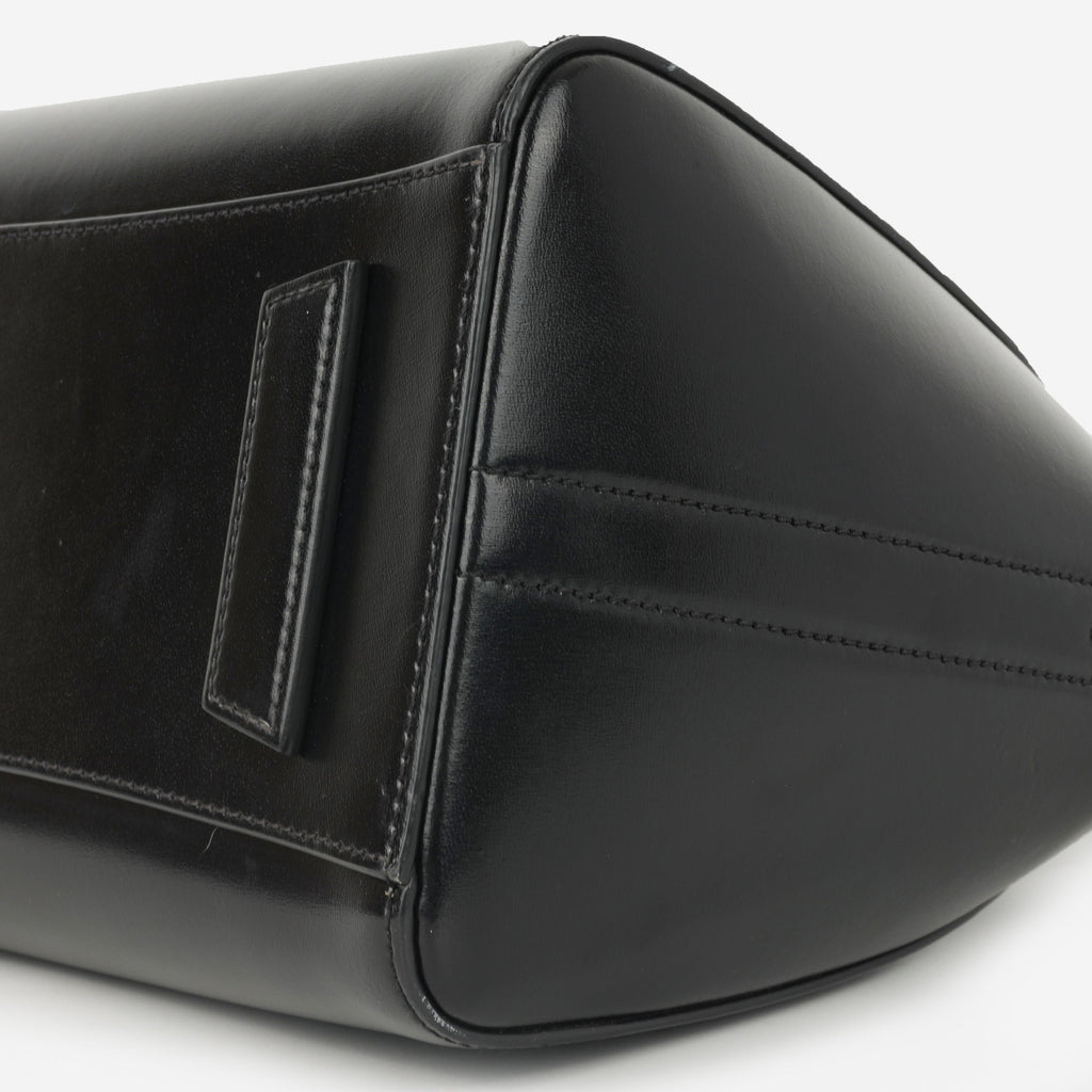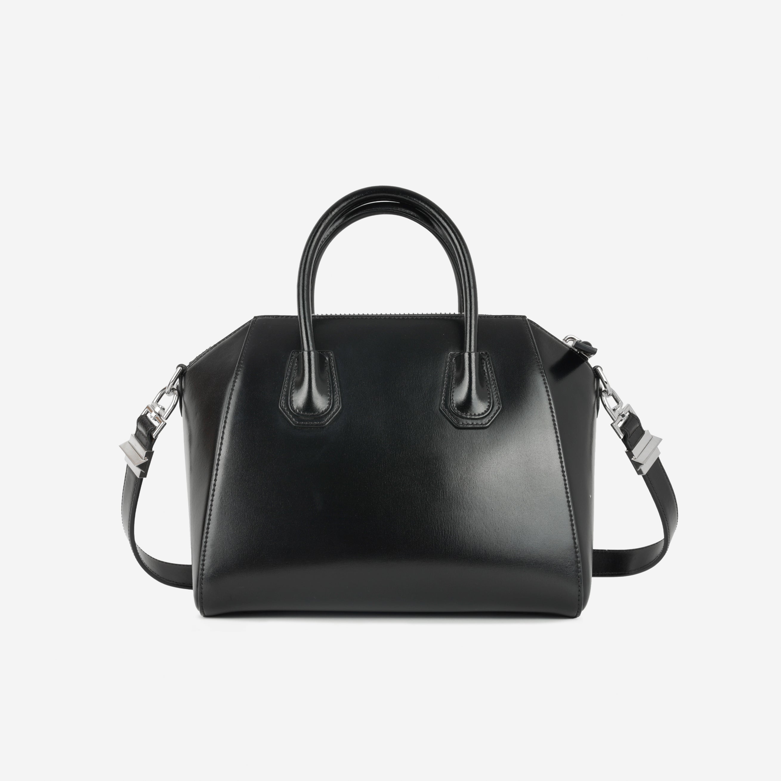 The Givenchy Medium Antigona in black calfskin leather with silver hardware is a modern classic and a cornerstone of the Givenchy handbag collection.