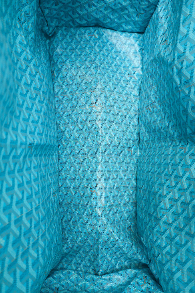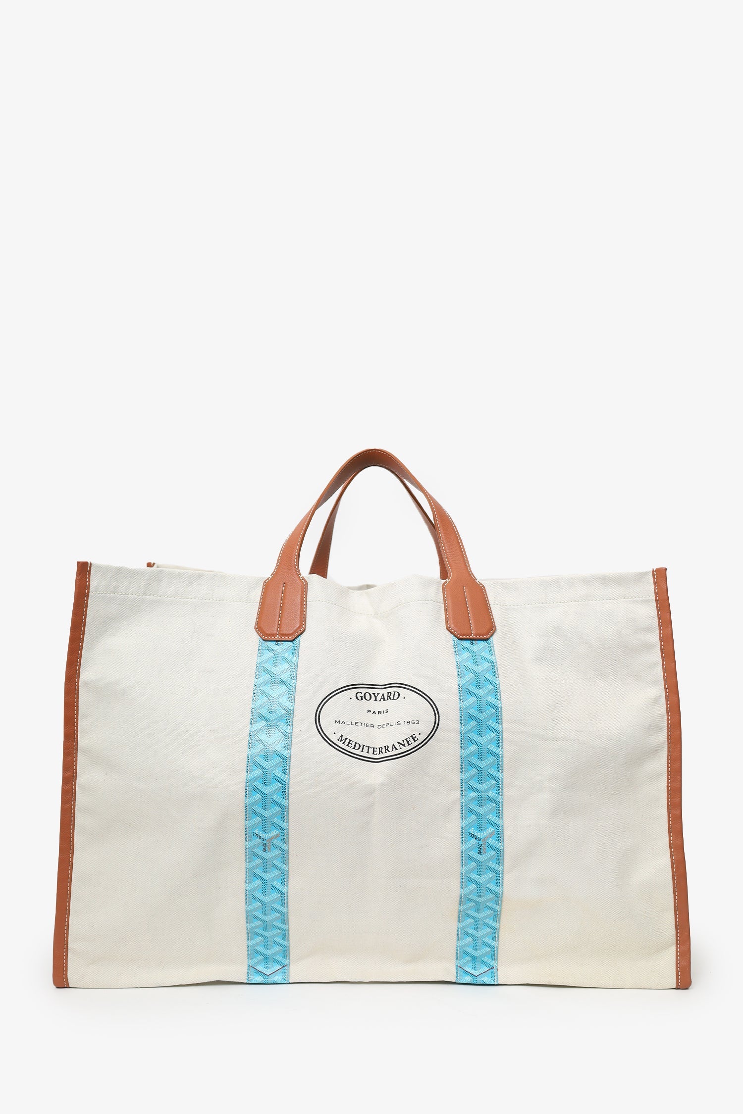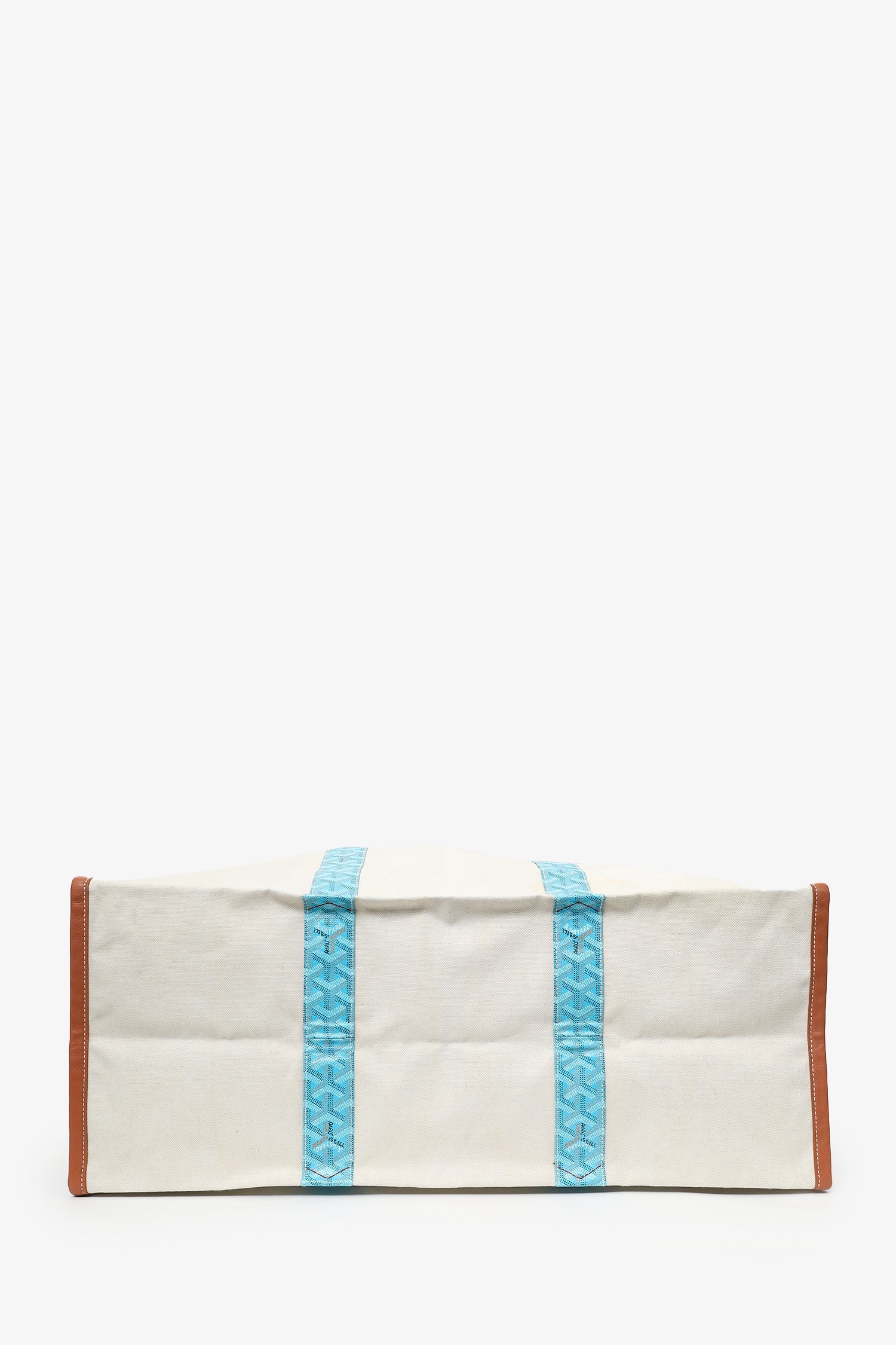 Goyard Blue/Brown Goyardine Mediterranee Saint Tropez Reversible Tote. Open top. Reversible. Open interior. Contrast and tonal stitching.