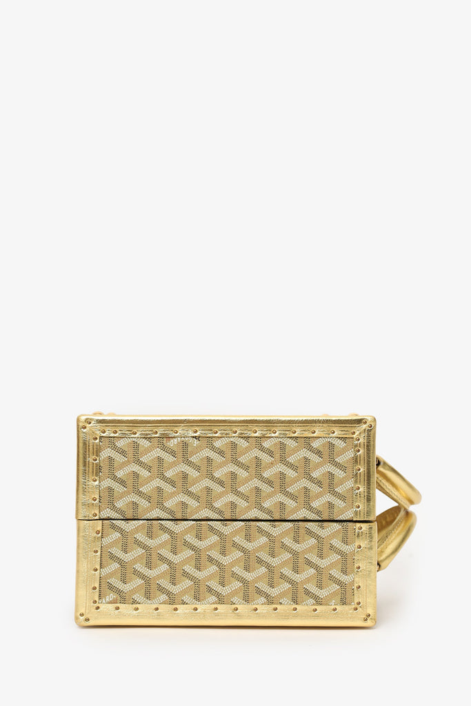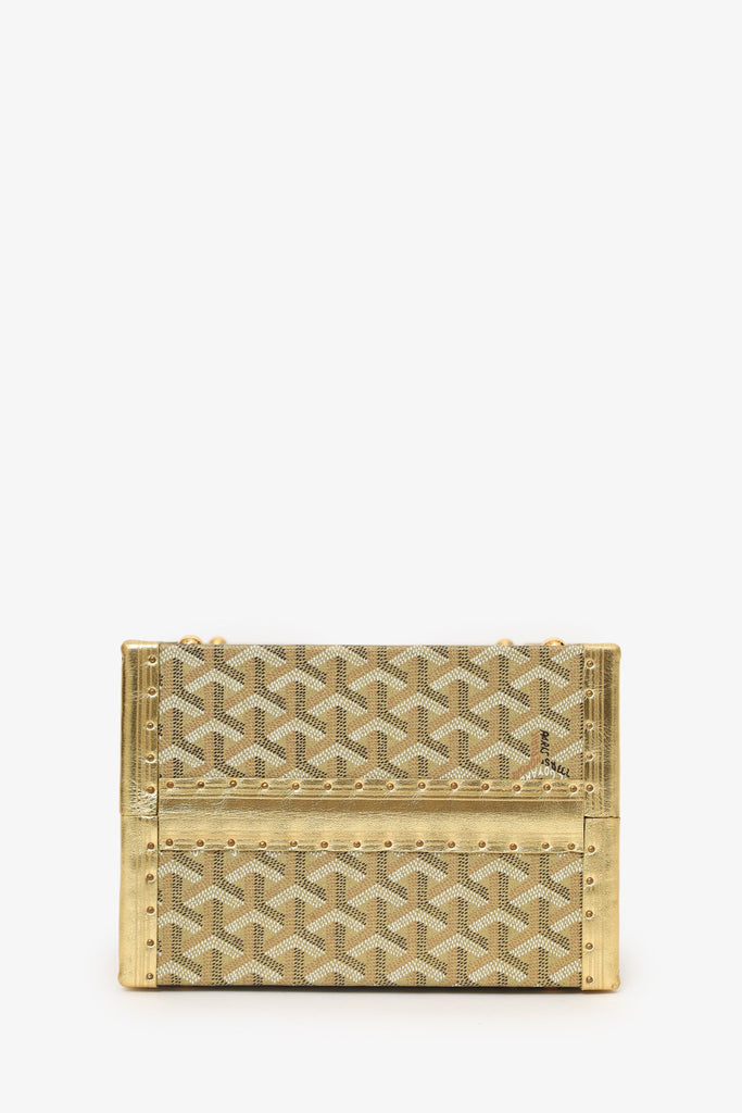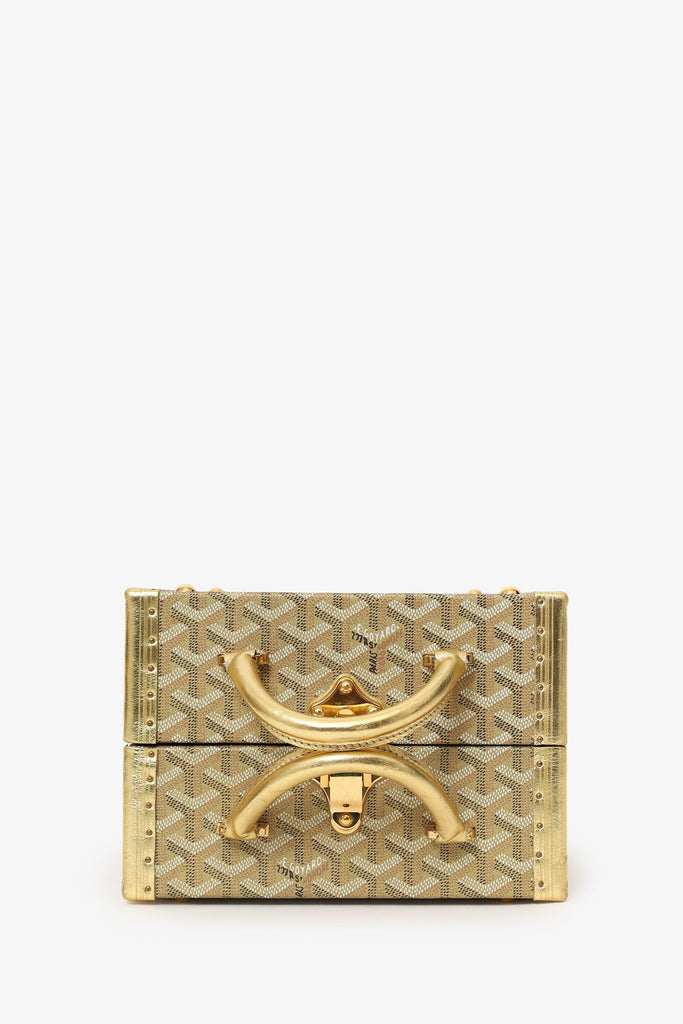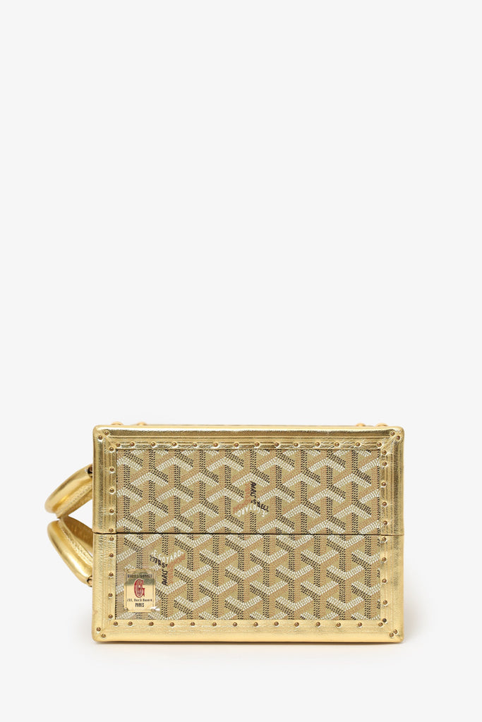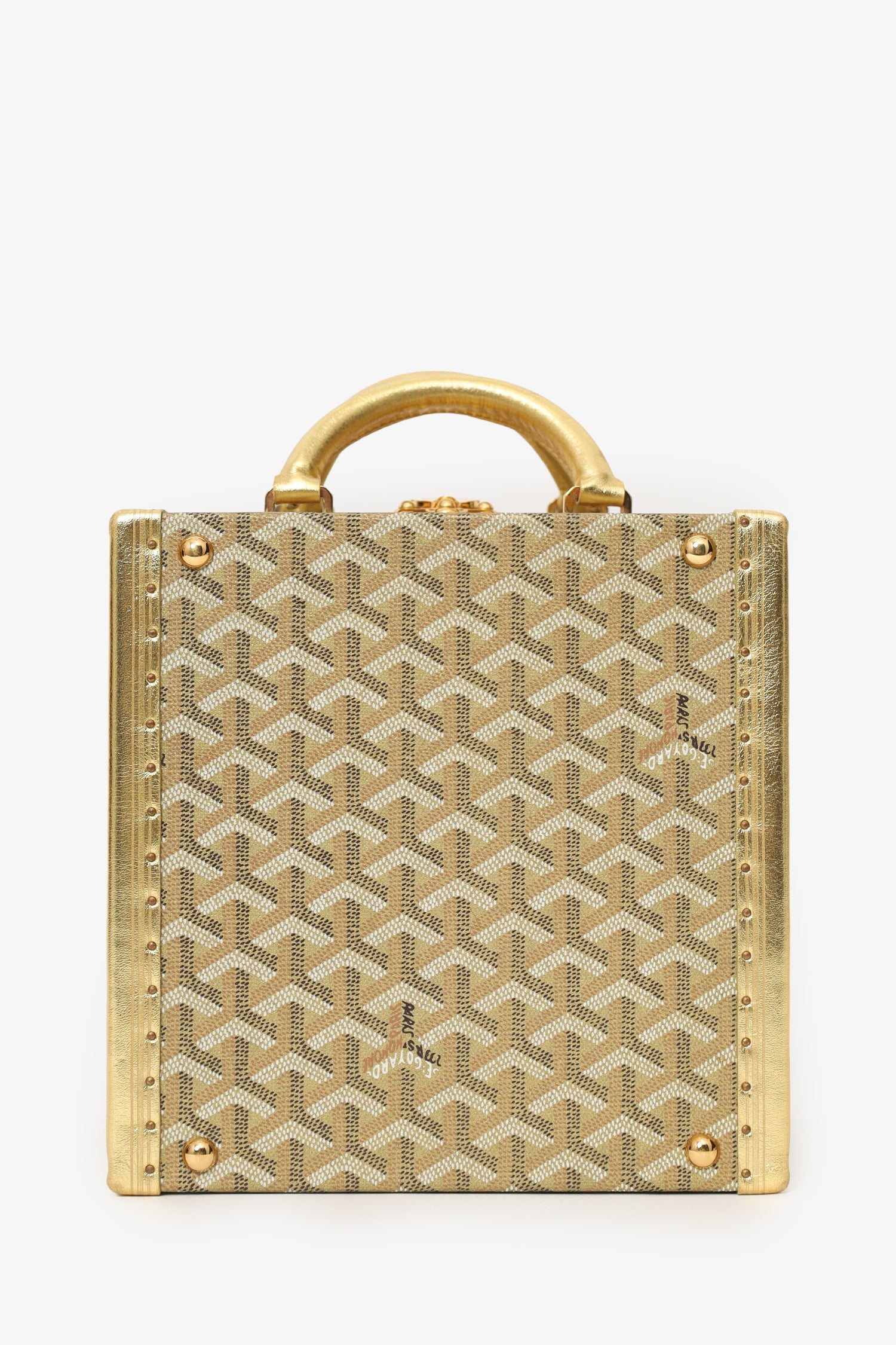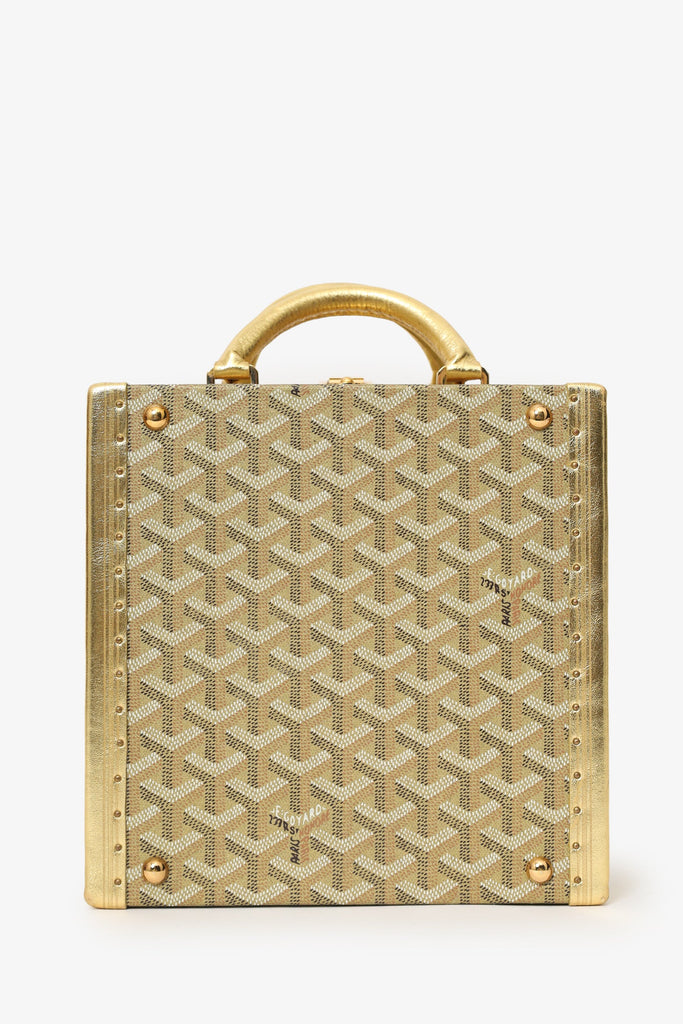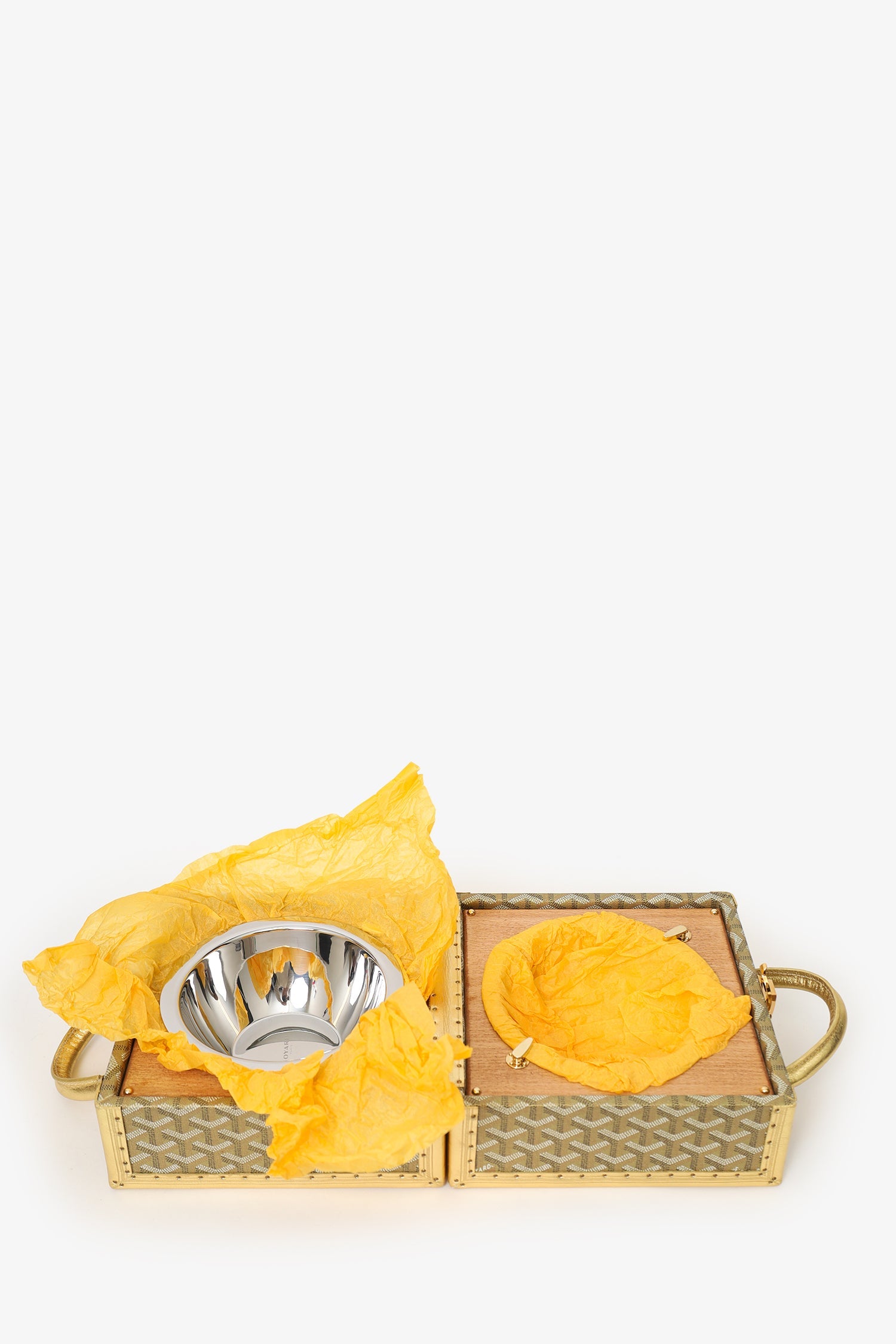 Goyard Gold Canvas Goyardine Travel Pet Bowl 'Ecuelle de Voyage' Trunk. Top flip-lock closure. Twin top handle. Lined interior with 2 removable bowls. Gold and silver-tone hardware. Tonal stitching.