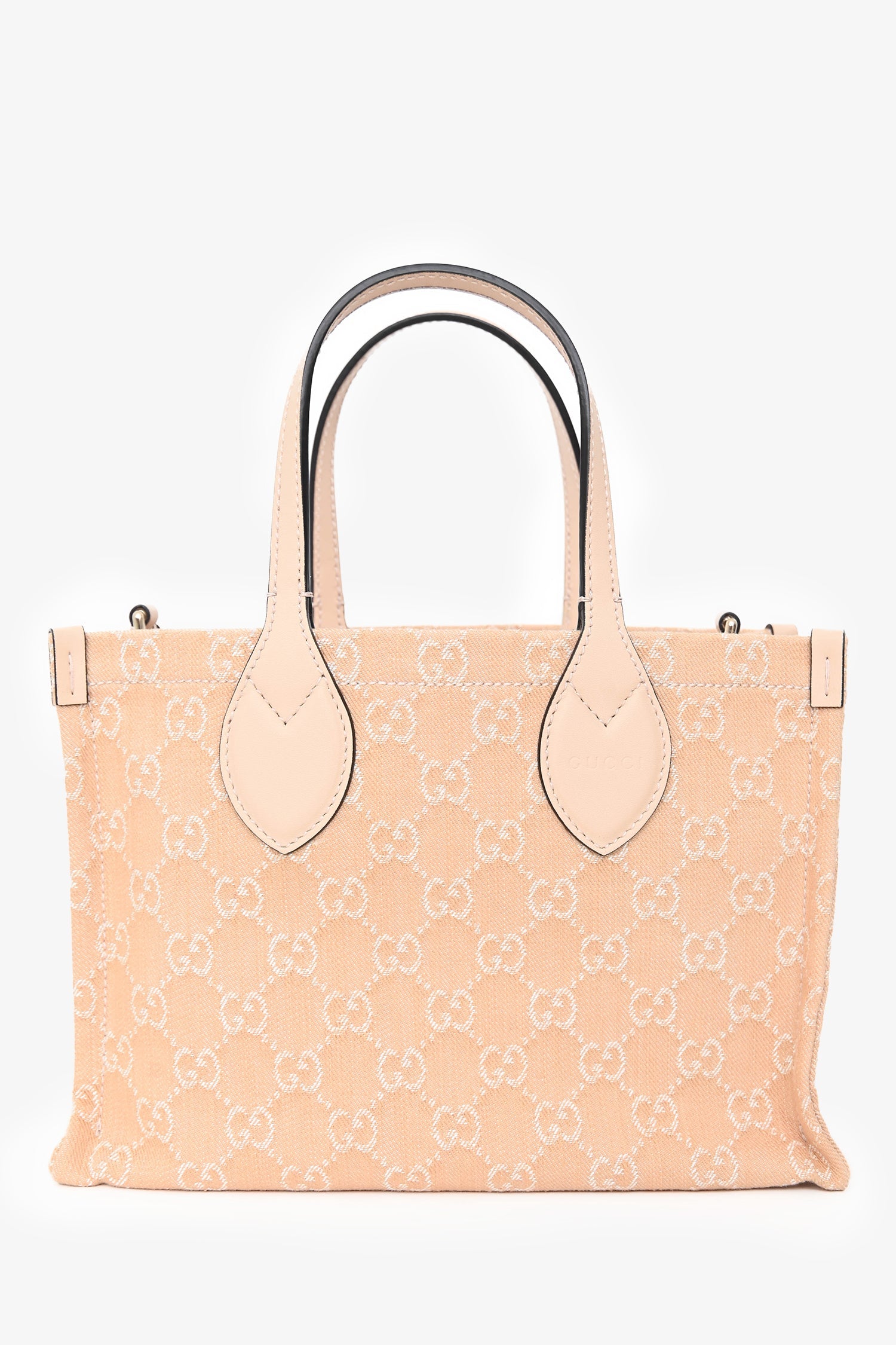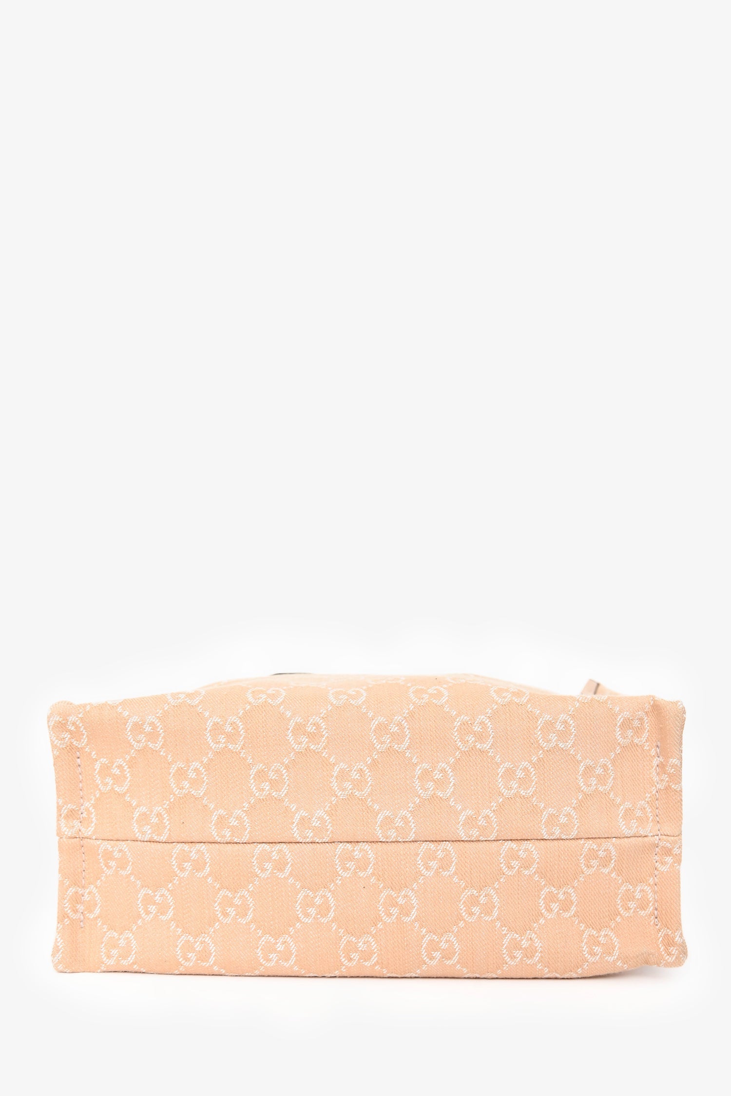 Gucci Beige Monogram Denim Ophidia Large Shopper Tote with Pouch. Open top. Twin top handles. Detachable shoulder strap. Single detachable pouch with zipper closure inside. Leather and fabric lined interior. Gold-tone hardware. Tonal stitching.