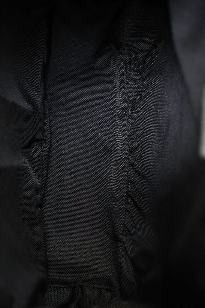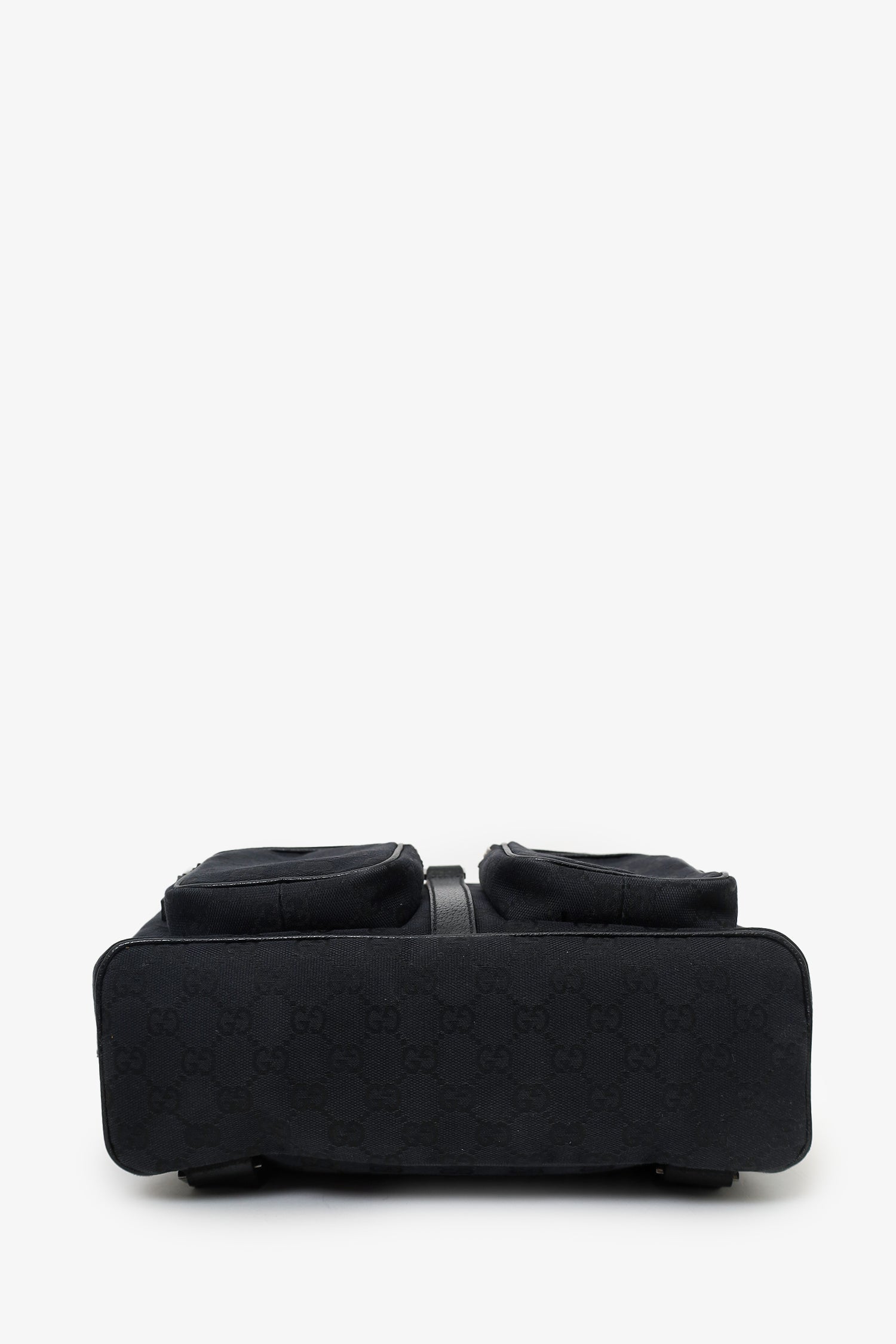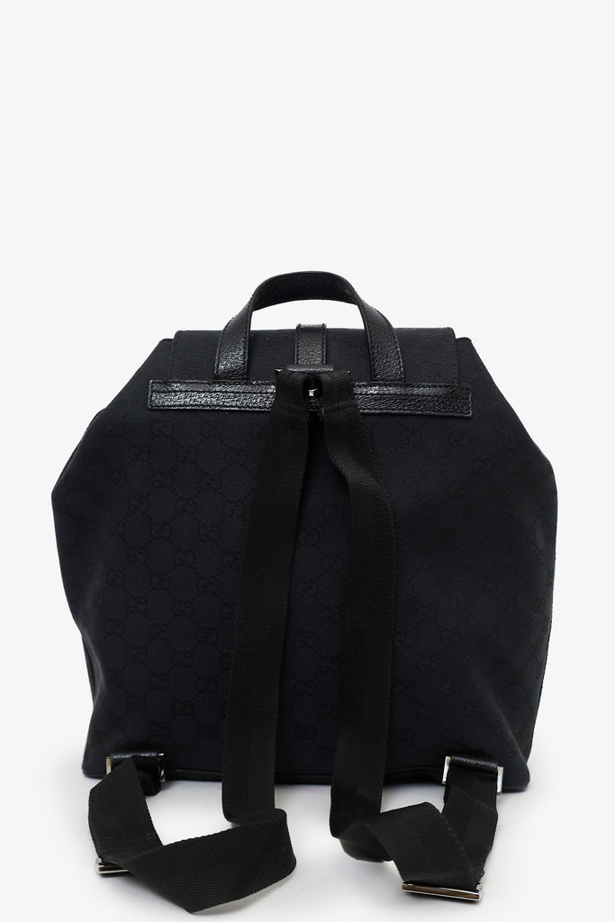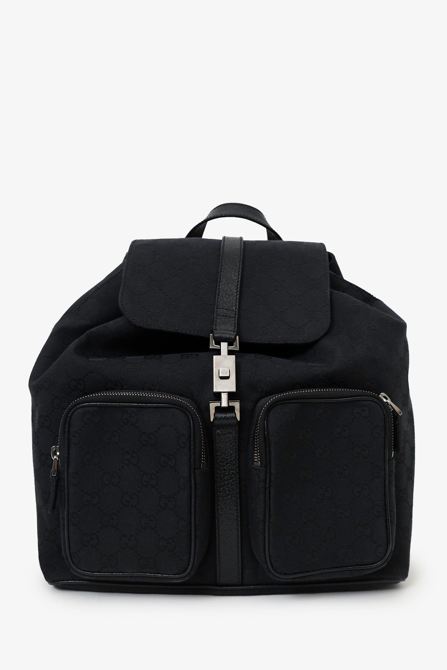 Gucci Black Canvas/Leather Jackie GG Backpack. Front fold-over flap with push-pin closure. Top drawstring closure beneath fold-over flap. Adjustable canvas straps. Two front zip compartments. Single interior rear wall zip pocket. Canvas-lined interior. Silver-tone hardware. Tonal stitching.