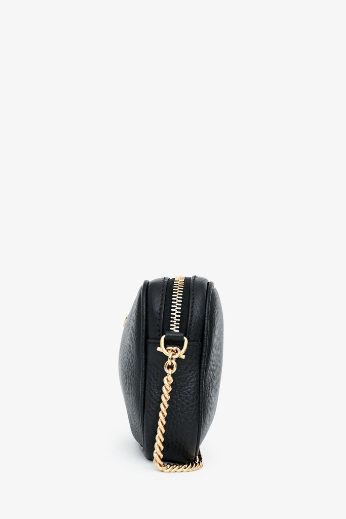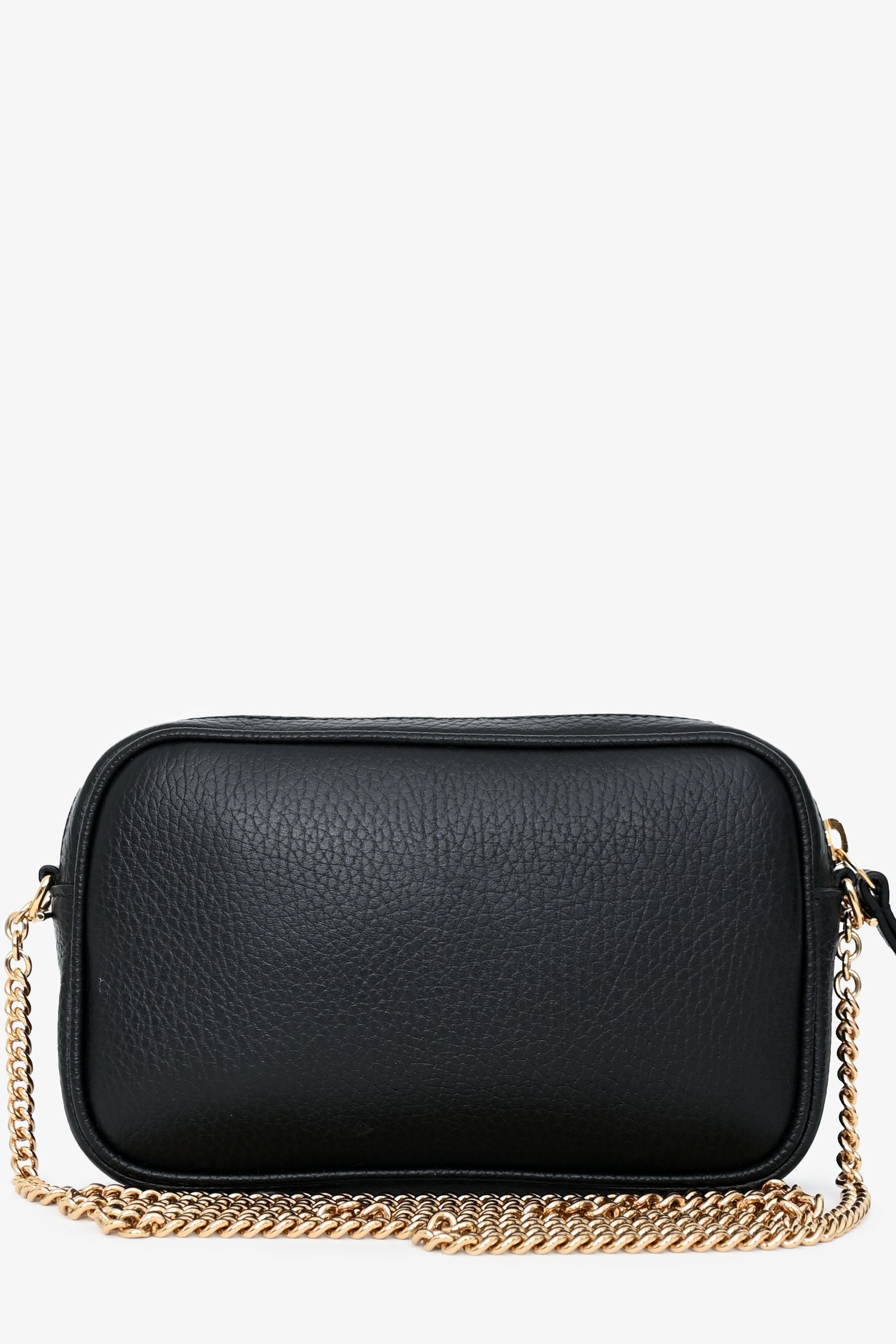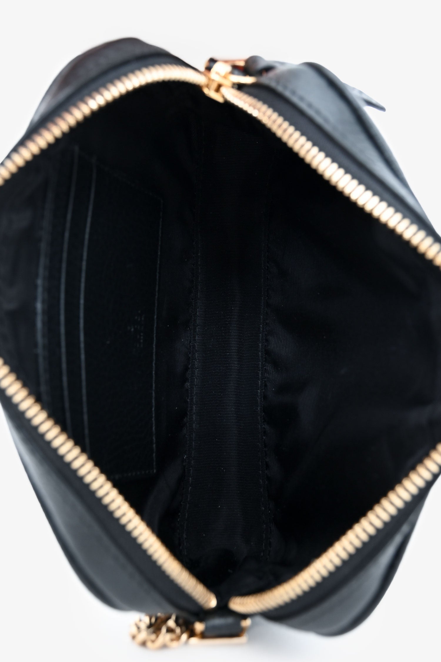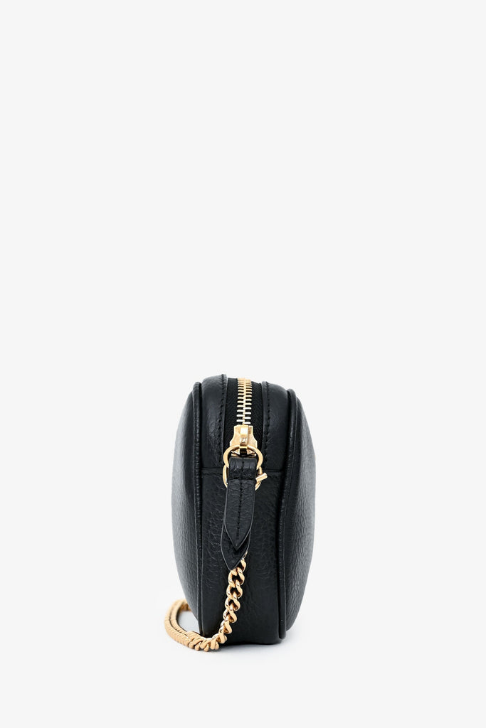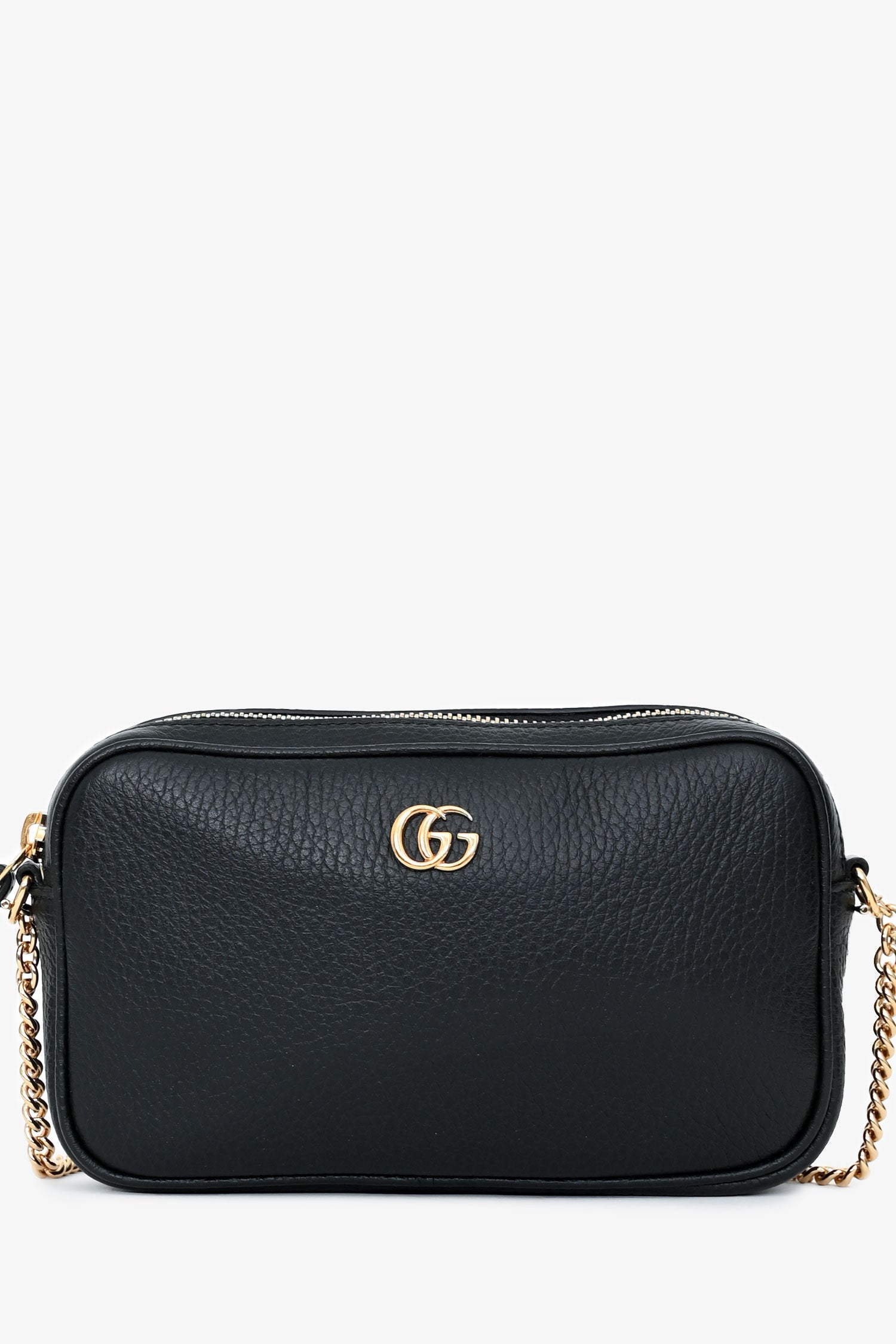 Gucci Black GG Marmont Mini Camera Bag. Top zip closure. Chain link shoulder strap. 2 interior card holders. Gold-tone hardware. Tonal stitching.