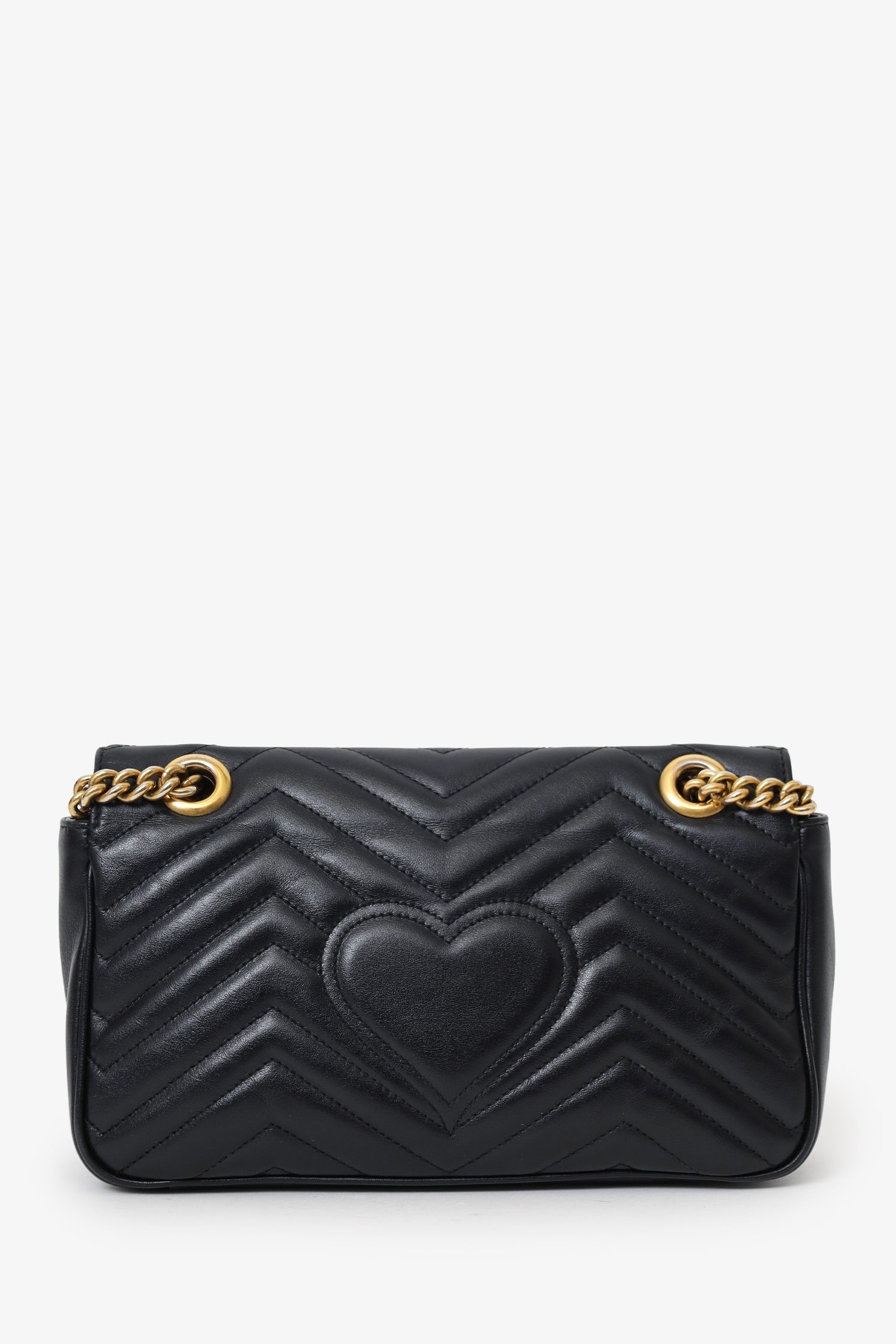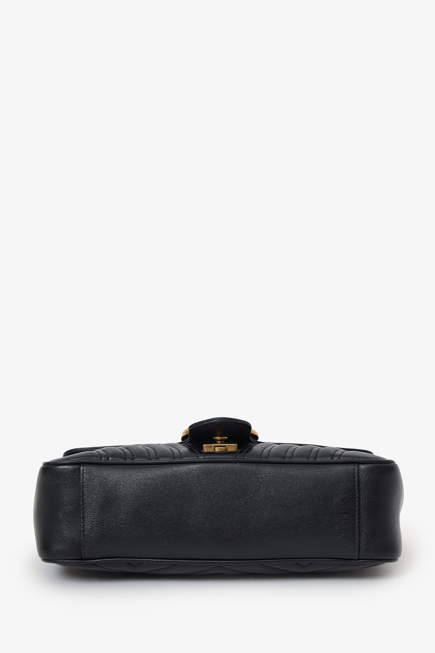 Gucci Black Leather GG Marmont Small Crossbody Bag. Front fold-over flap with pinch lock closure. Twin chainlink strap that can be pulled into one longer strap. Suede-lined interior. Single interior zip pocket. Gold-tone hardware. Tonal stitching.