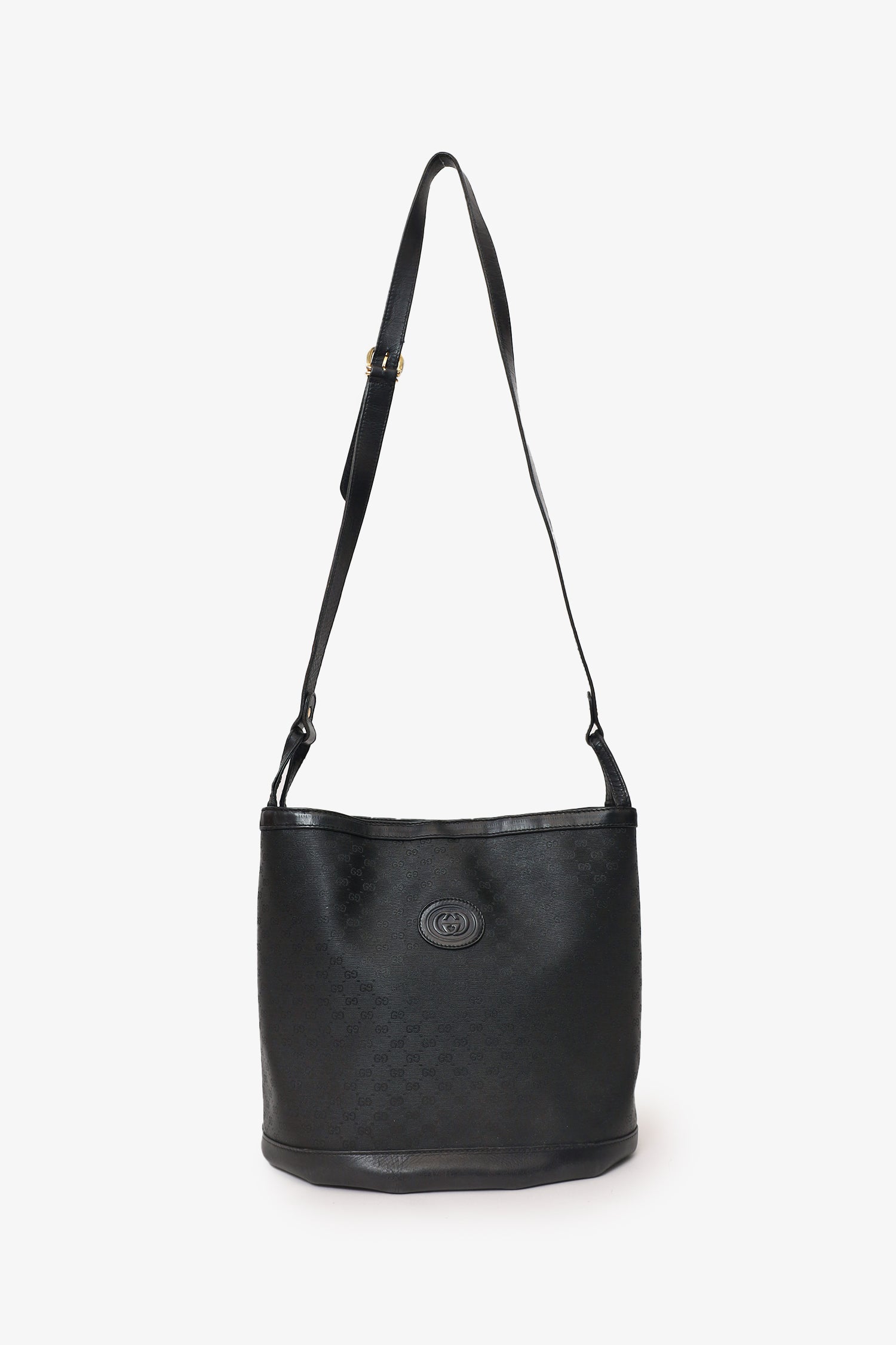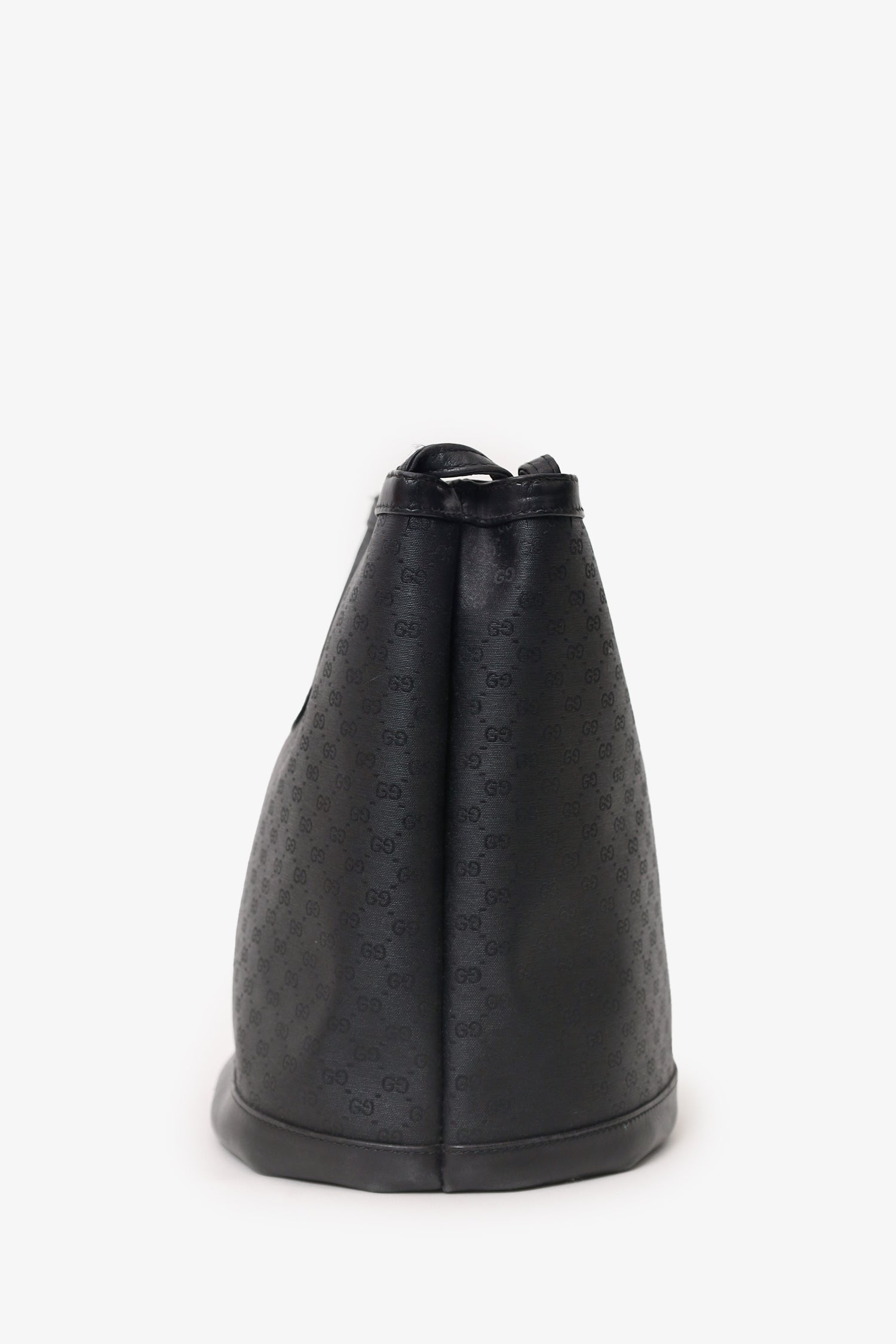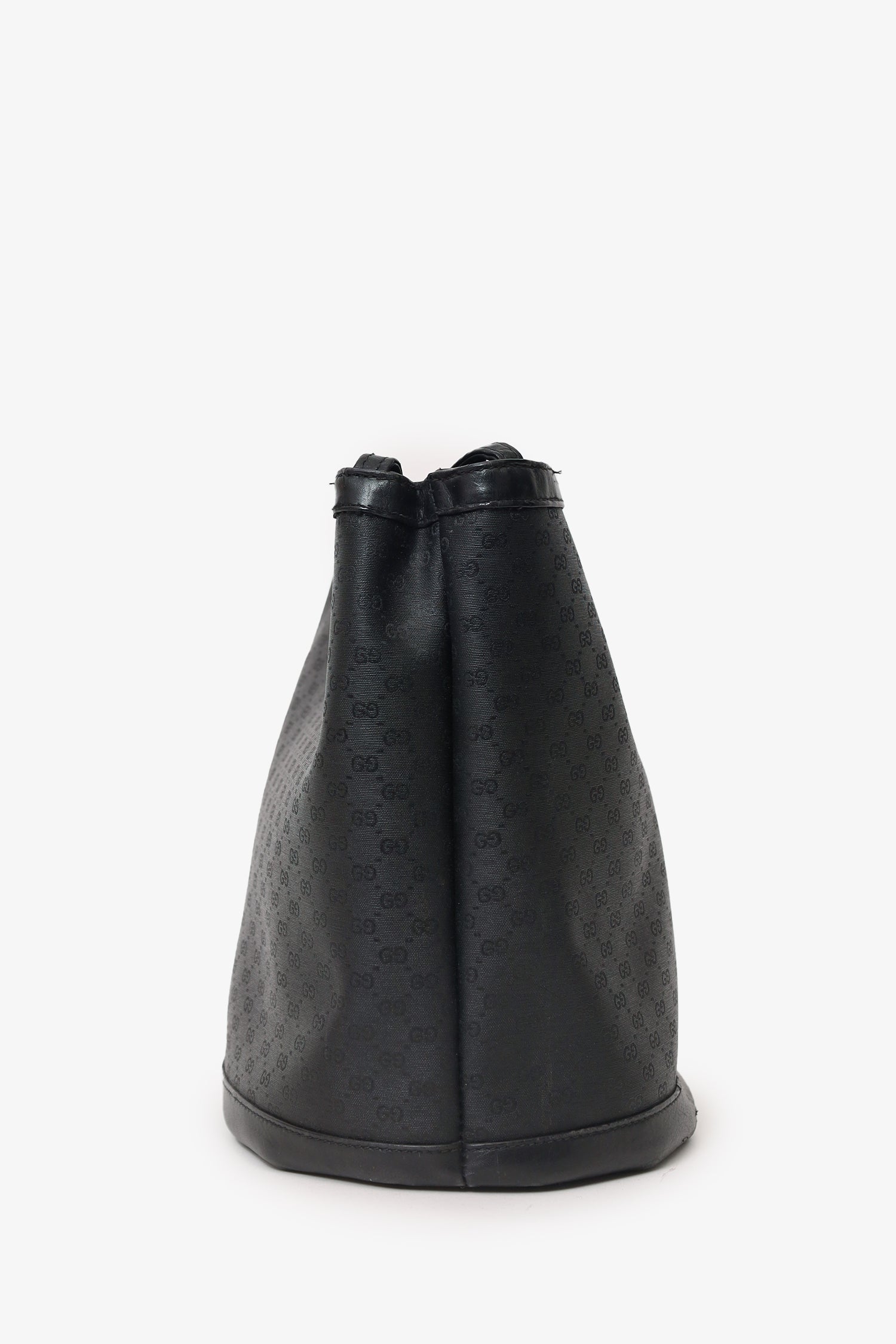 Gucci Black Micro GG Canvas Bag. Top zip with magnetic button closure. Adjustable crossbody strap with pull through buckle closure. Lined interior. 3 interior compartments, 2 open and 1 with zip closure. Single interior wall zip pocket. Gold-tone hardware. Tonal stitching.