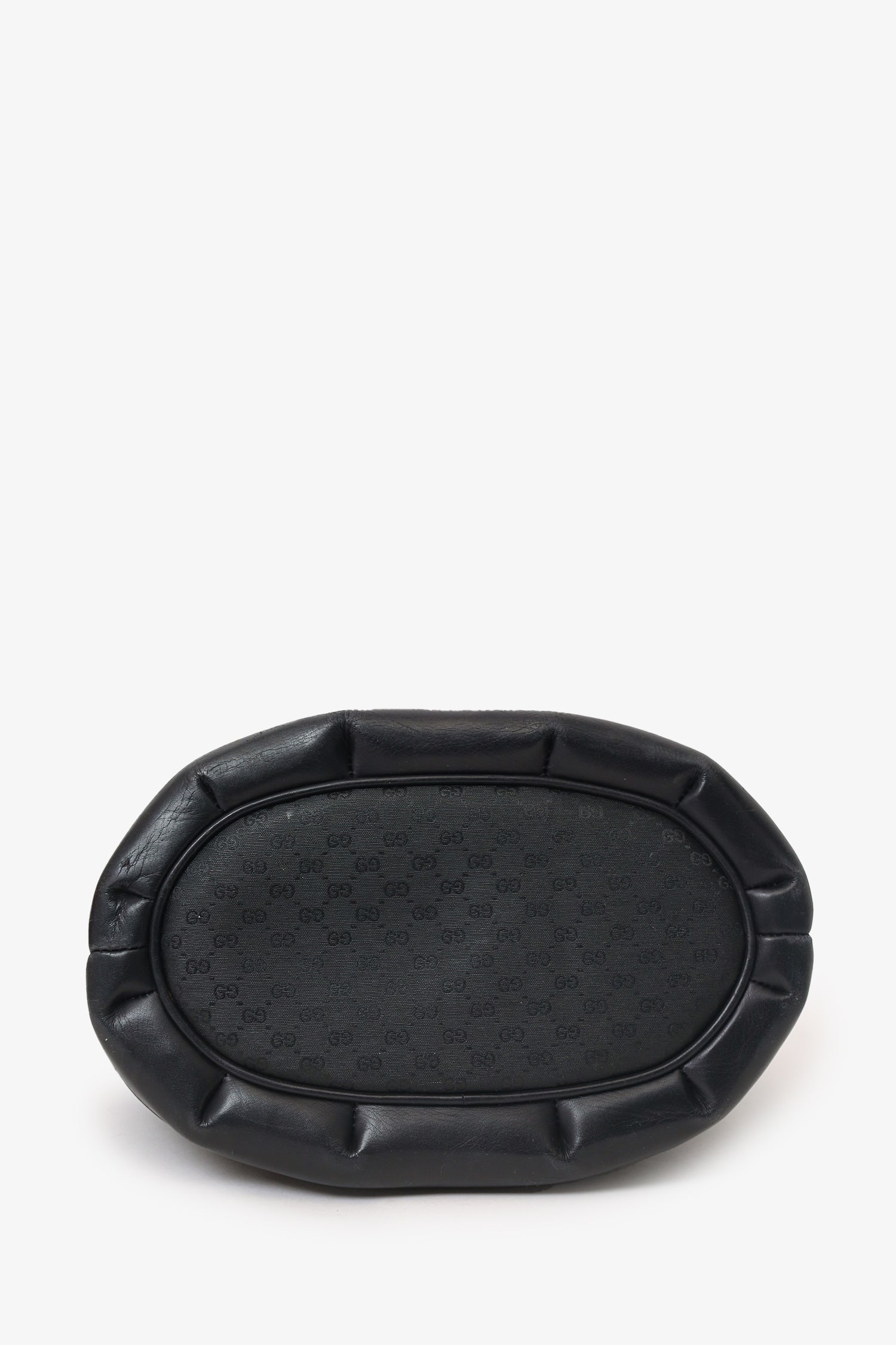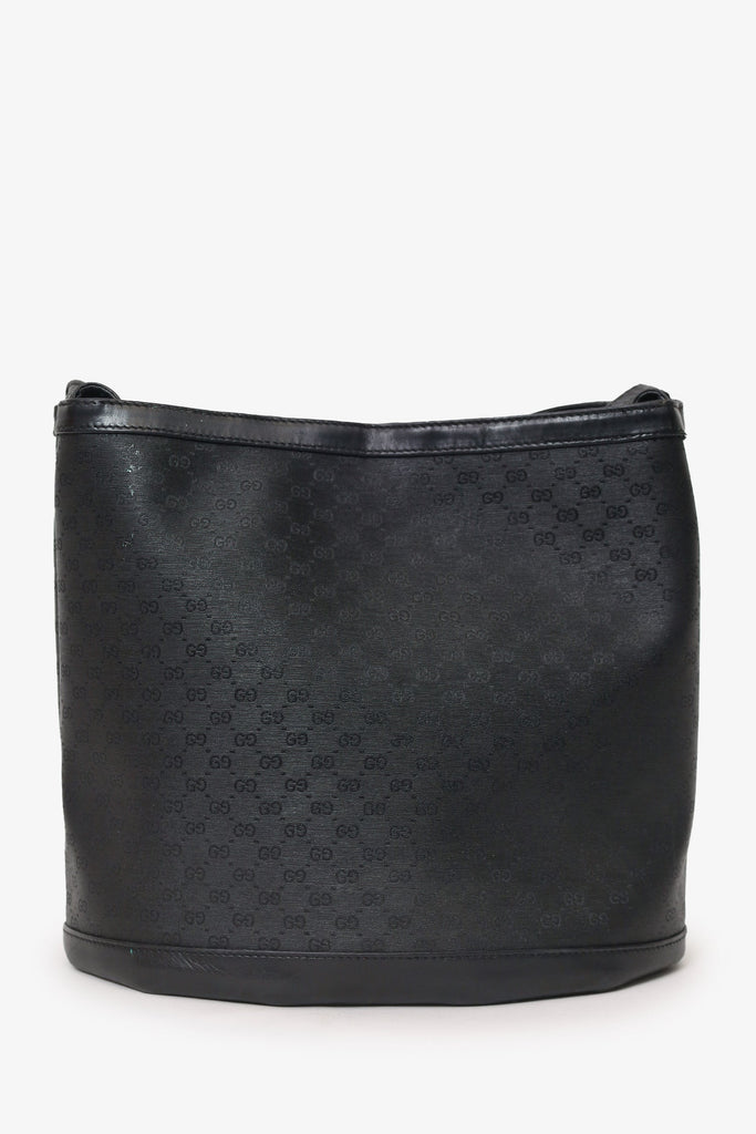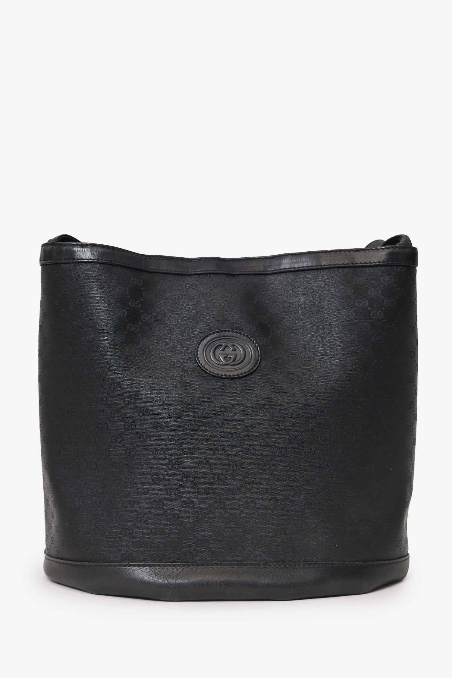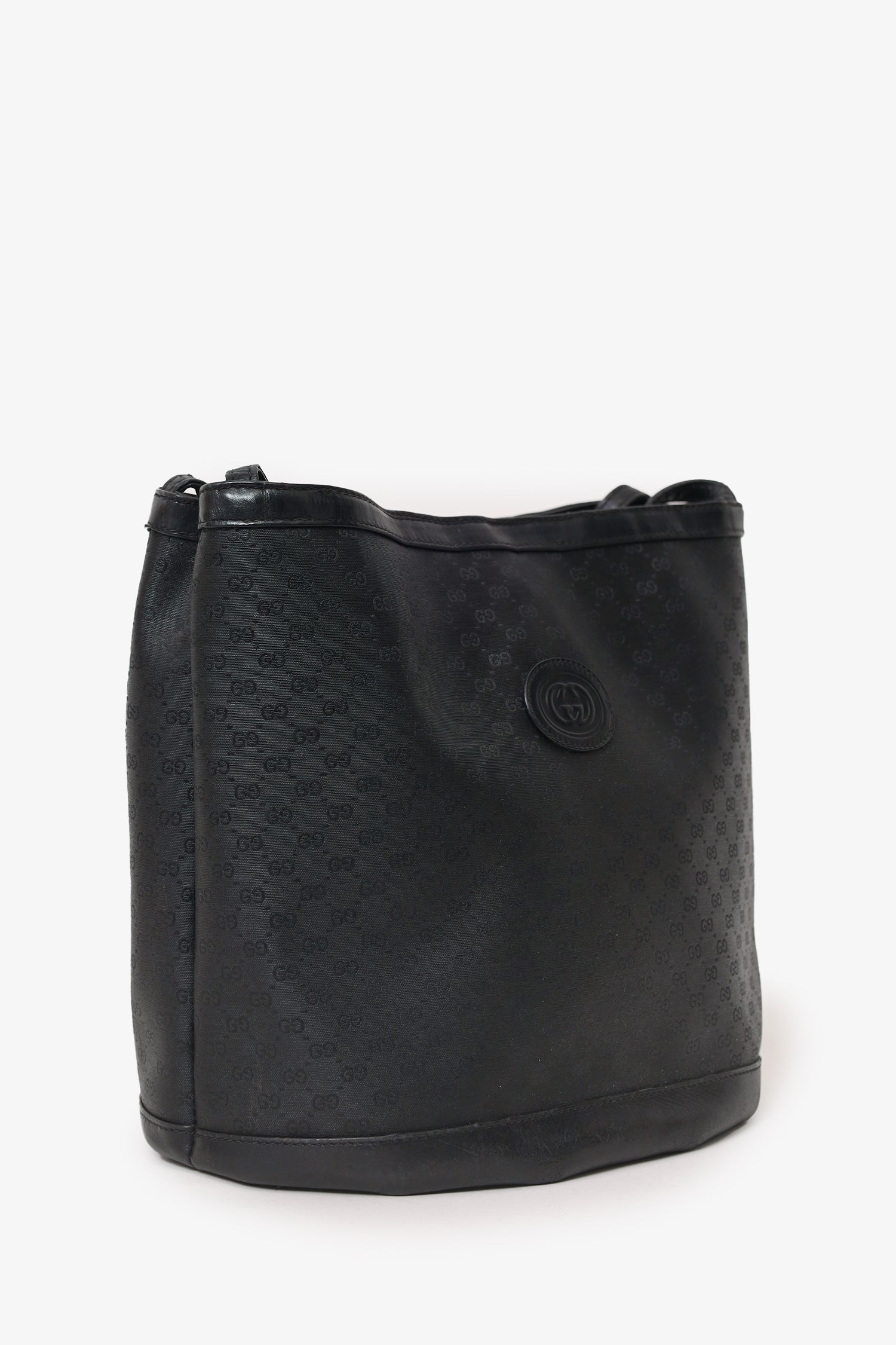 Gucci Black Micro GG Canvas Bag. Top zip with magnetic button closure. Adjustable crossbody strap with pull through buckle closure. Lined interior. 3 interior compartments, 2 open and 1 with zip closure. Single interior wall zip pocket. Gold-tone hardware. Tonal stitching.