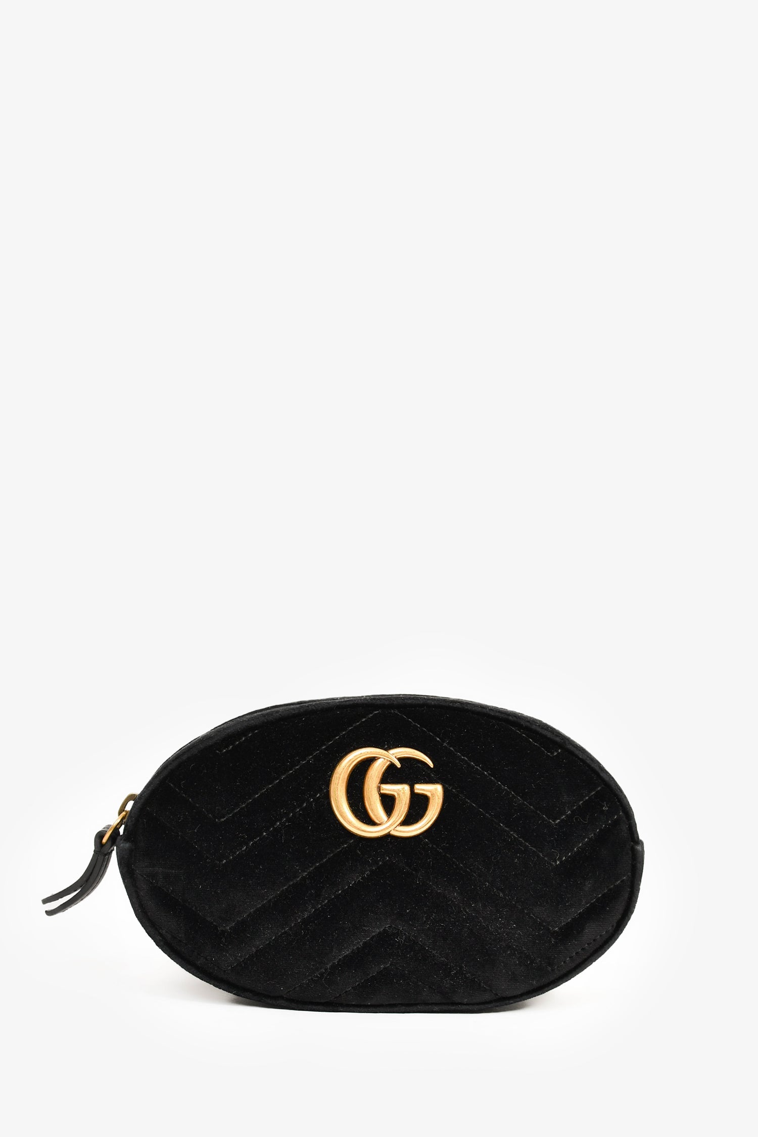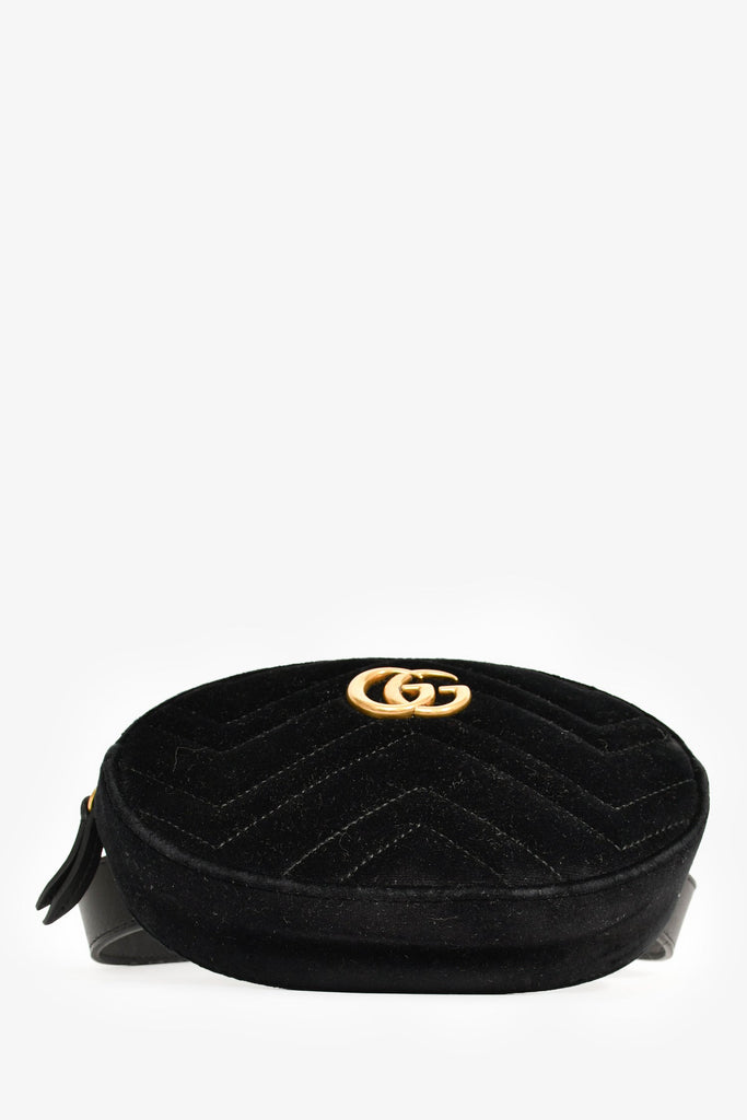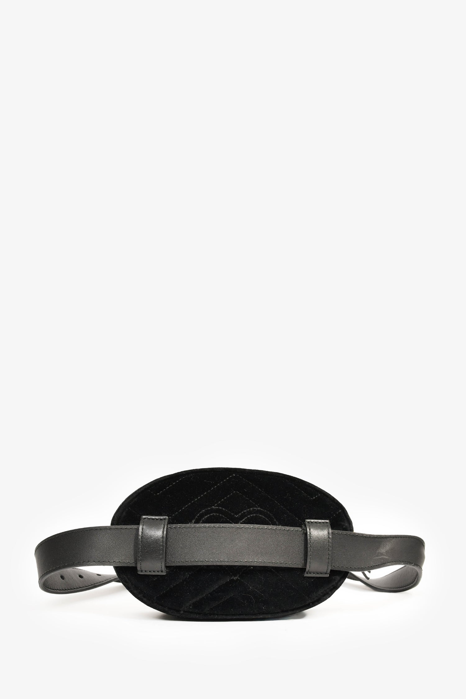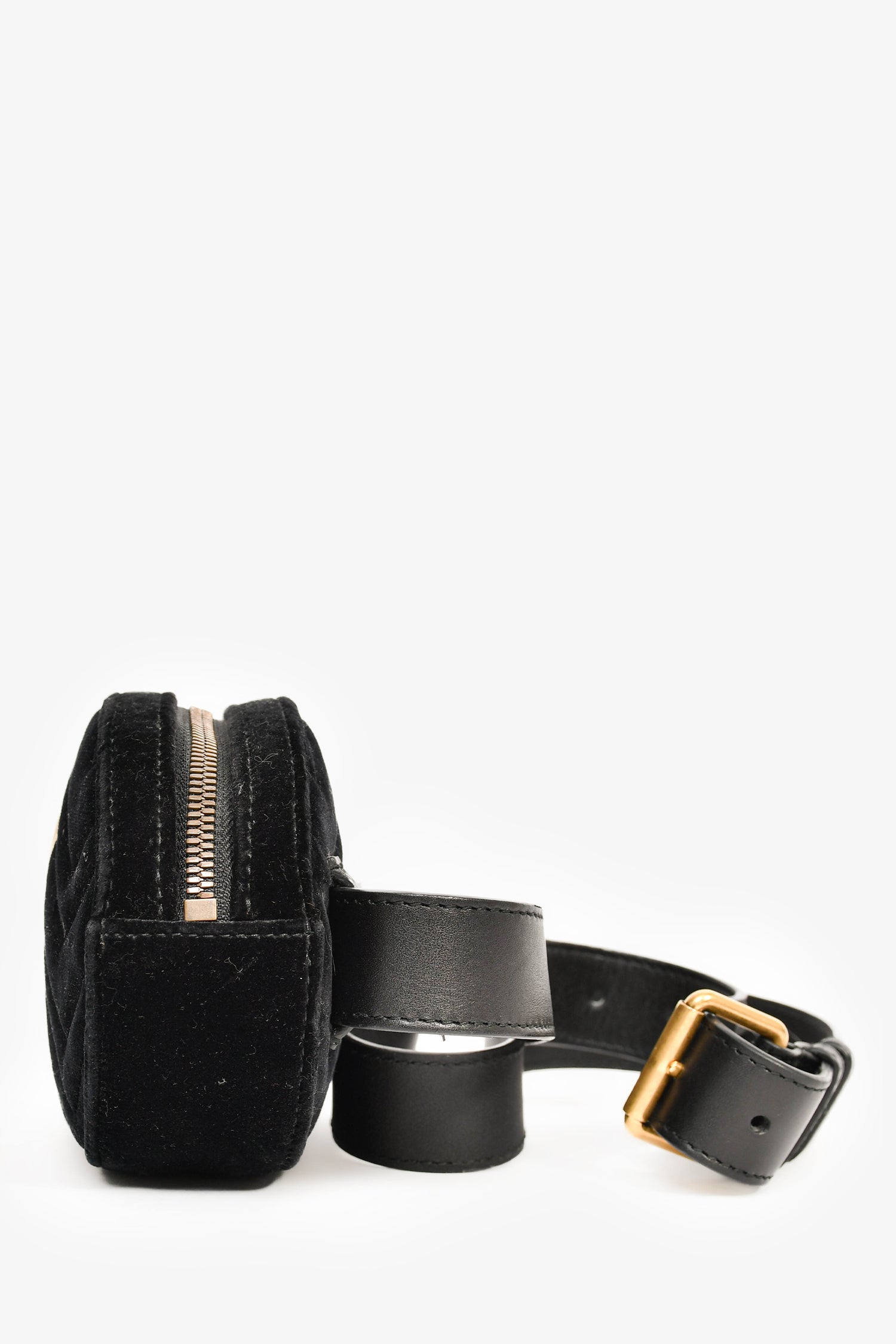 Gucci Black Velvet GG Marmont Belt Bag. Gold-tone hardware. Velvet exterior. Satin-lined interior with a single compartment. Adjustable leather belt strap. Tonal stitching.