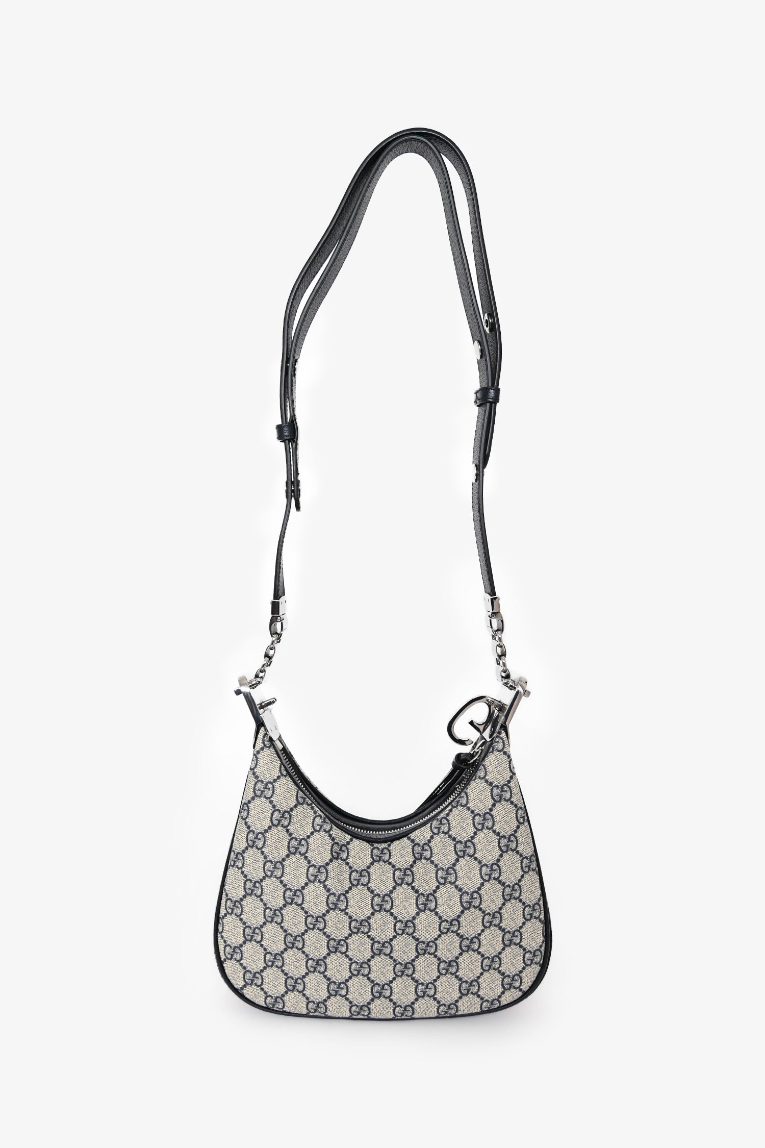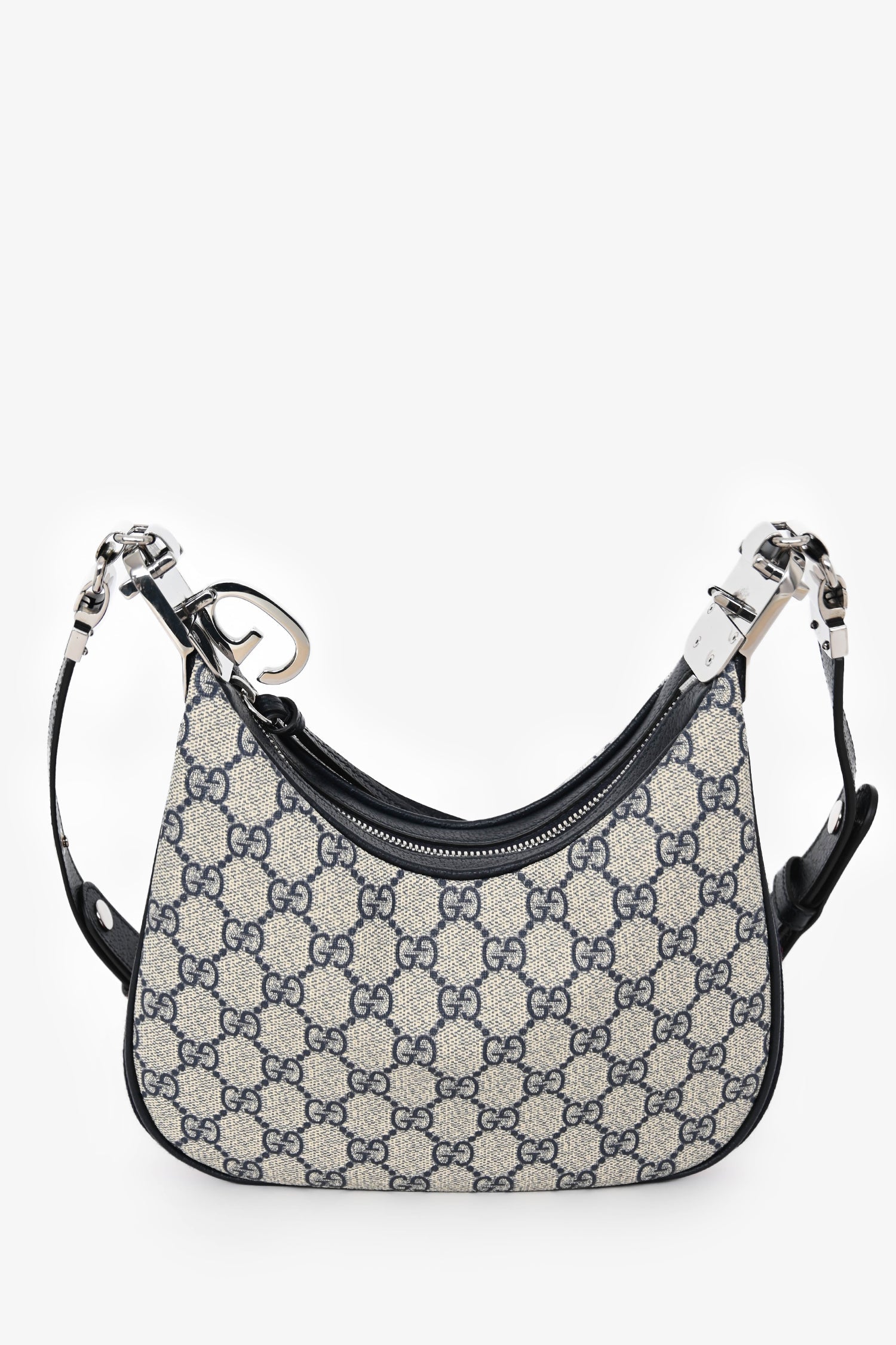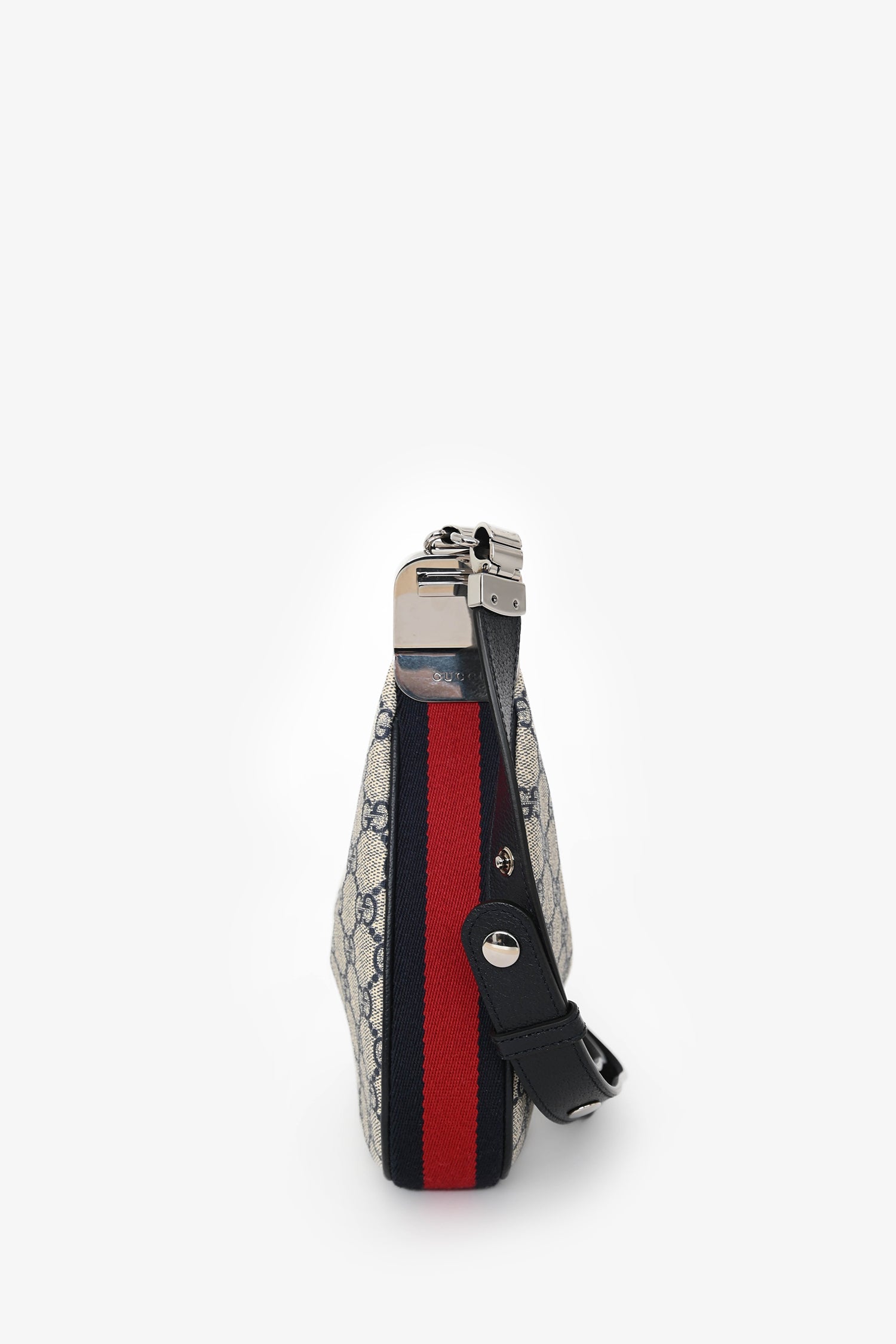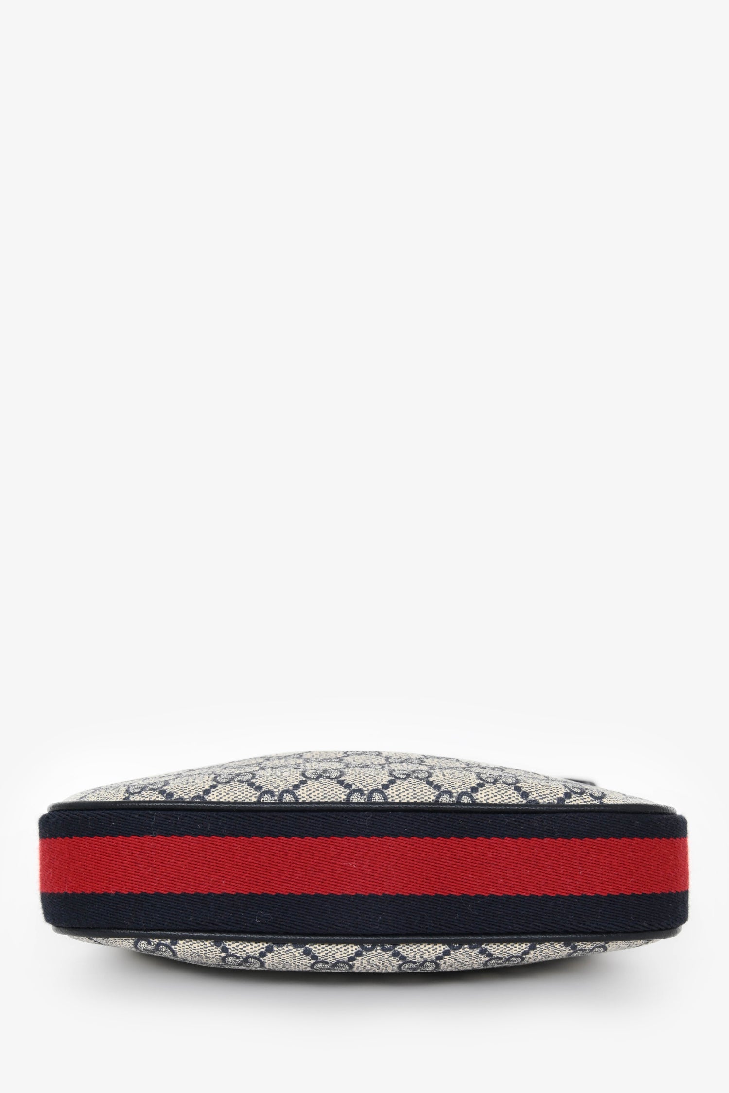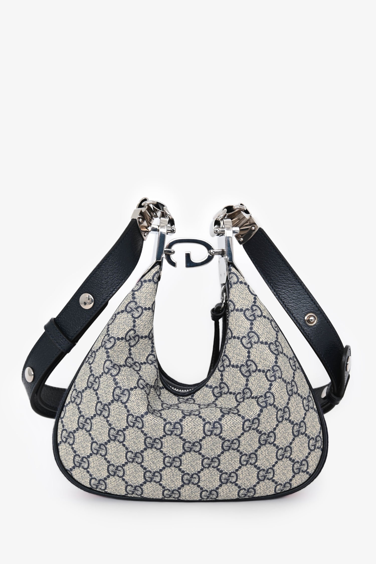 Gucci Blue Canvas/Leather GG 'Attache' Small Bag with Strap. Top zip closure. Adjustable shoulder strap. Single interior compartment. Silver-tone hardware. Tonal stitching.