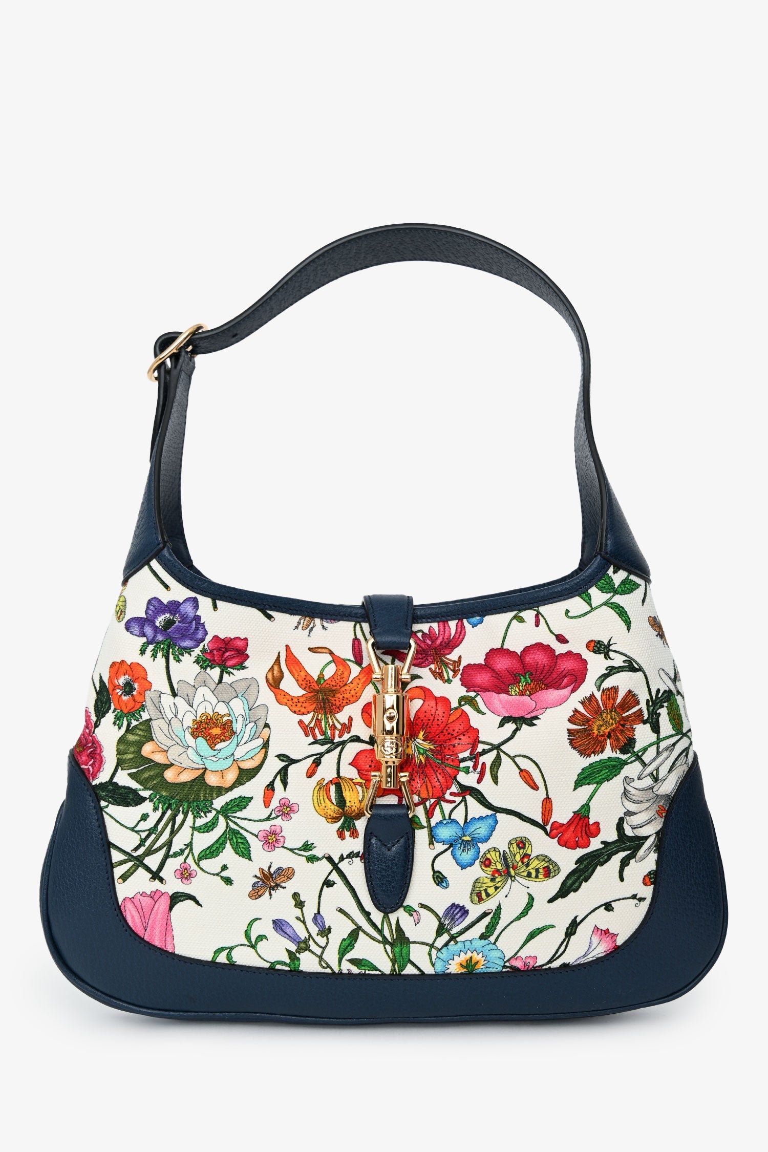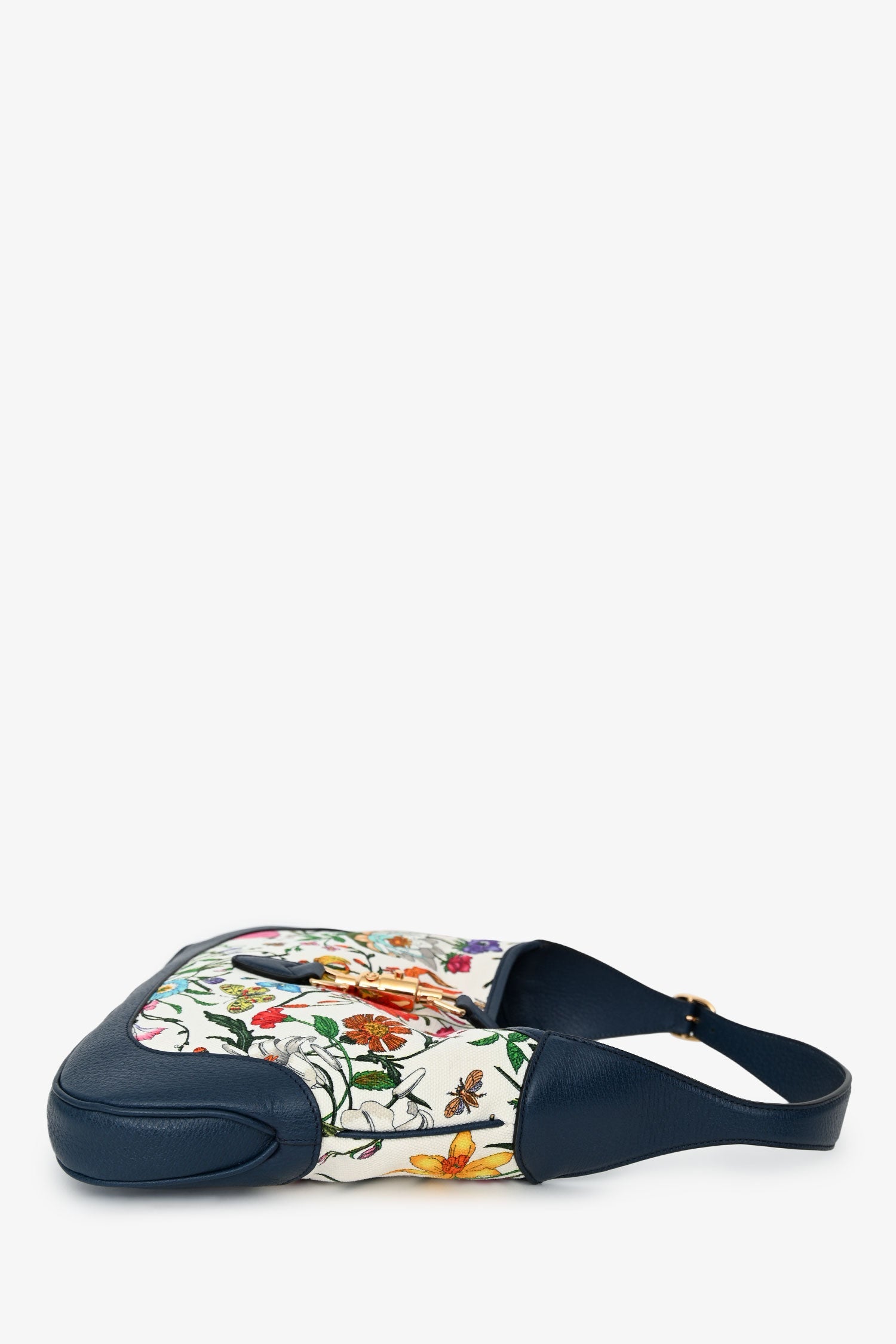 Gucci Blue/Cream Leather/Canvas Floral Horsebit Jackie Shoulder Bag. Front fold-over strap with a push lock closure. Adjustable shoulder strap. Lined canvas interior with 2 card slots and 1 zip. Gold-tone hardware. Tonal stitching.