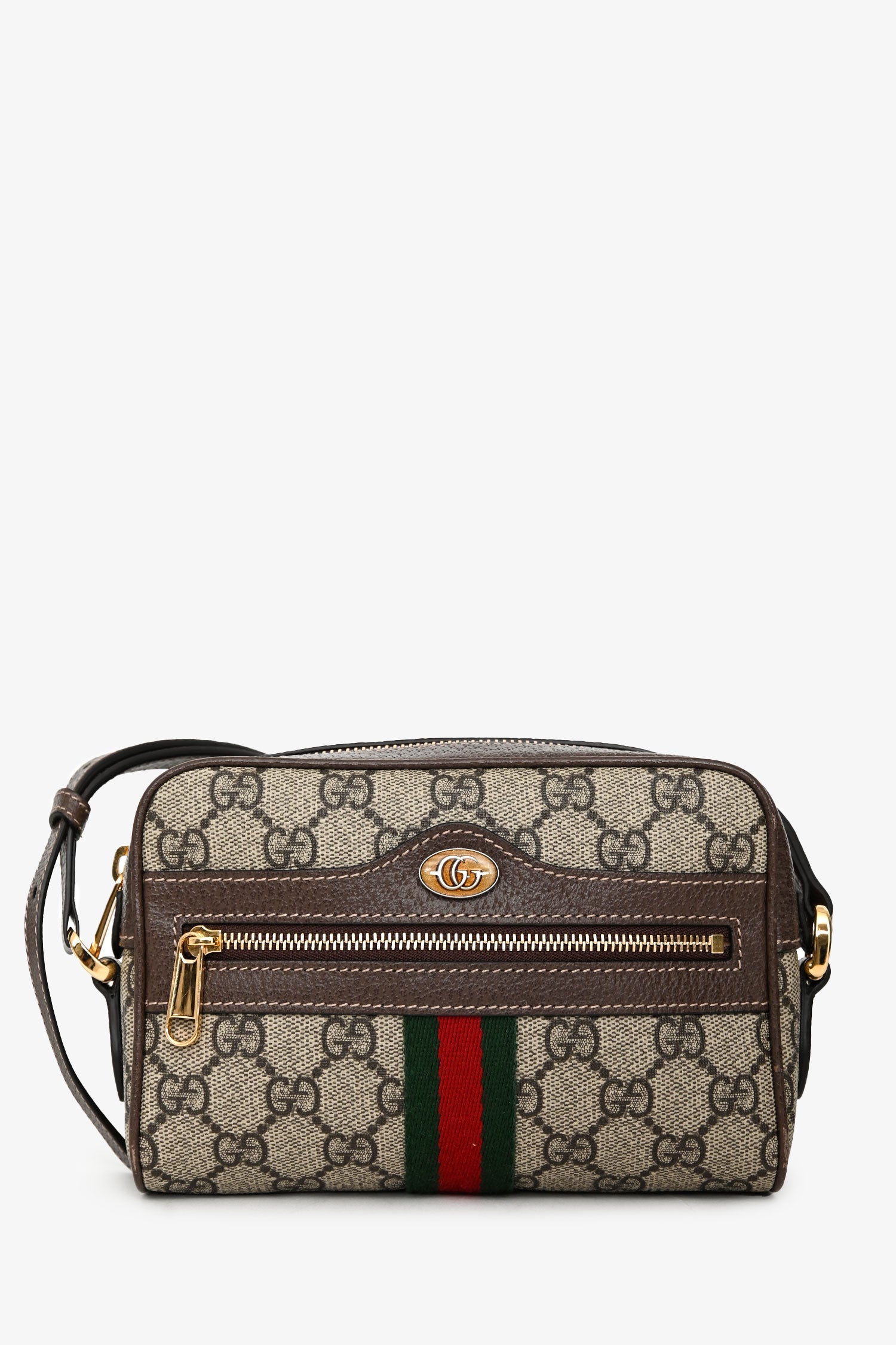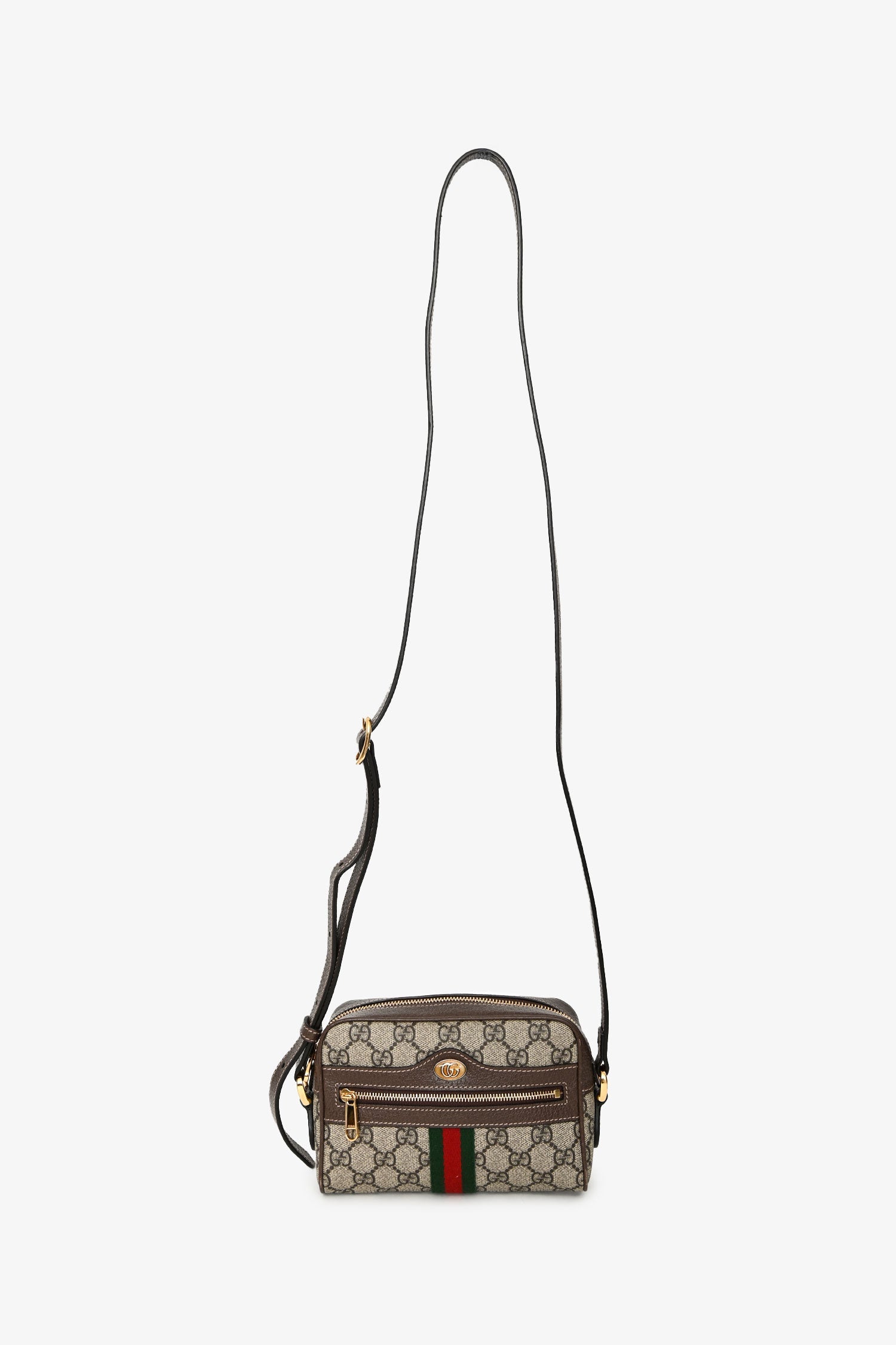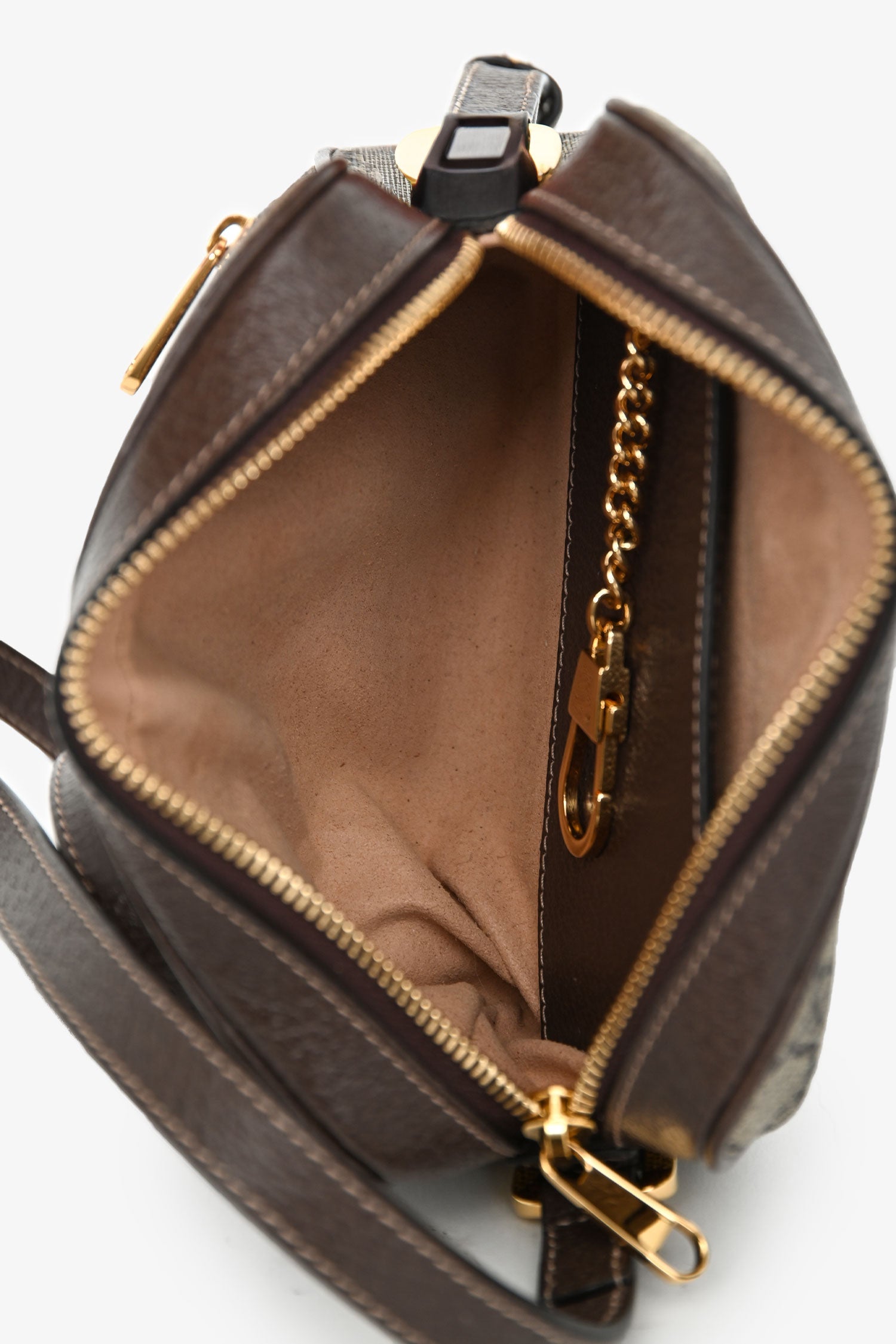 Gucci Brown GG Supreme Ophidia Mini Crossbody Bag. Top zip closure. Adjustable crossbody strap. 1 exterior zip pocket; 1 interior slip pocket. Interior chain detail with lobster clasp. Gold-tone hardware. Contrast stitching.