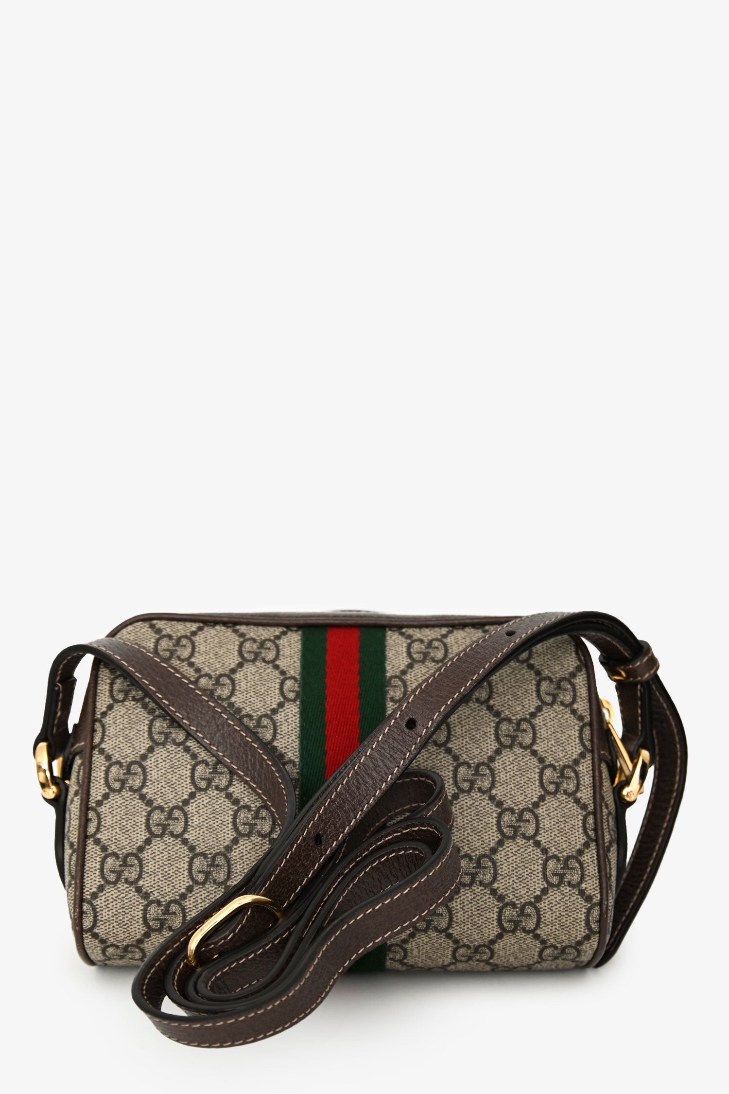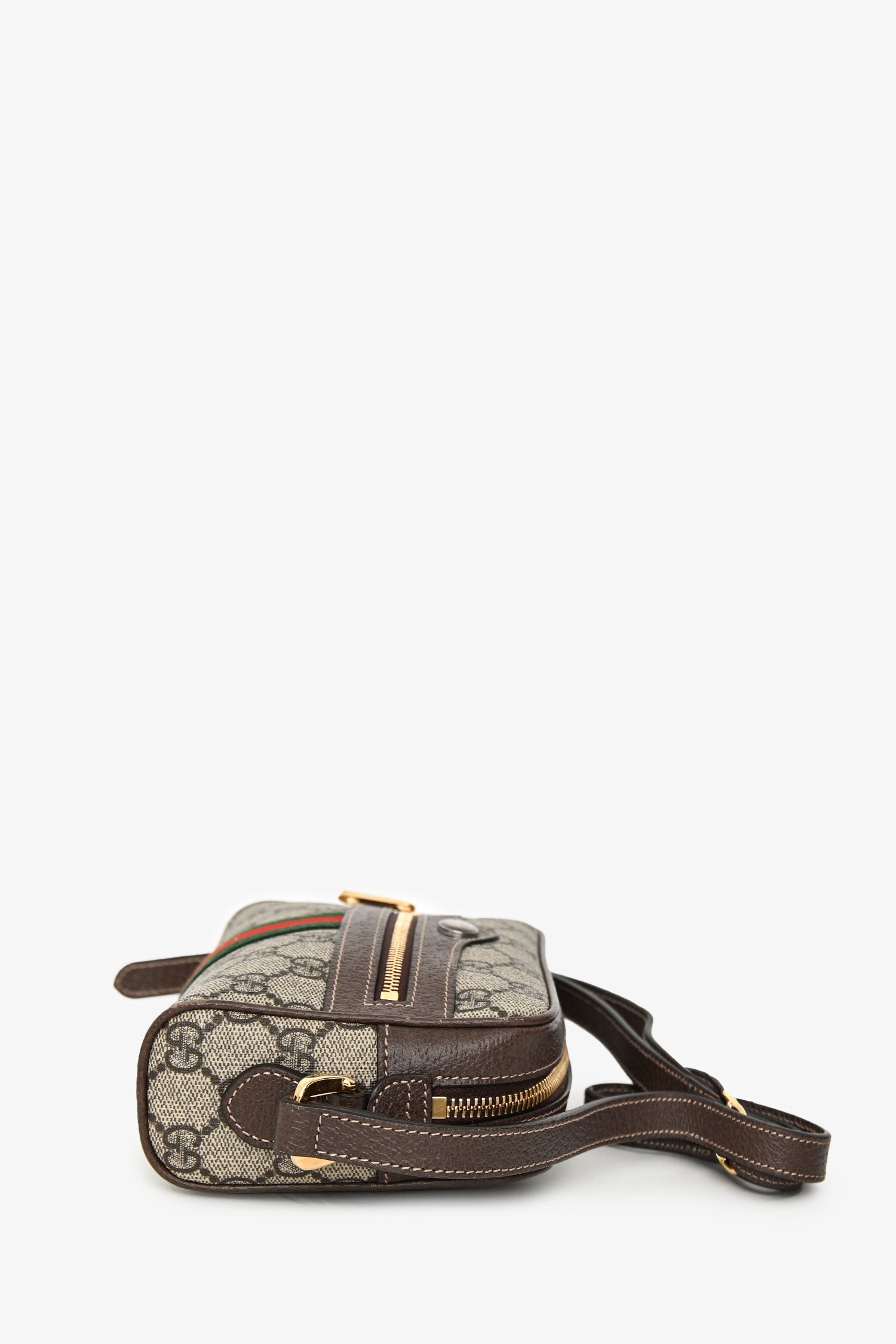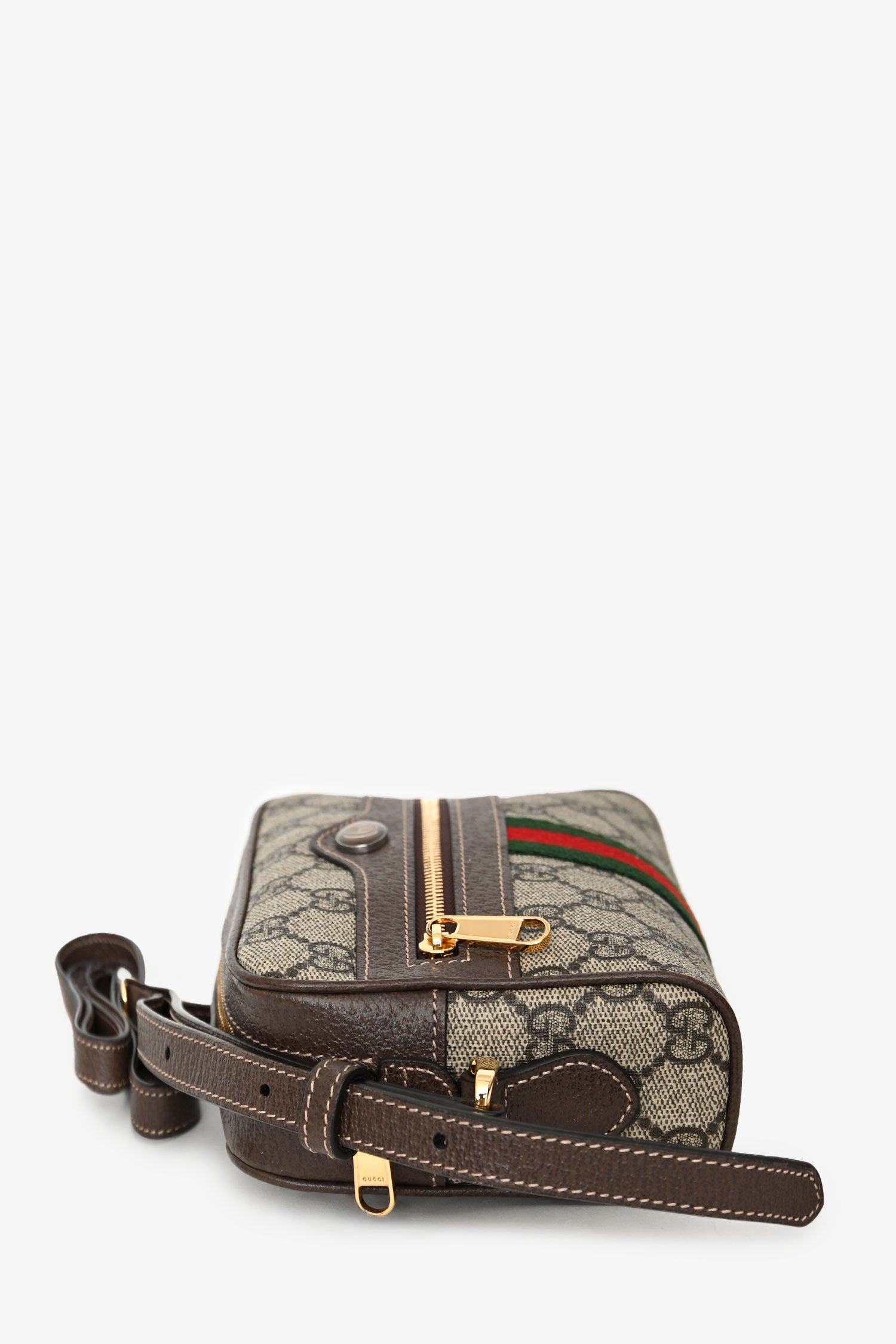 Gucci Brown GG Supreme Ophidia Mini Crossbody Bag. Top zip closure. Adjustable crossbody strap. 1 exterior zip pocket; 1 interior slip pocket. Interior chain detail with lobster clasp. Gold-tone hardware. Contrast stitching.