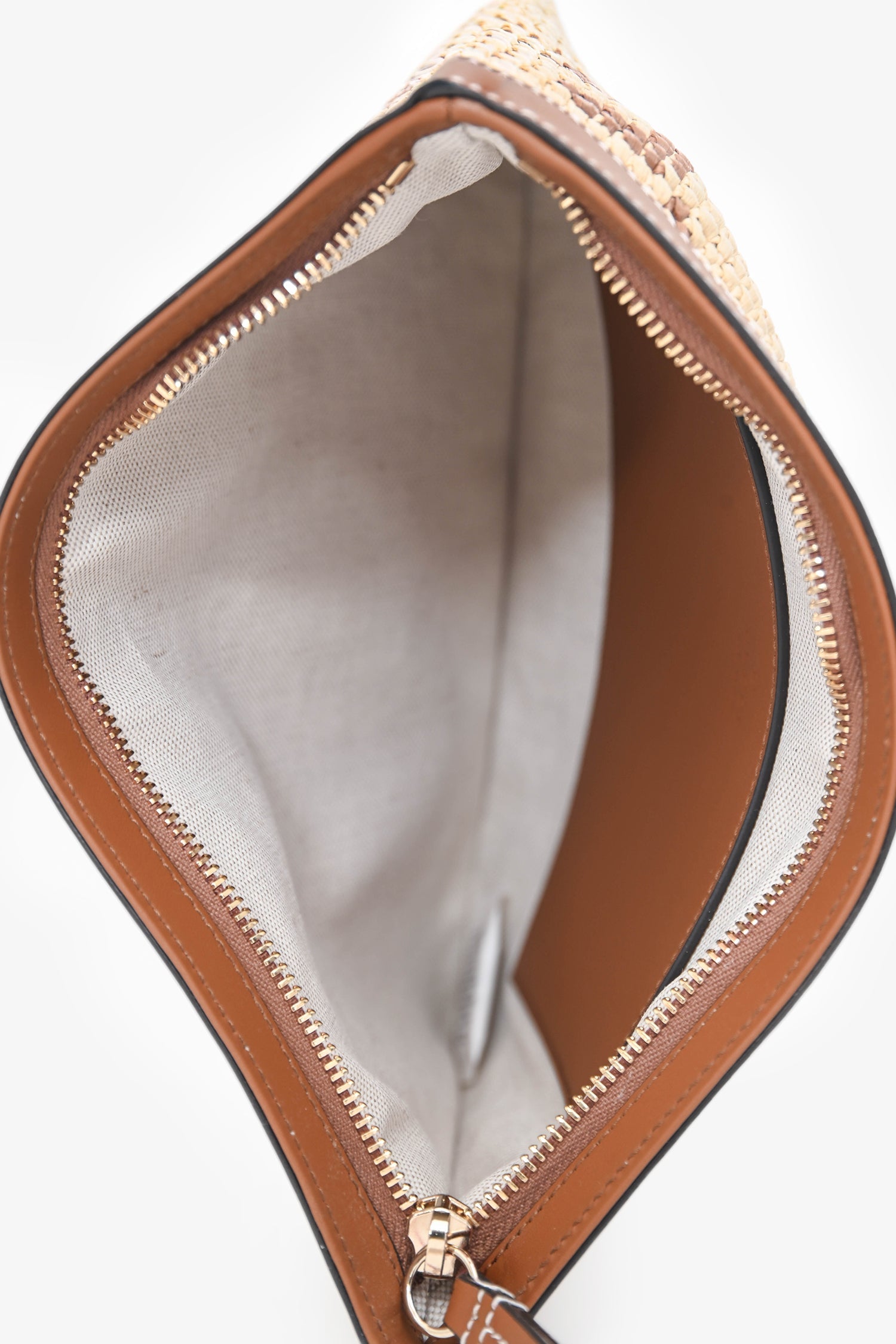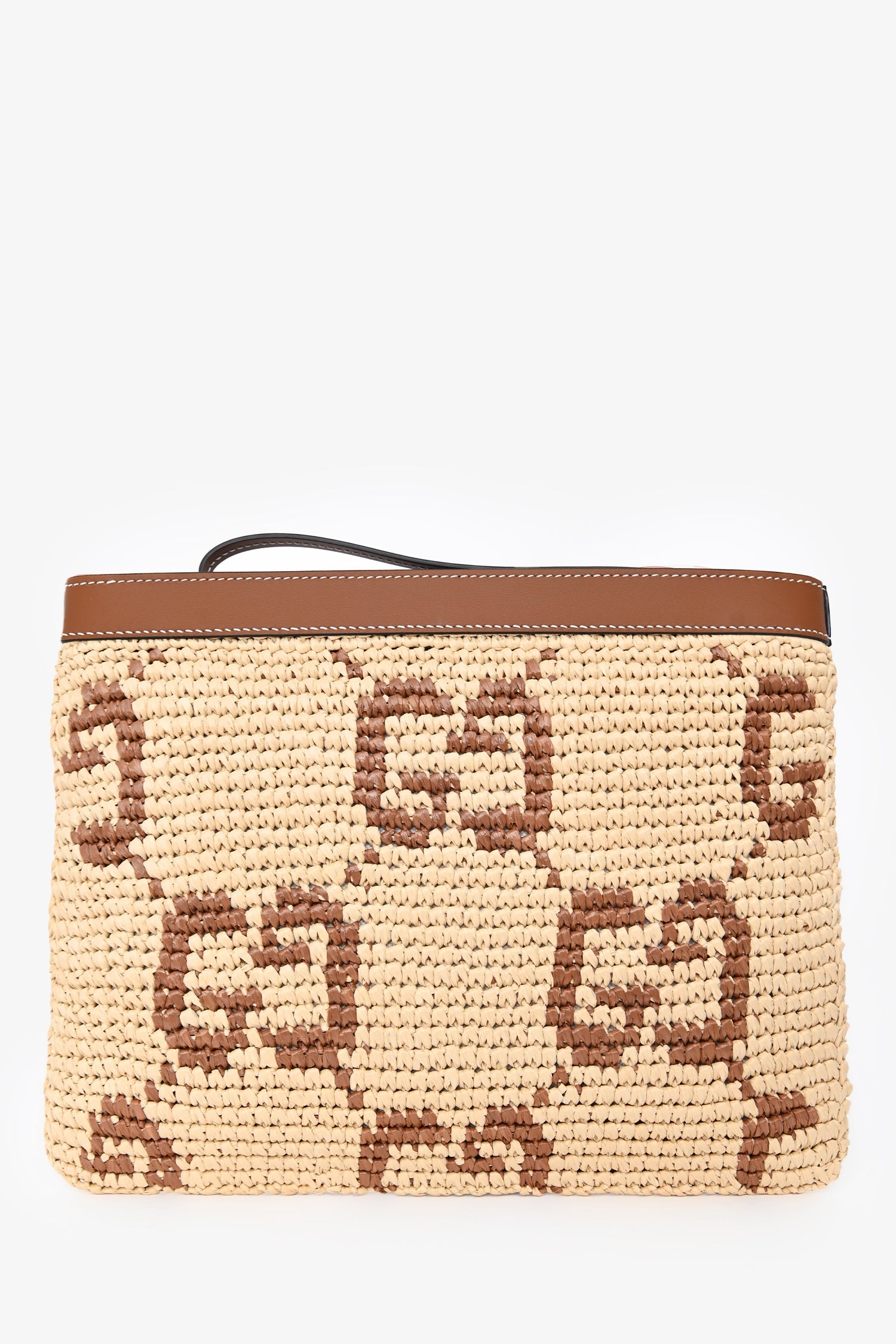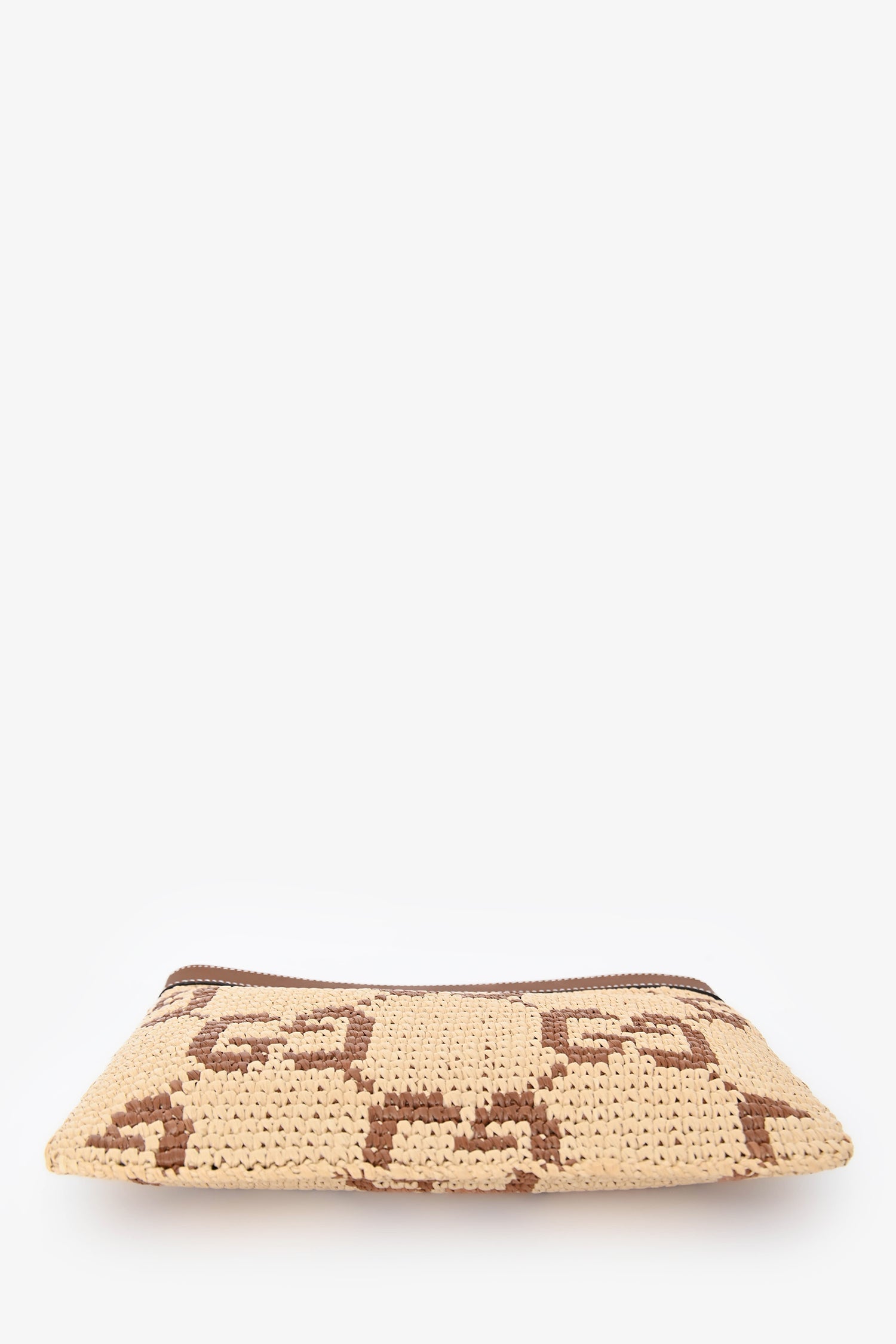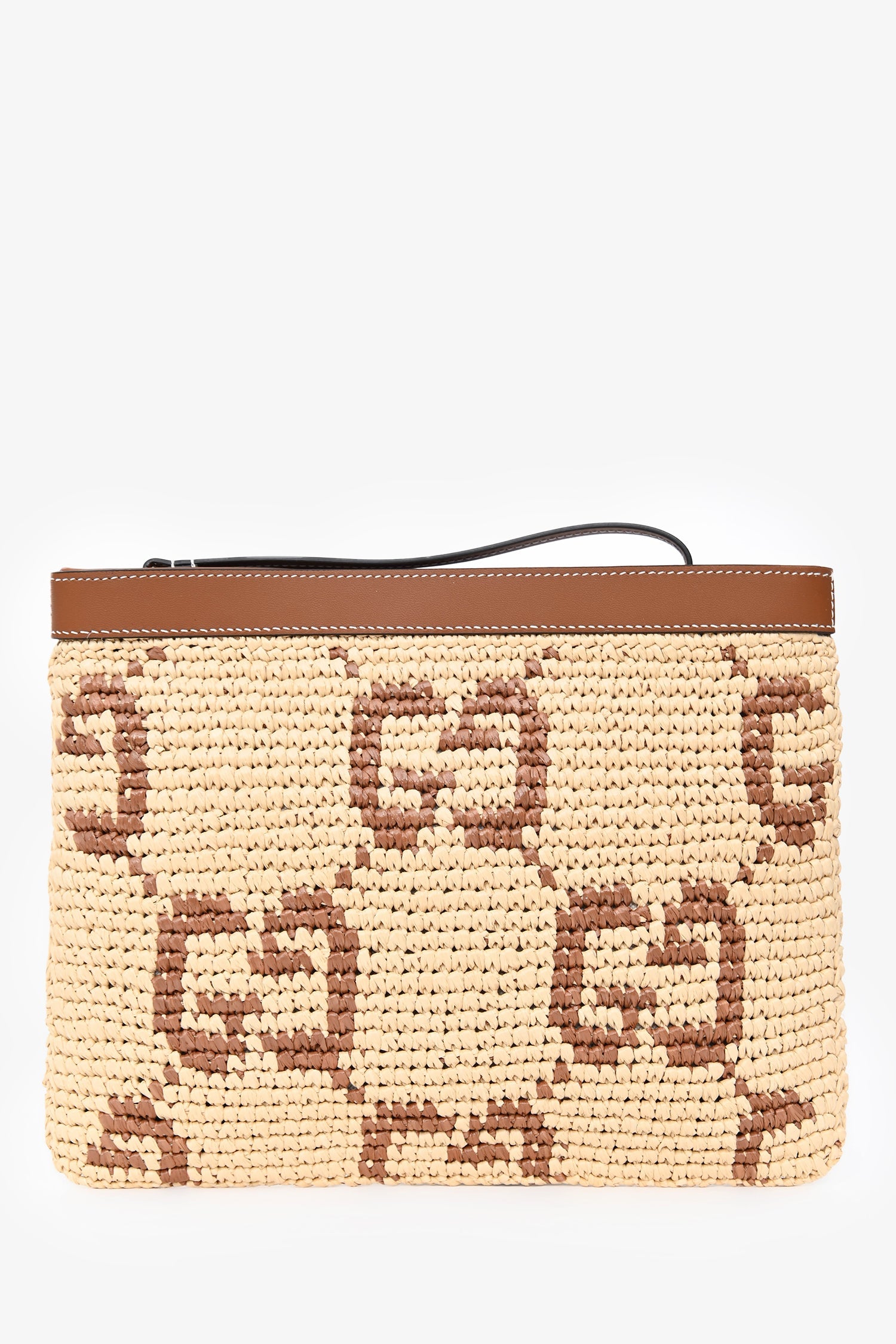 Gucci Brown Raffia Monogram Leather Trim Large Zip Wristlet. Top zip closure. Attached wristlet. Single interior wall slip pocket. Fabric-lined interior. Gold-tone hardware. Contrast stitching.
