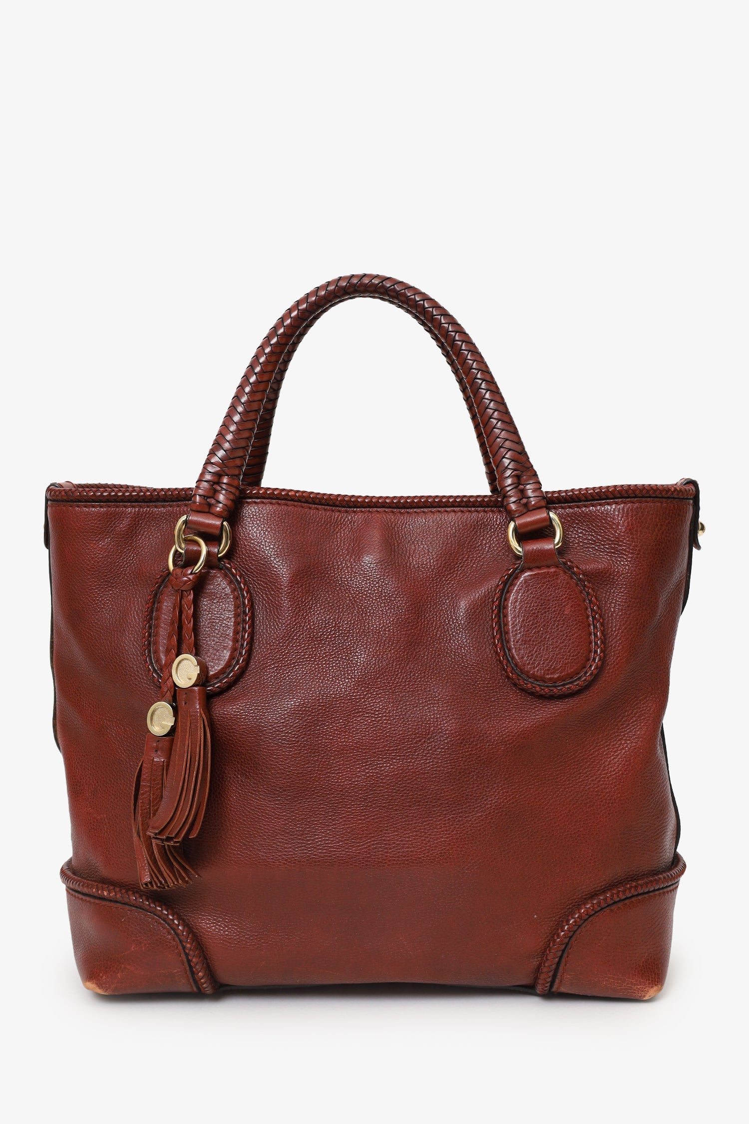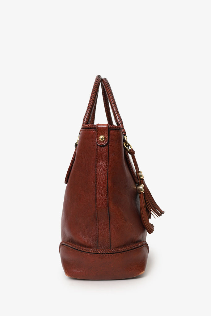 Gucci Dark Red Leather Tassle Detail Bag. Top interior lobster clasp closure. Twin handles. Protective base studs. Canvas-lined interior. 3 interior pockets; 2 slip and 1 zip. Gold-tone hardware. Tonal stitching.