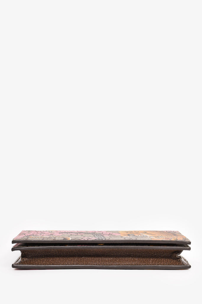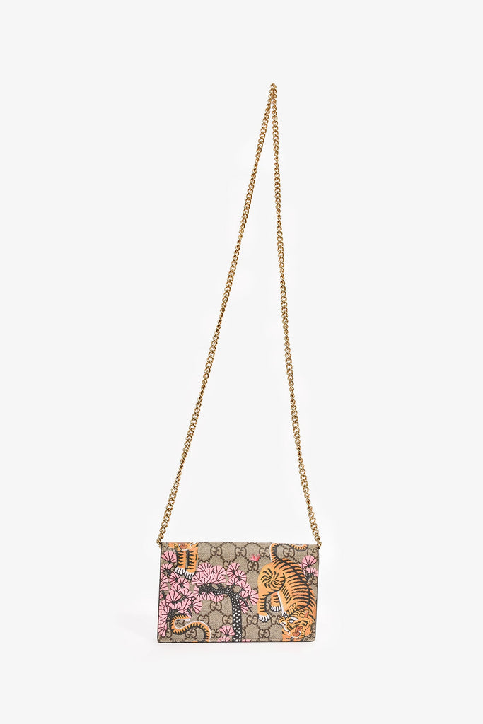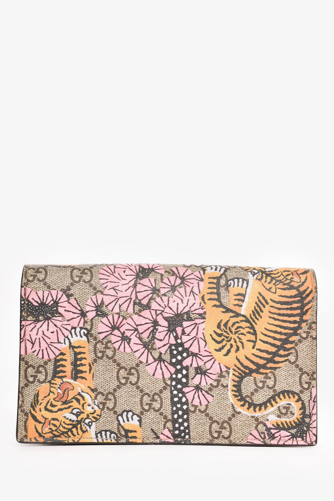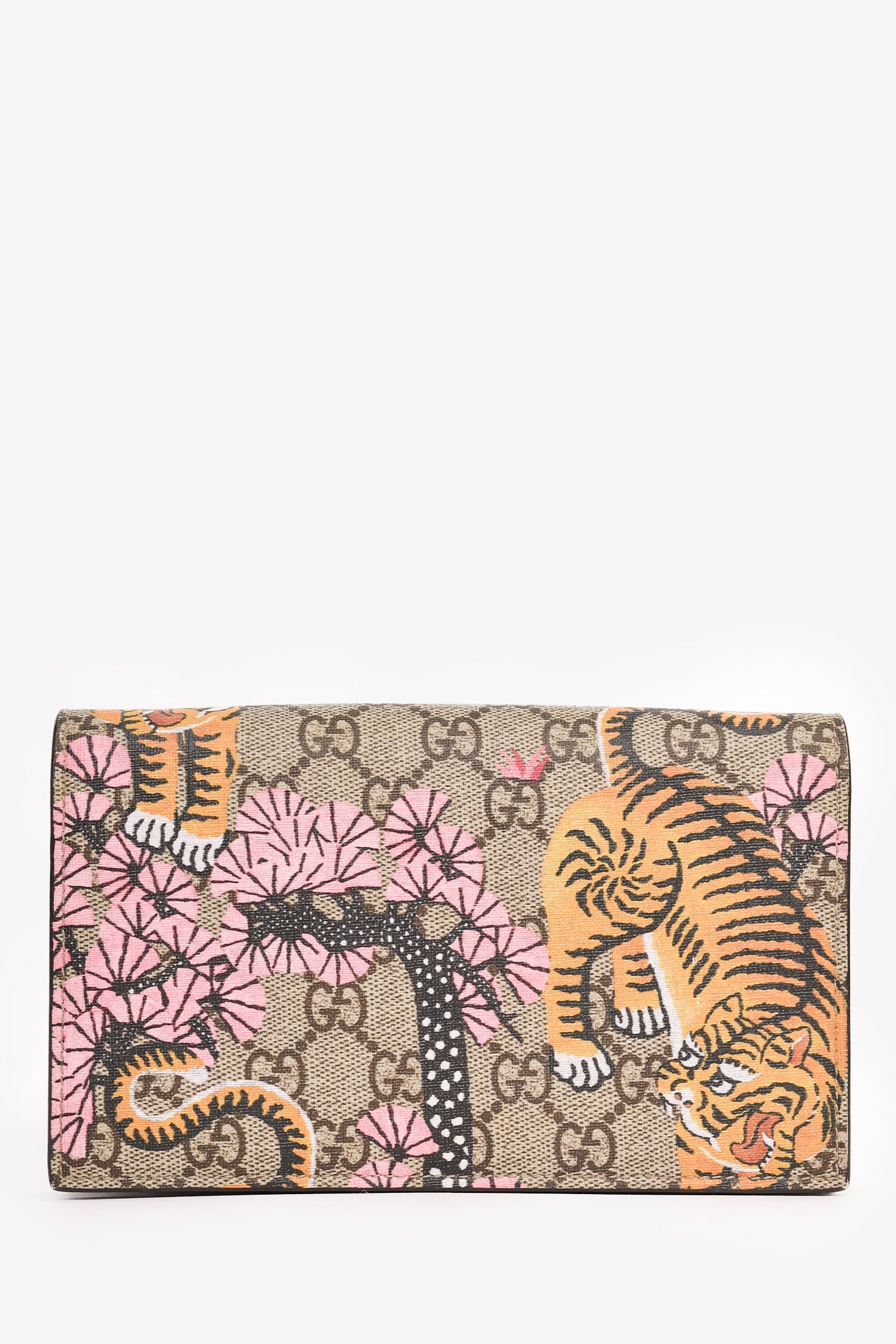 Gucci GG Supreme Bengal Wallet on Chain. Front fold-over flap with snap-button closure. Dark brown leather interior. Eighteen card slots. One zippered compartment. Detachable chain strap (not adjustable). Gold-tone hardware.