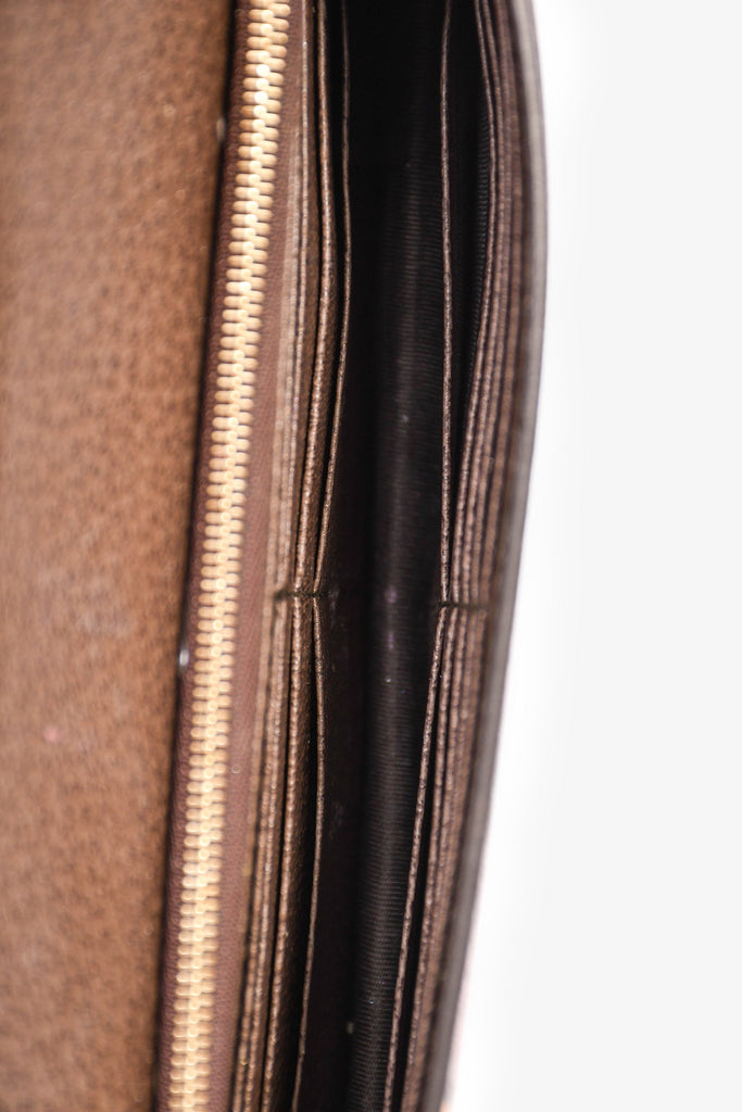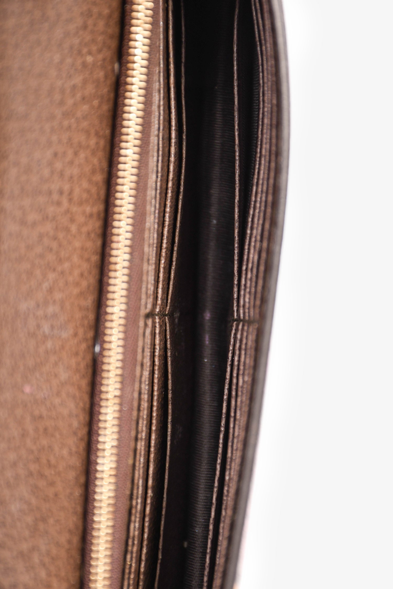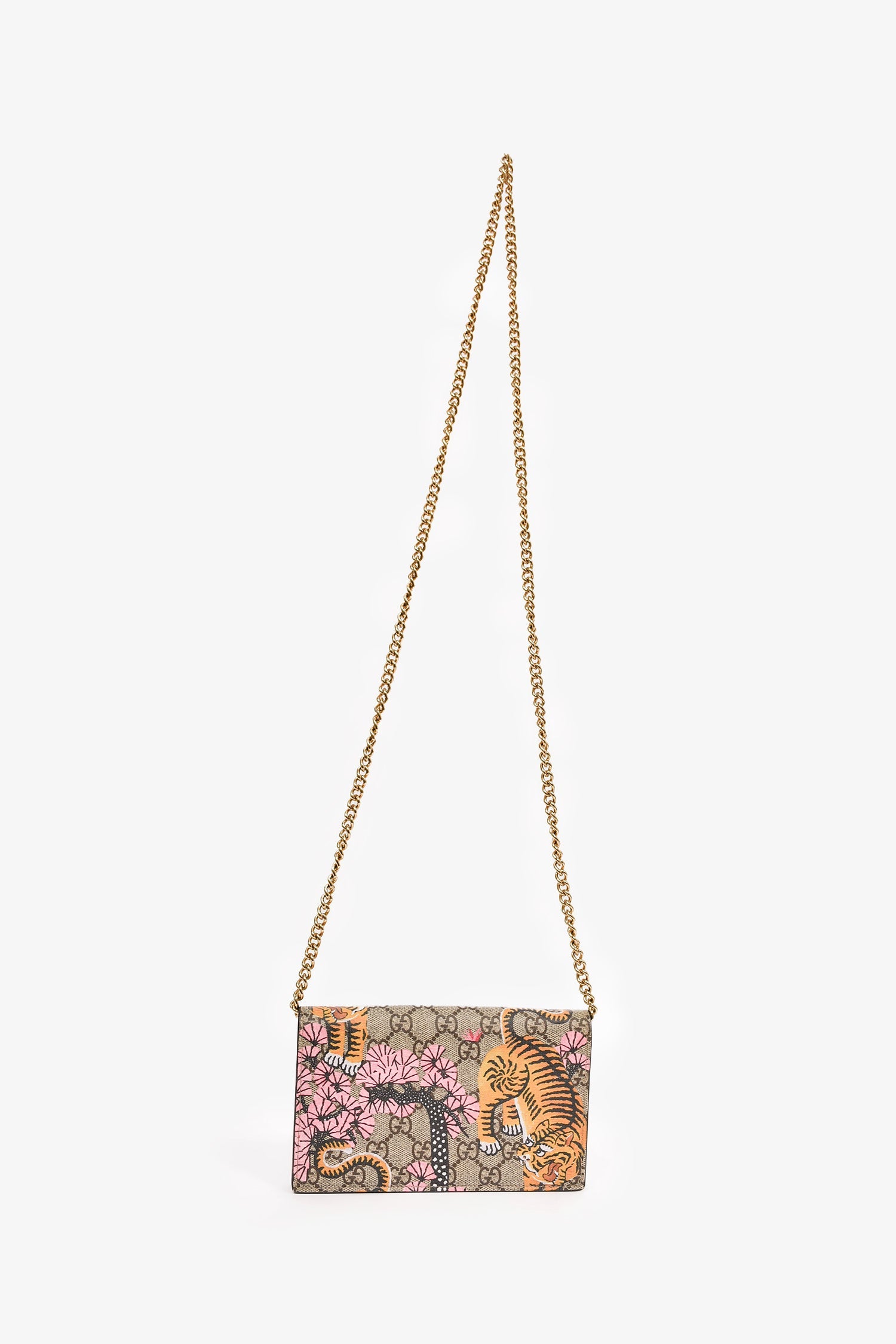 Gucci GG Supreme Bengal Wallet on Chain. Front fold-over flap with snap-button closure. Dark brown leather interior. Eighteen card slots. One zippered compartment. Detachable chain strap (not adjustable). Gold-tone hardware.