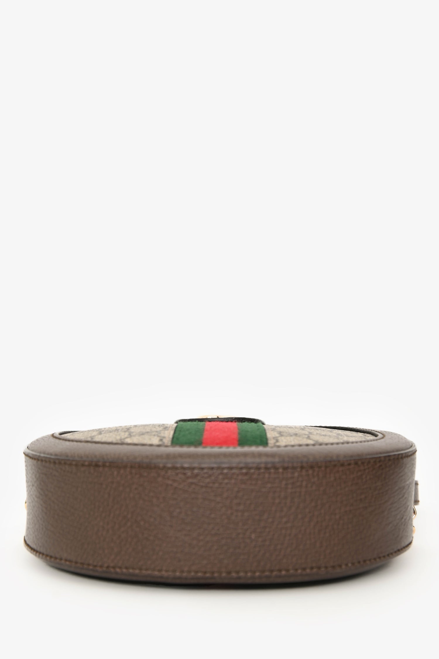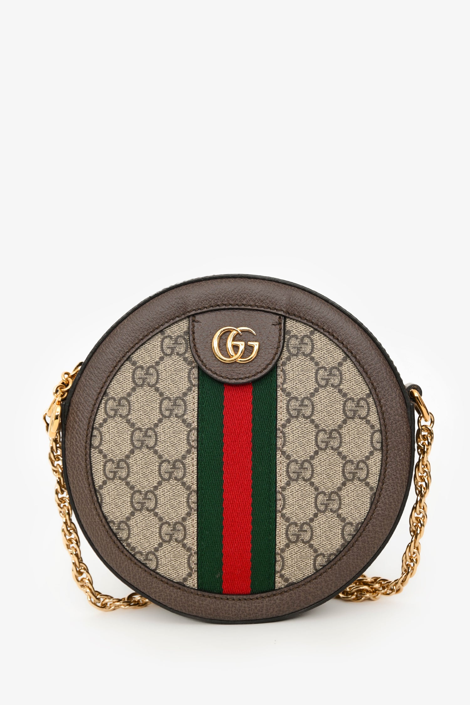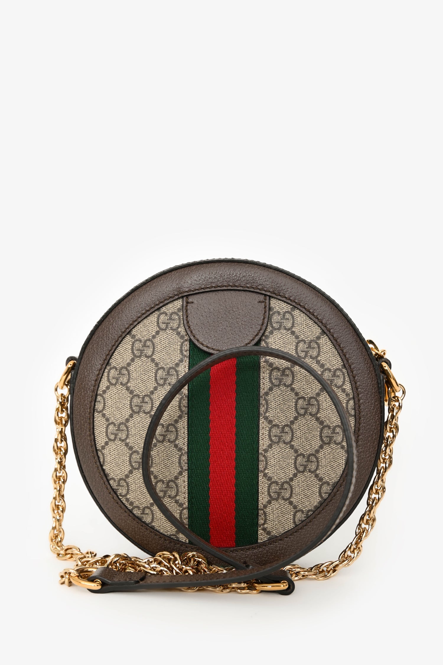 Gucci GG Supreme Web Ophidia Round Bag. Top zip closure. Chain-link and leather crossbody strap. Lined suede interior. Gold-tone hardware. Tonal stitching.
