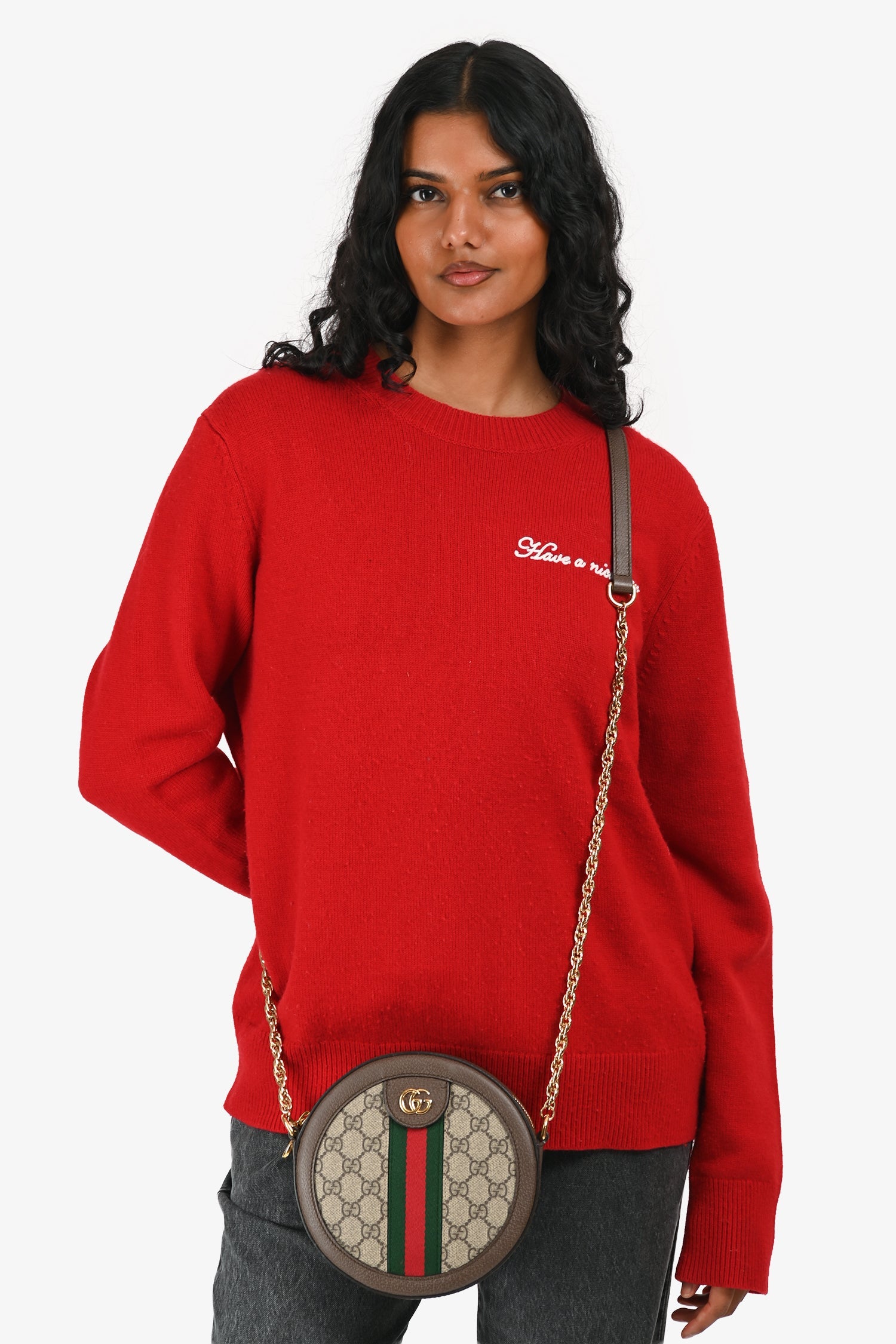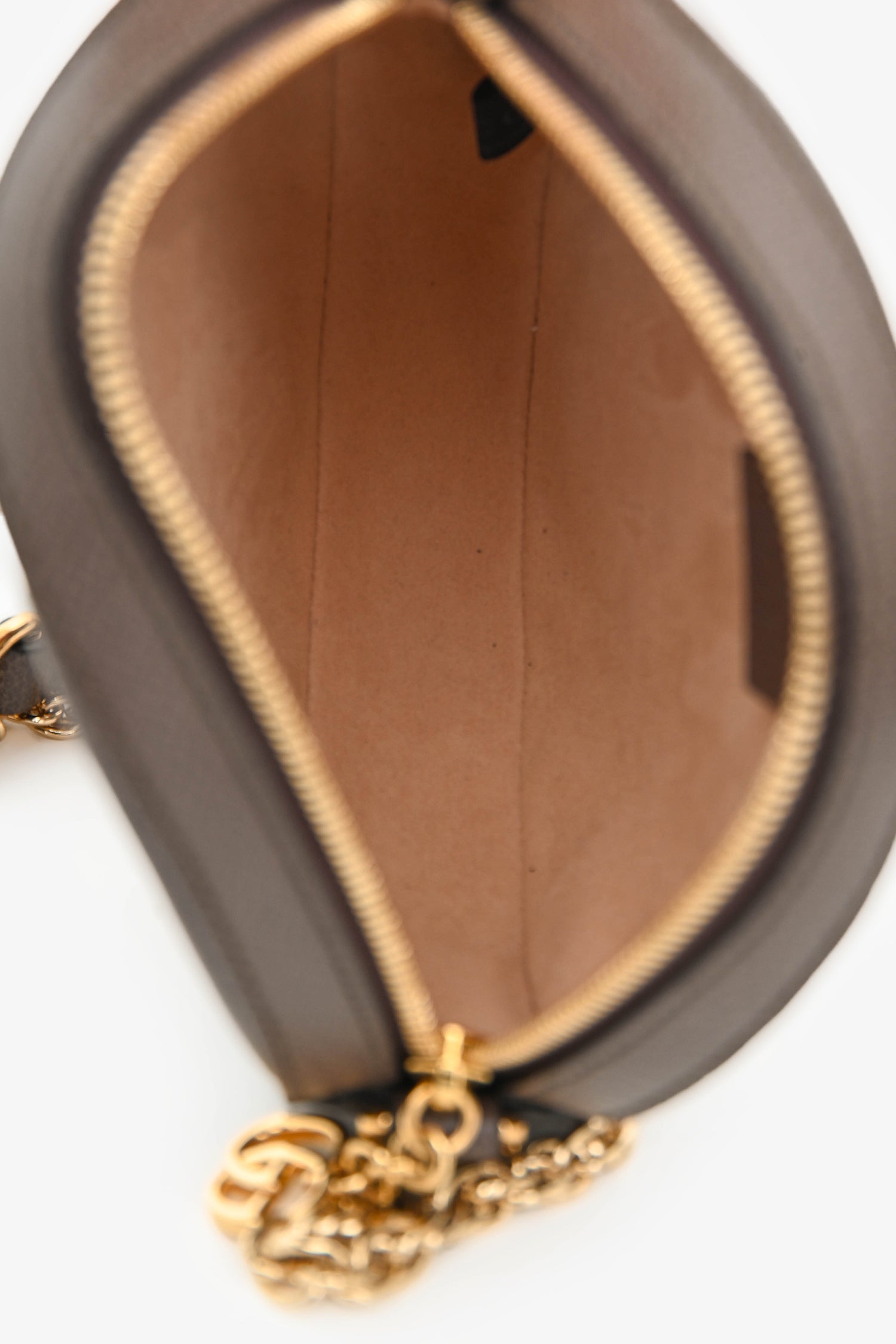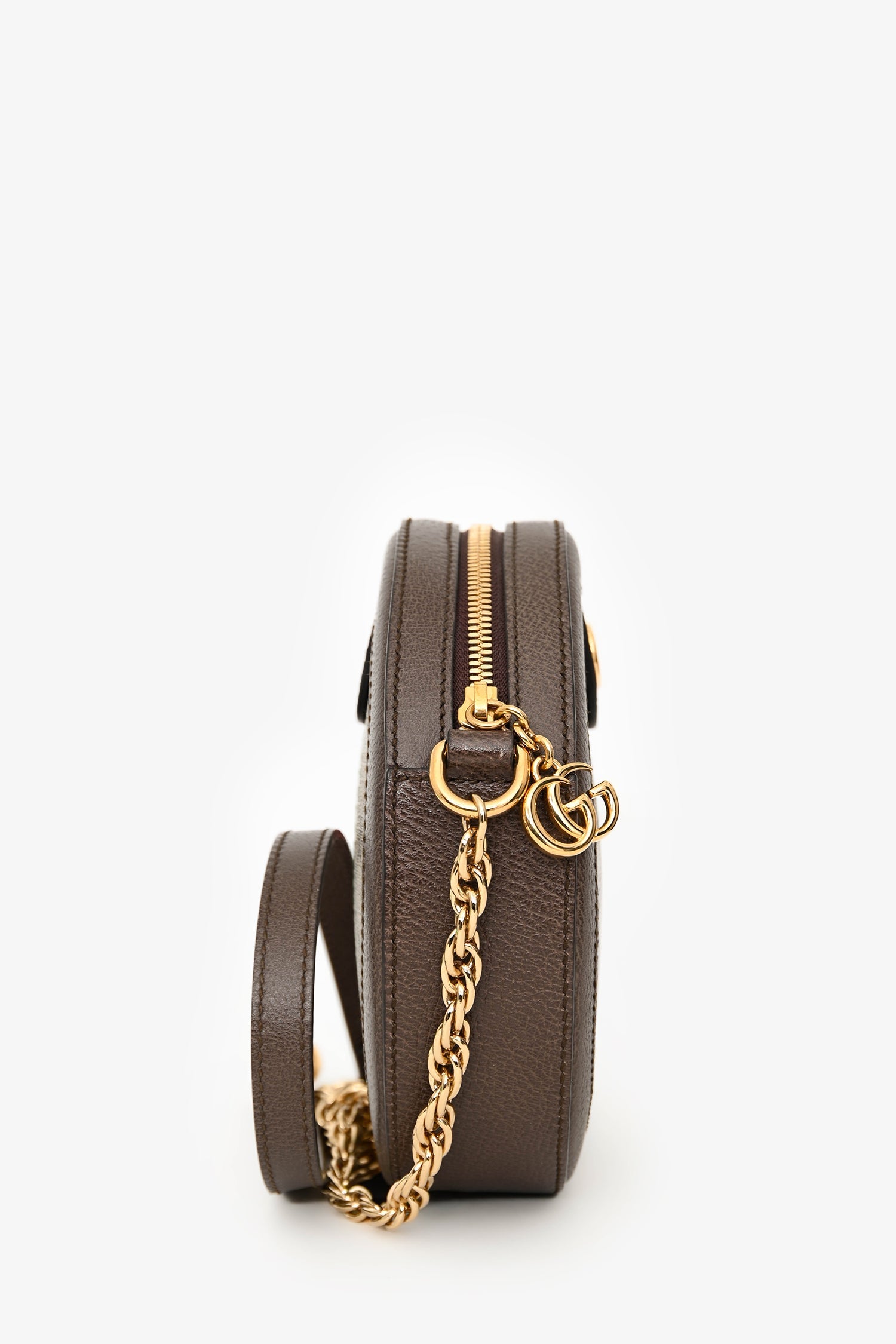 Gucci GG Supreme Web Ophidia Round Bag. Top zip closure. Chain-link and leather crossbody strap. Lined suede interior. Gold-tone hardware. Tonal stitching.