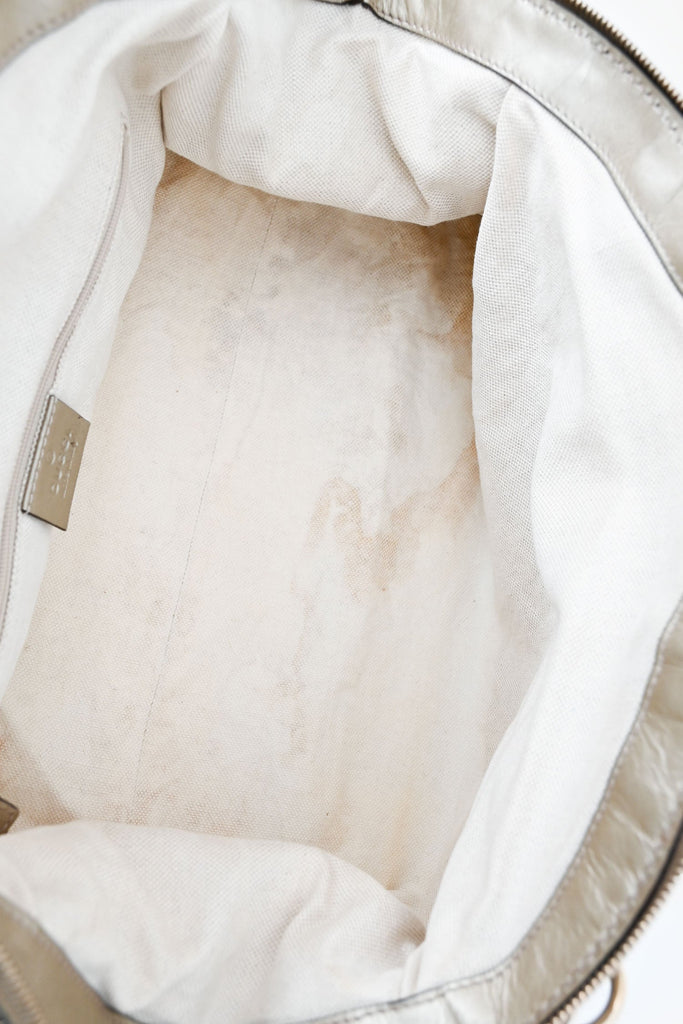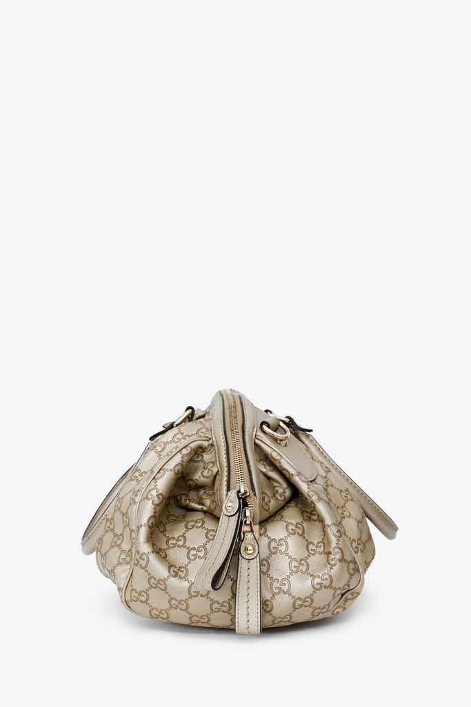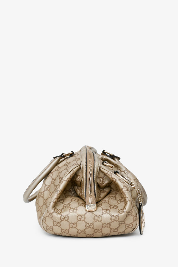 Gucci Gold Leather Guccisimma Sukey Shoulder Bag. Dual top handles. Top zip closure. Detachable strap. Lined interior. Single interior wall zip pocket. Detachable charm. Gold-tone hardware. Tonal stitching.