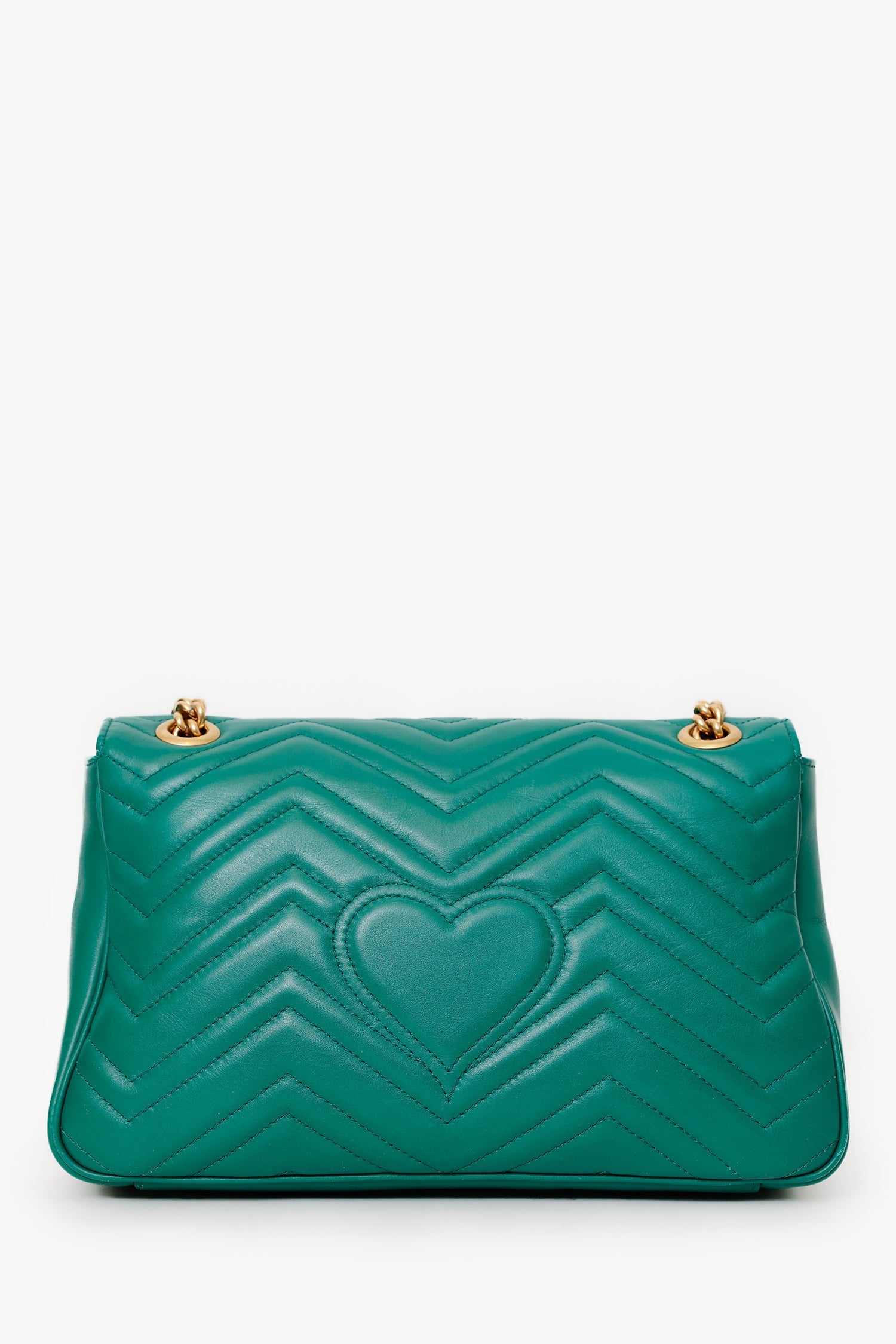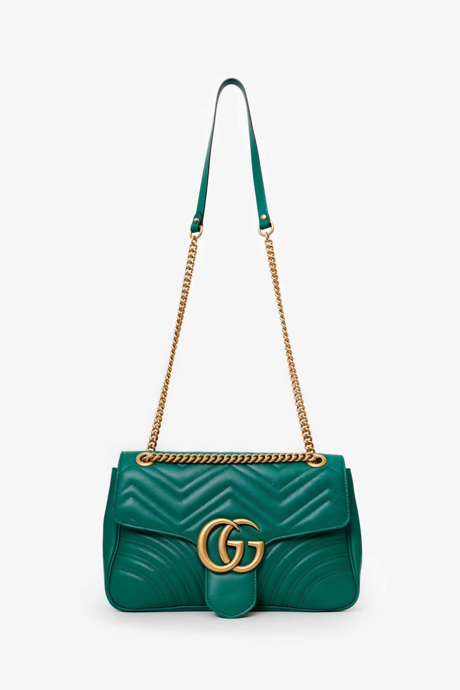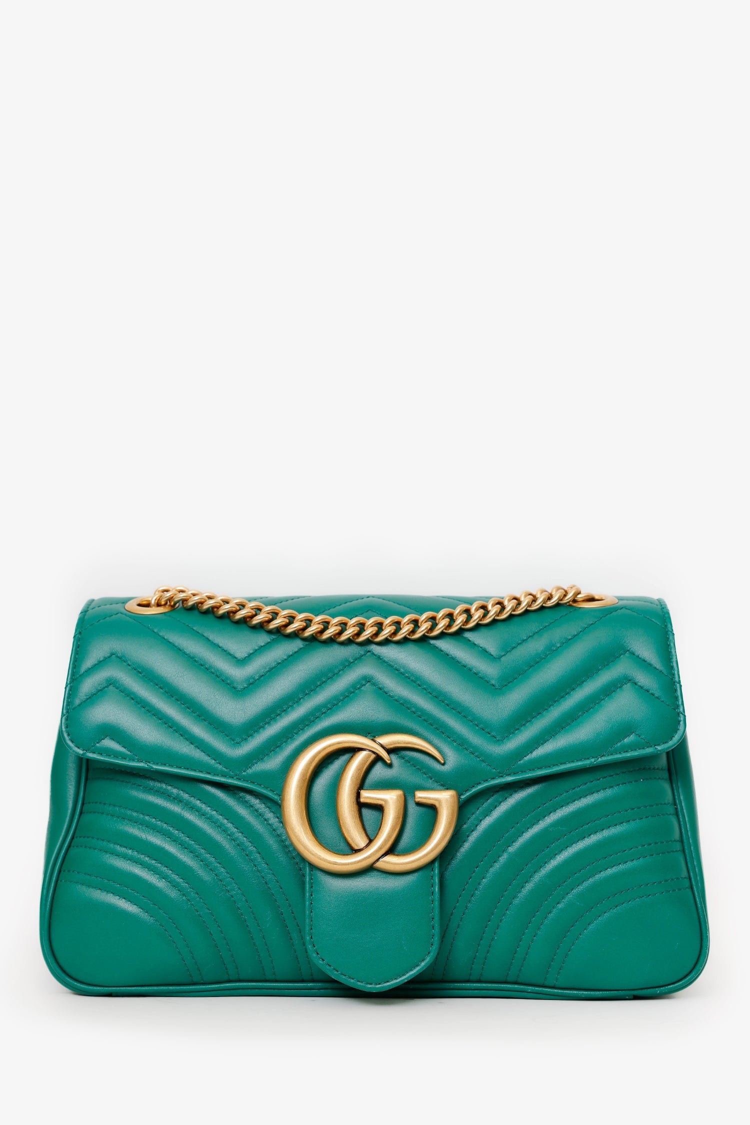 Gucci Green Chevron Leather Medium Marmont Shoulder Bag. Front fold-over flap with button-up closure. Twin chainlink and leather shoulder straps that can be pulled in and extended to one long strap. Lined interior. 2 interior pockets; 1 front wall slip and 1 rear wall with zip closure. Gold-tone hardware. Tonal stitching.