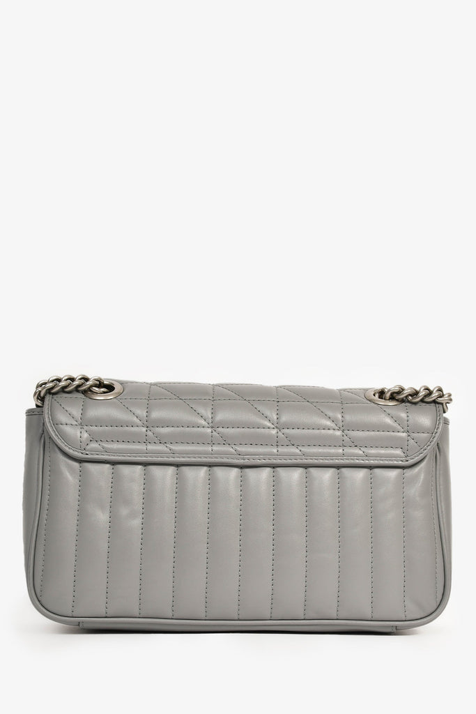 Gucci Grey GG Marmont Matelasse Aria Medium Shoulder Bag. Front fold-over flap with push-lock closure. Beige suede interior lining. Single interior wall zip pocket. Slide-around chain. Silver-tone hardware.