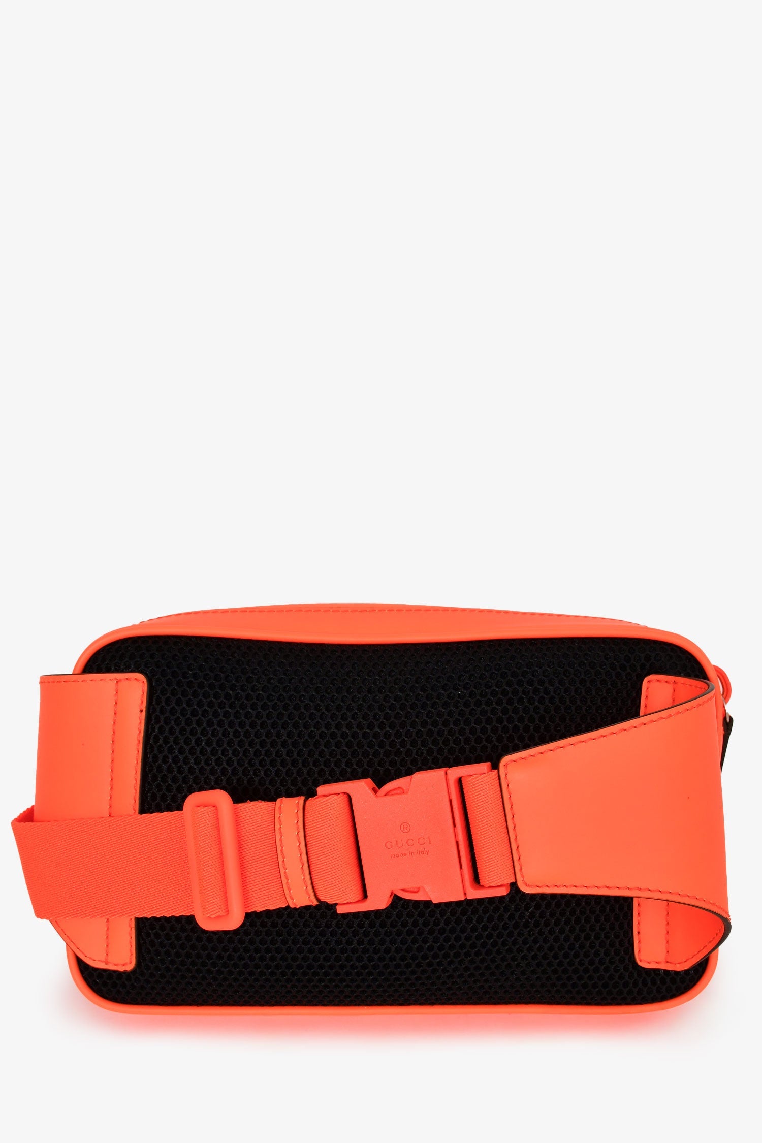 Gucci Neon Orange Leather GG Marmont Belt Bag. Zip-around closure. Front exterior zipped pocket. Single interior zipped pocket. Adjustable belt strap and buckle closure. Tonal stitching.