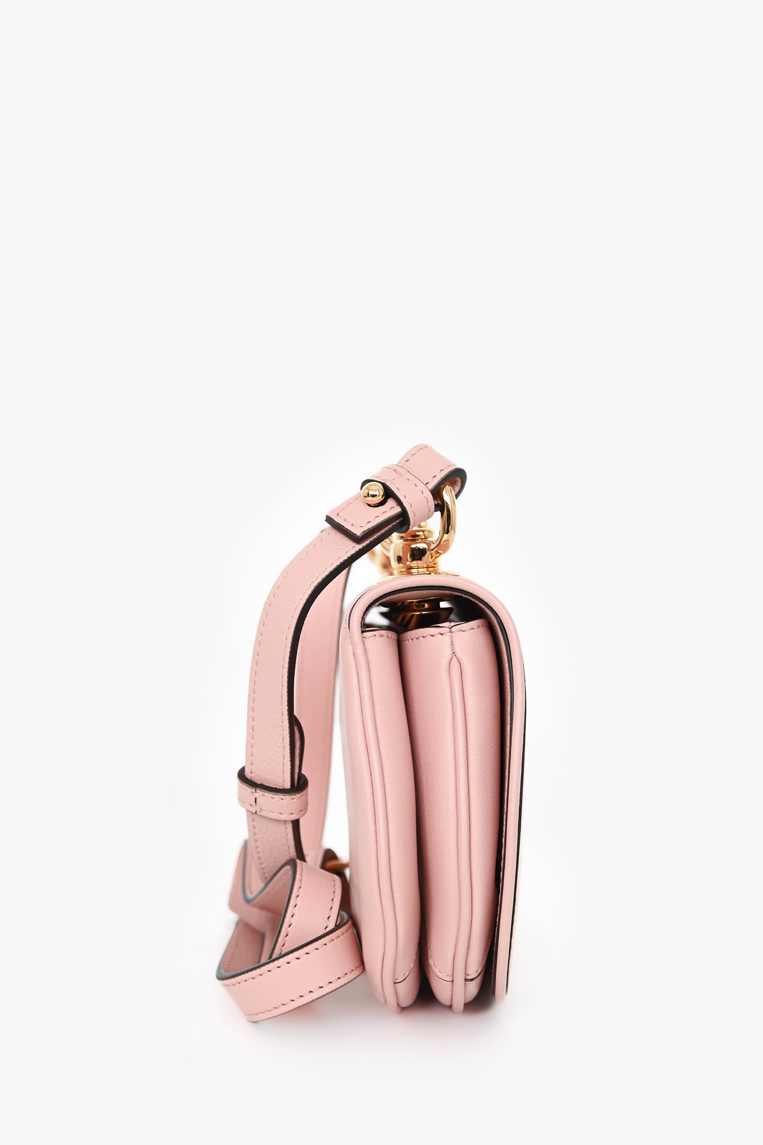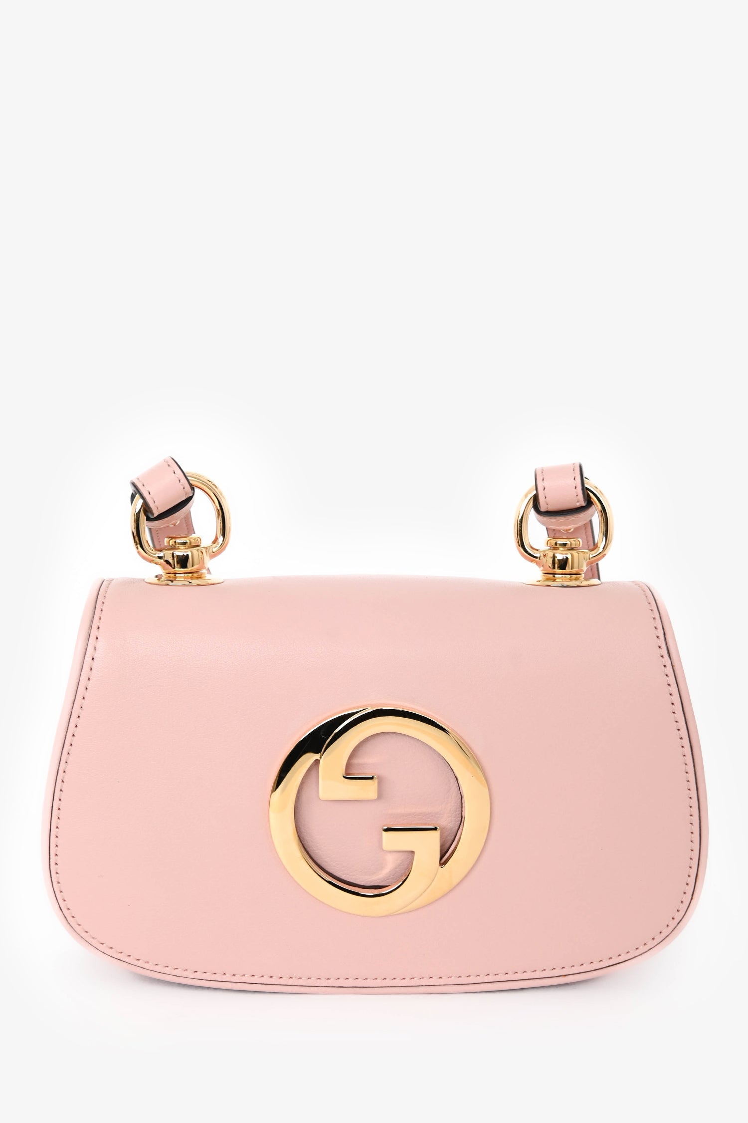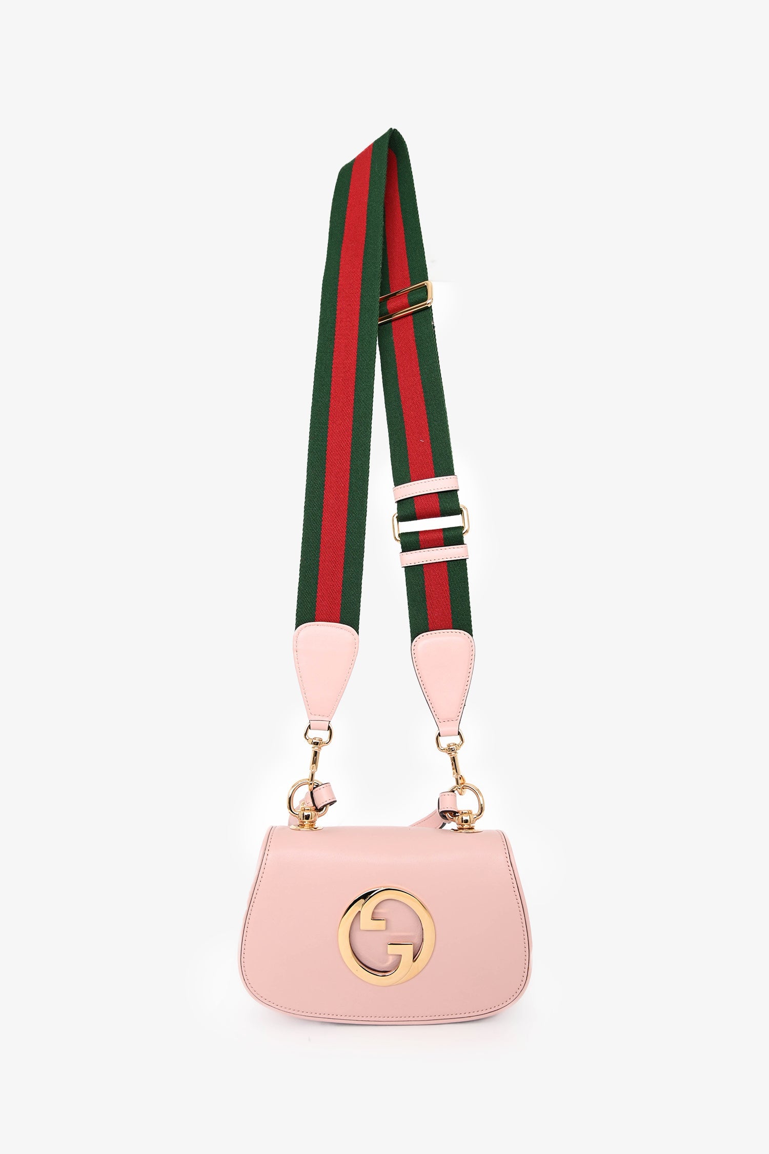 Gucci Pink Leather Mini 'Blondie' Crossbody Bag with Web Canvas Strap. Front fold-over flap with magnetic closure. 2 adjustable and detachable crossbody straps. Leather-lined interior. 2 interior compartments. Single wall slip pocket. Gold-tone hardware. Tonal stitching.