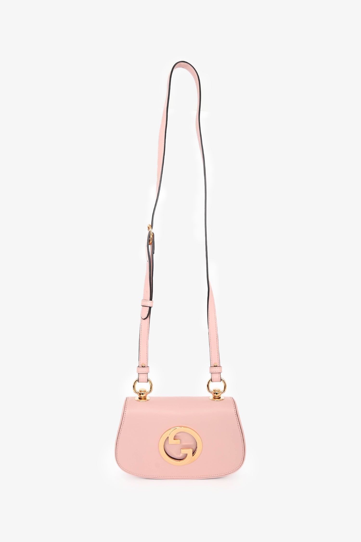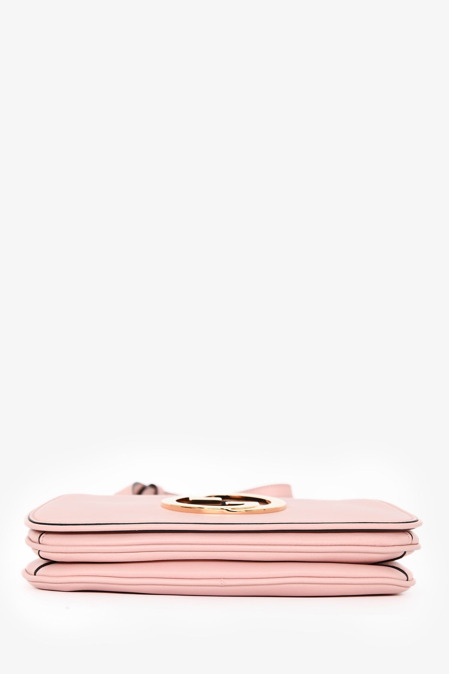 Gucci Pink Leather Mini 'Blondie' Crossbody Bag with Web Canvas Strap. Front fold-over flap with magnetic closure. 2 adjustable and detachable crossbody straps. Leather-lined interior. 2 interior compartments. Single wall slip pocket. Gold-tone hardware. Tonal stitching.