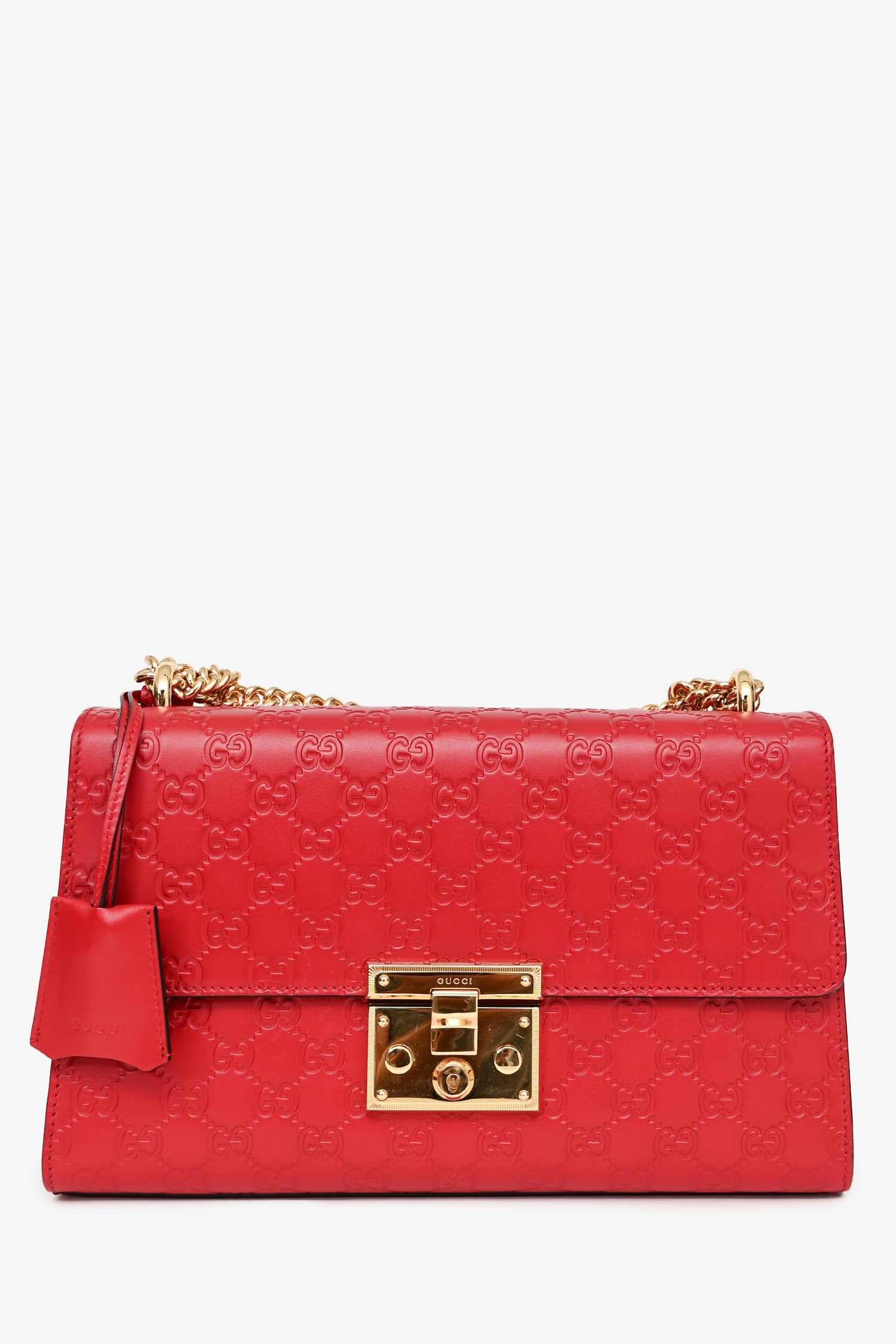 Gucci Red Leather Guccissima Medium Padlock Shoulder Bag. Flap closure with gold-tone padlock clasp. Sliding chain strap can be worn doubled or long. Suede-lined interior with a zipped and slip pockets. Single exterior back slip pocket. Gold-tone hardware. Tonal stitching.