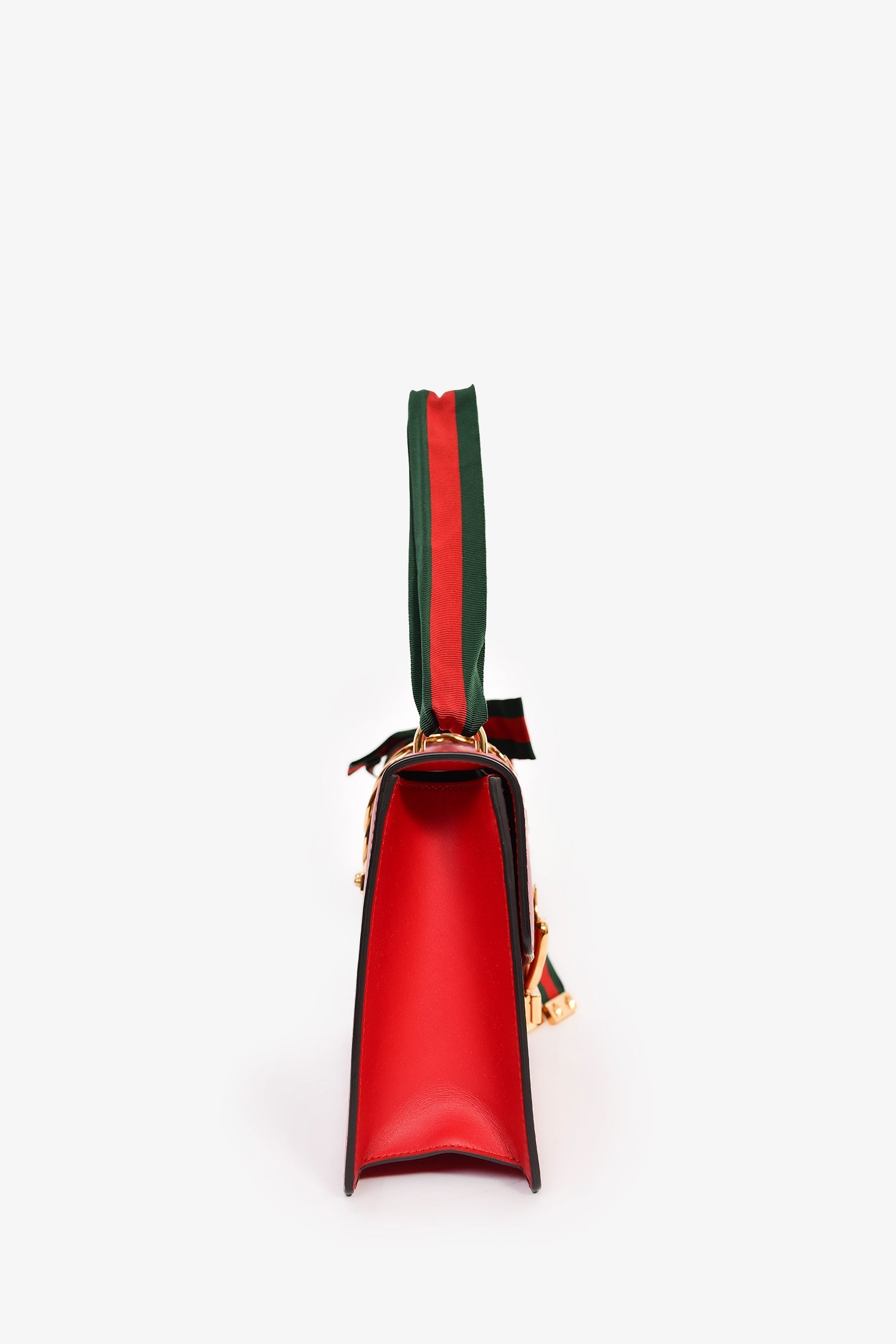 Gucci Red Leather Web Sylvie Small Ribbon Shoulder Bag. Fold-over flap with a flip-lock closure. Gold-tone hardware. Suede lined interior with a zipped compartment and slip pocket. Webbed tie straps. Tonal stitching.
