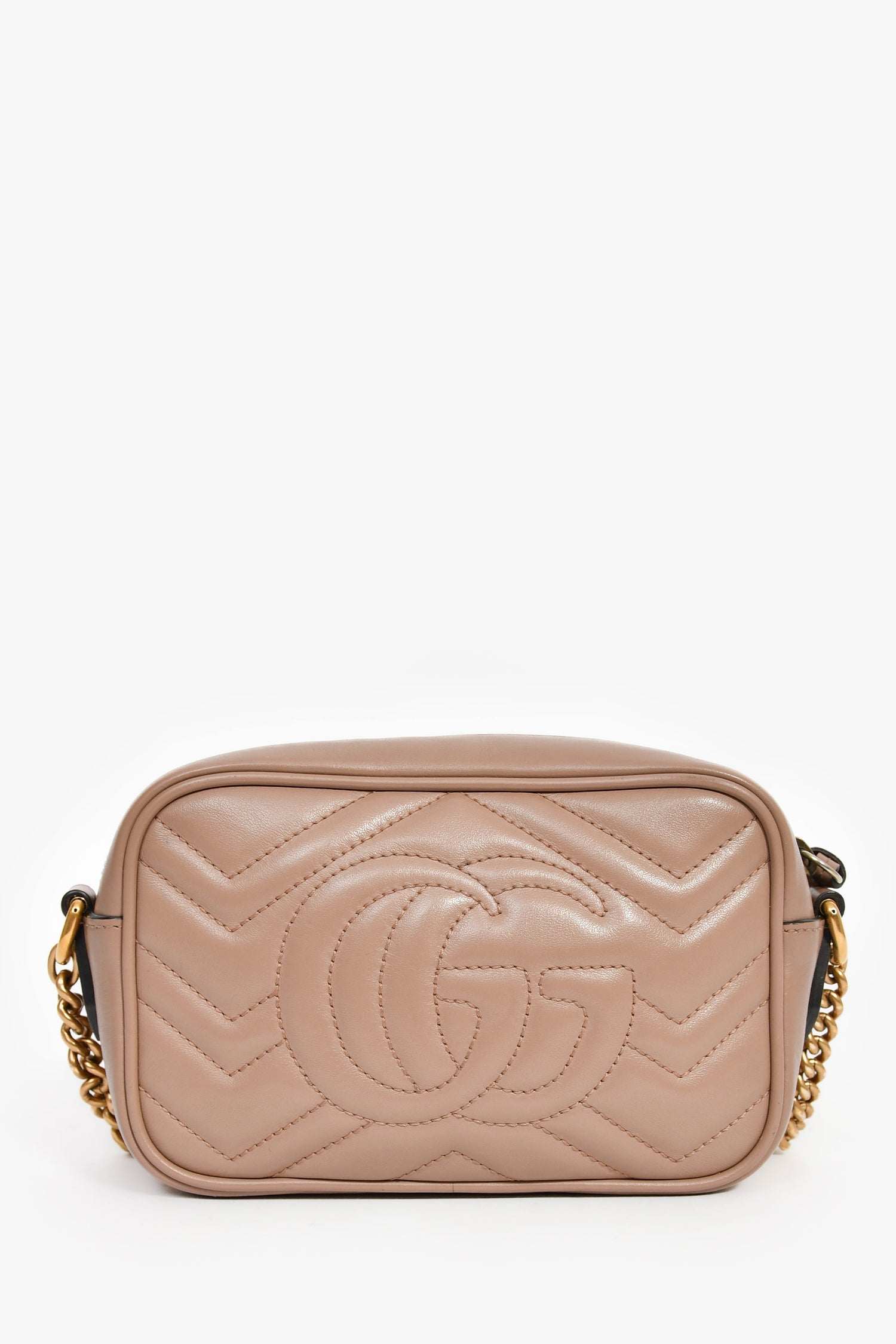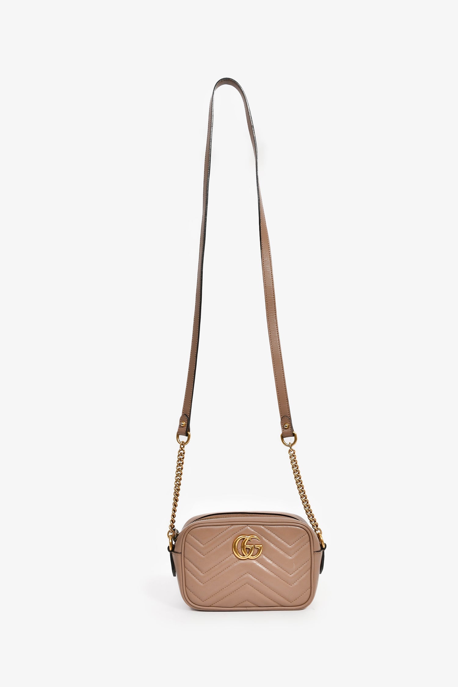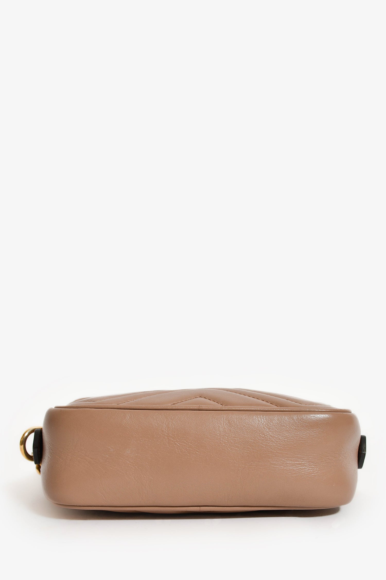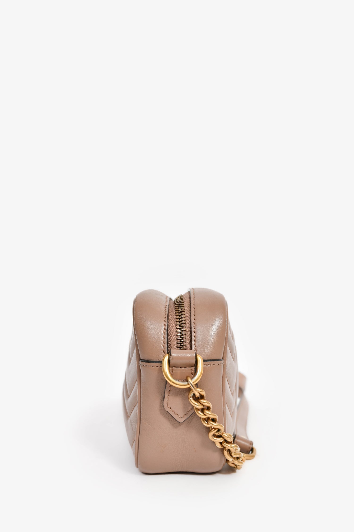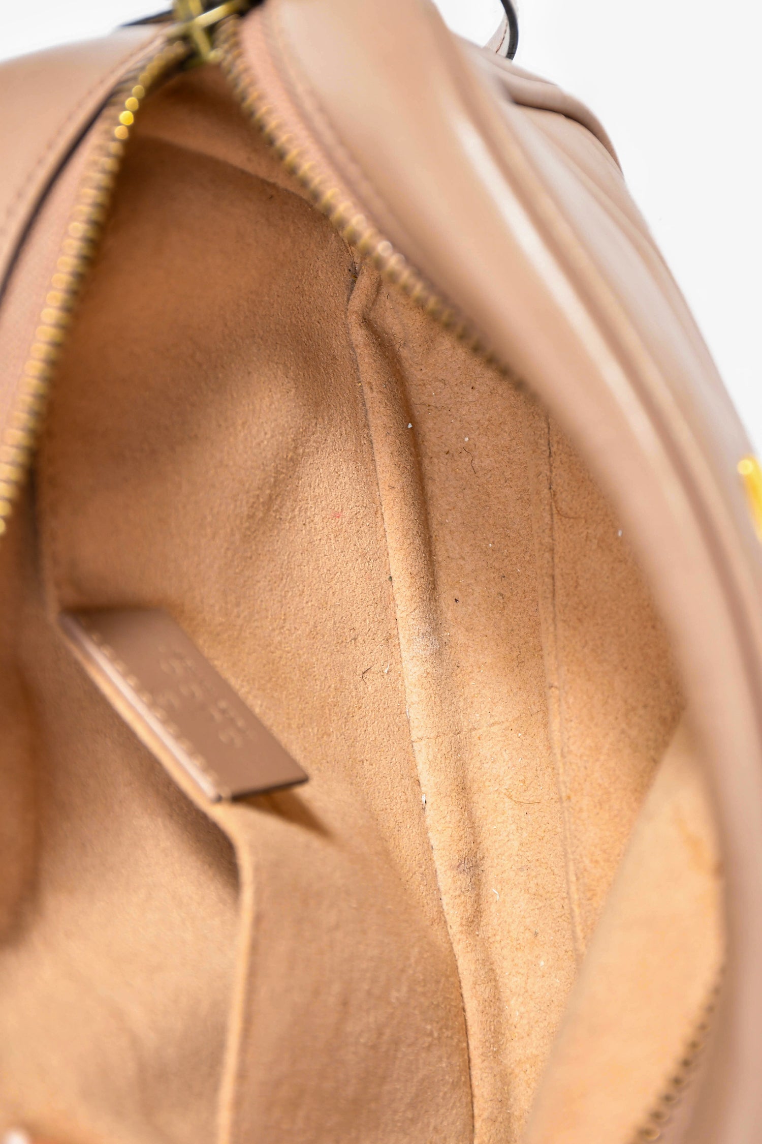 Gucci Taupe Leather Camera Crossbody Bag. Upper zip closure. Chain-link and leather crossbody strap. Lined suede interior with a card slot. Gold-tone hardware. Tonal stitching.
