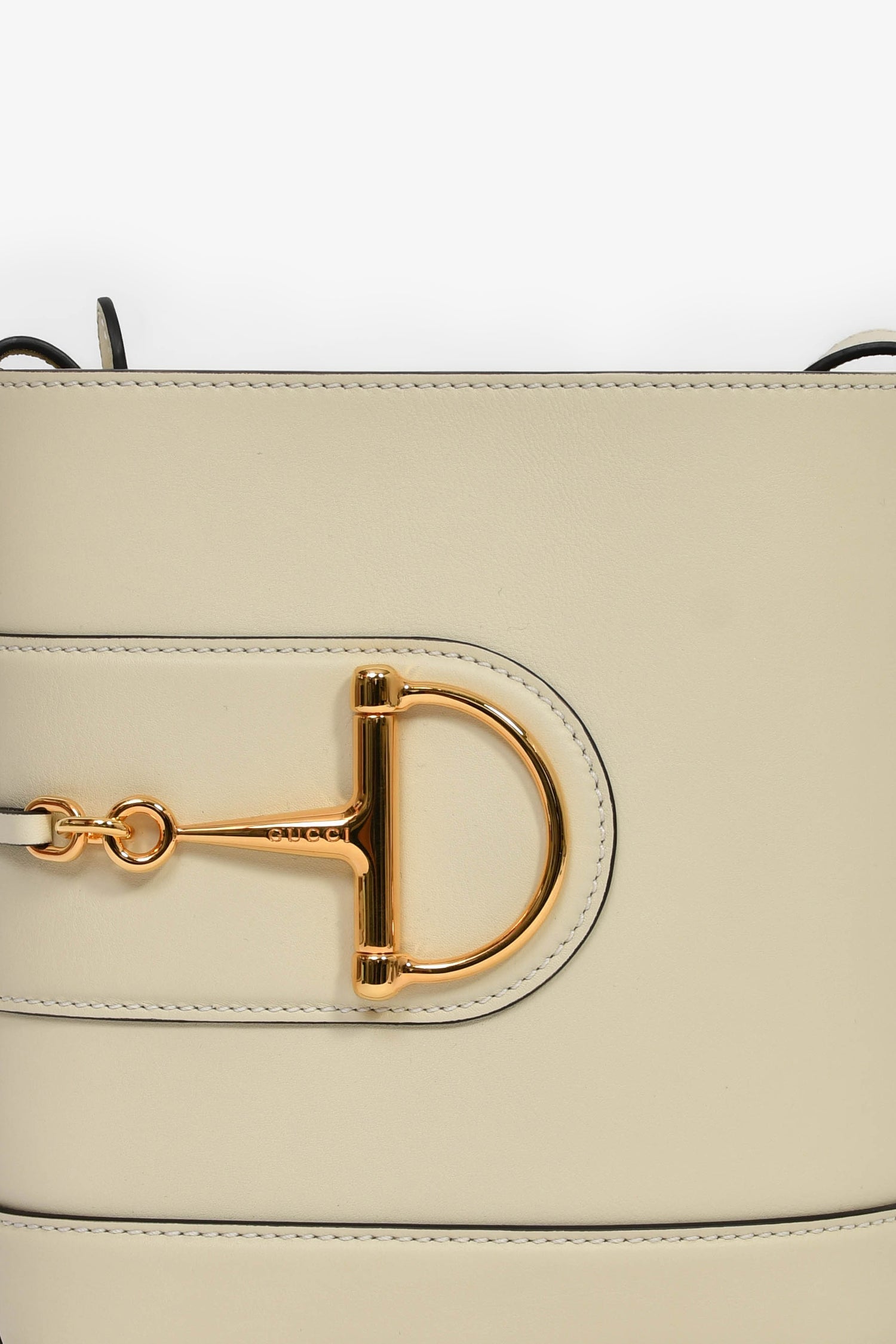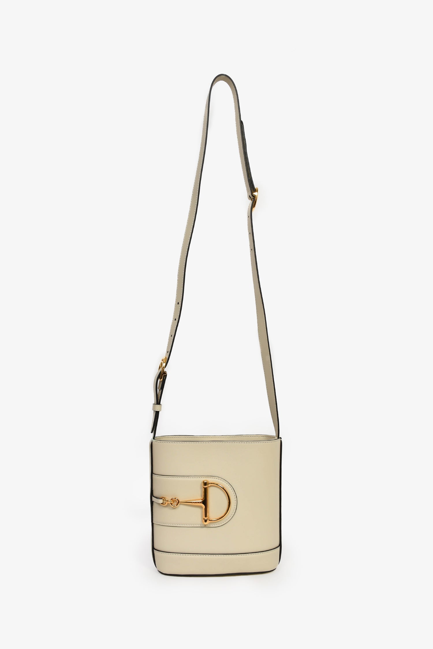 Gucci White Leather Horsebit 73 Small Bucket Crossbody Bag. Top interior strap with magnetic button closure. Adjustable crossbody strap. Lined interior. Single interior wall zip pocket. Gold-tone hardware. Tonal stitching.