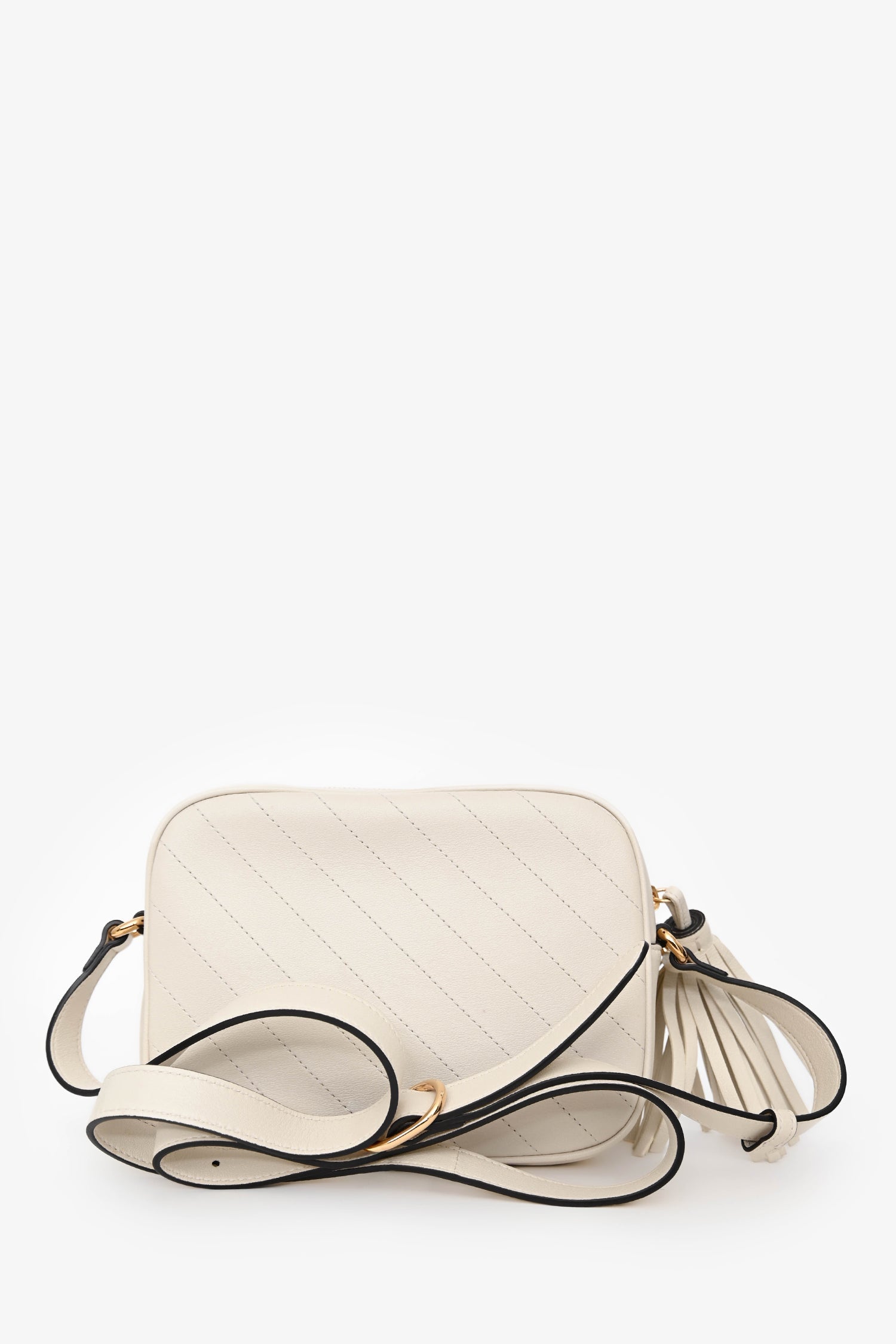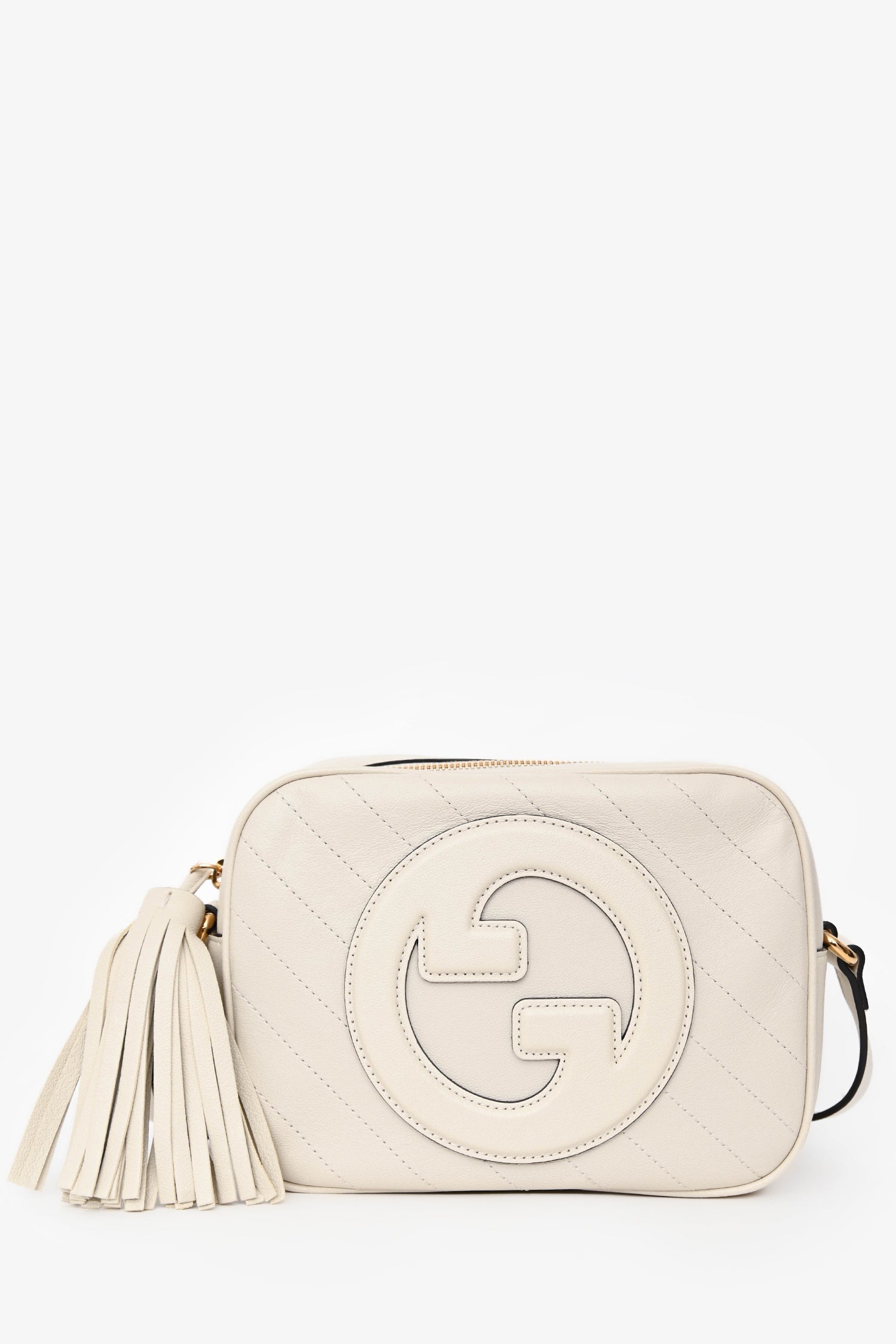 Gucci White Leather Small Logo 'Blondie' Crossbody Camera Bag. Top zip closure. Adjustable single shoulder strap. Single interior slip pocket. Lined interior. Gold-tone hardware. Tonal stitching.