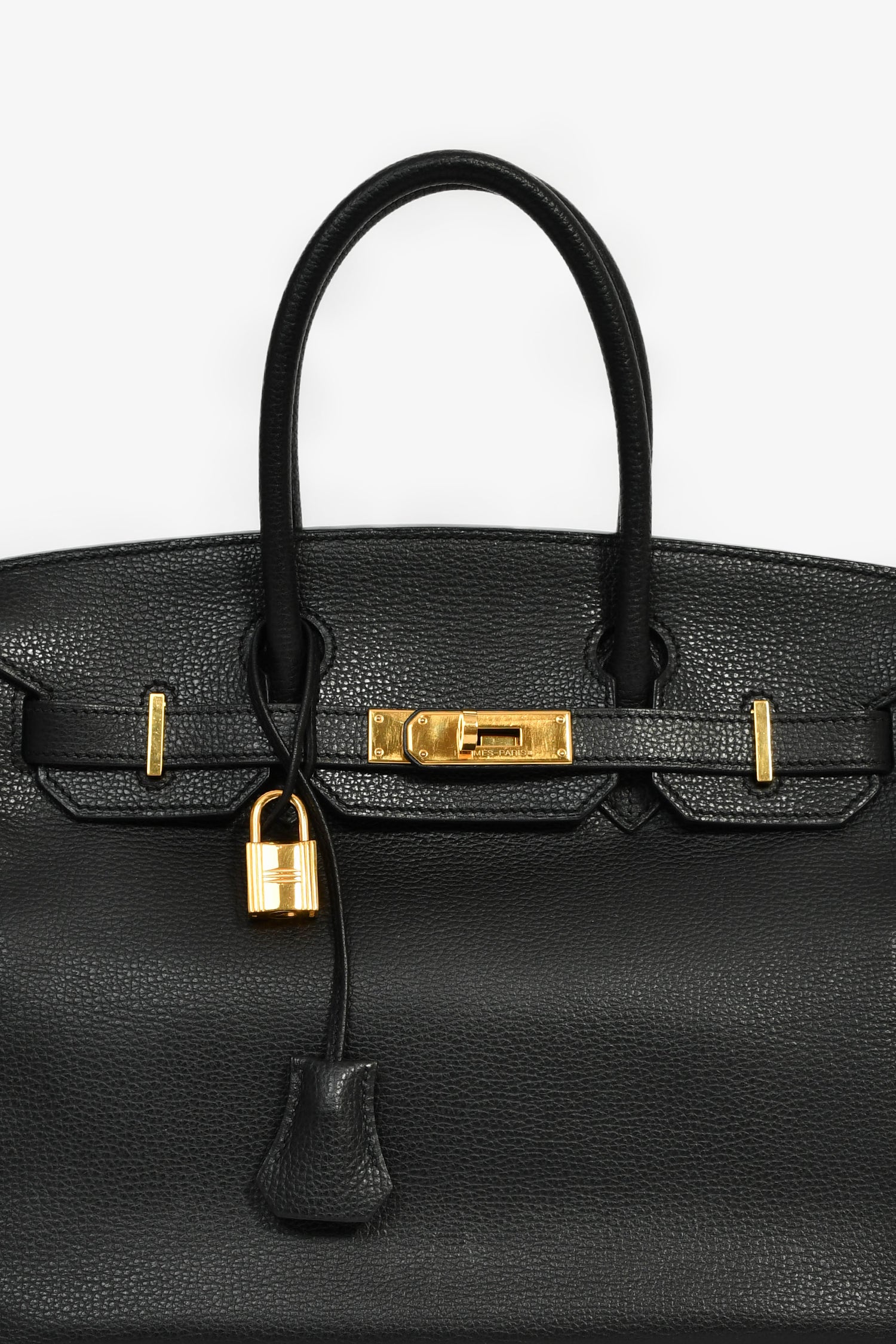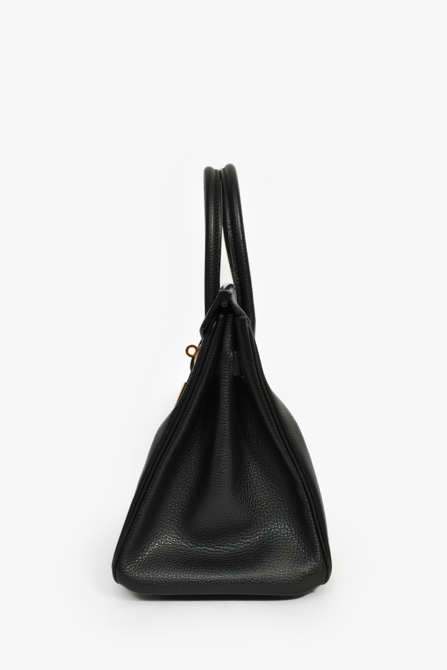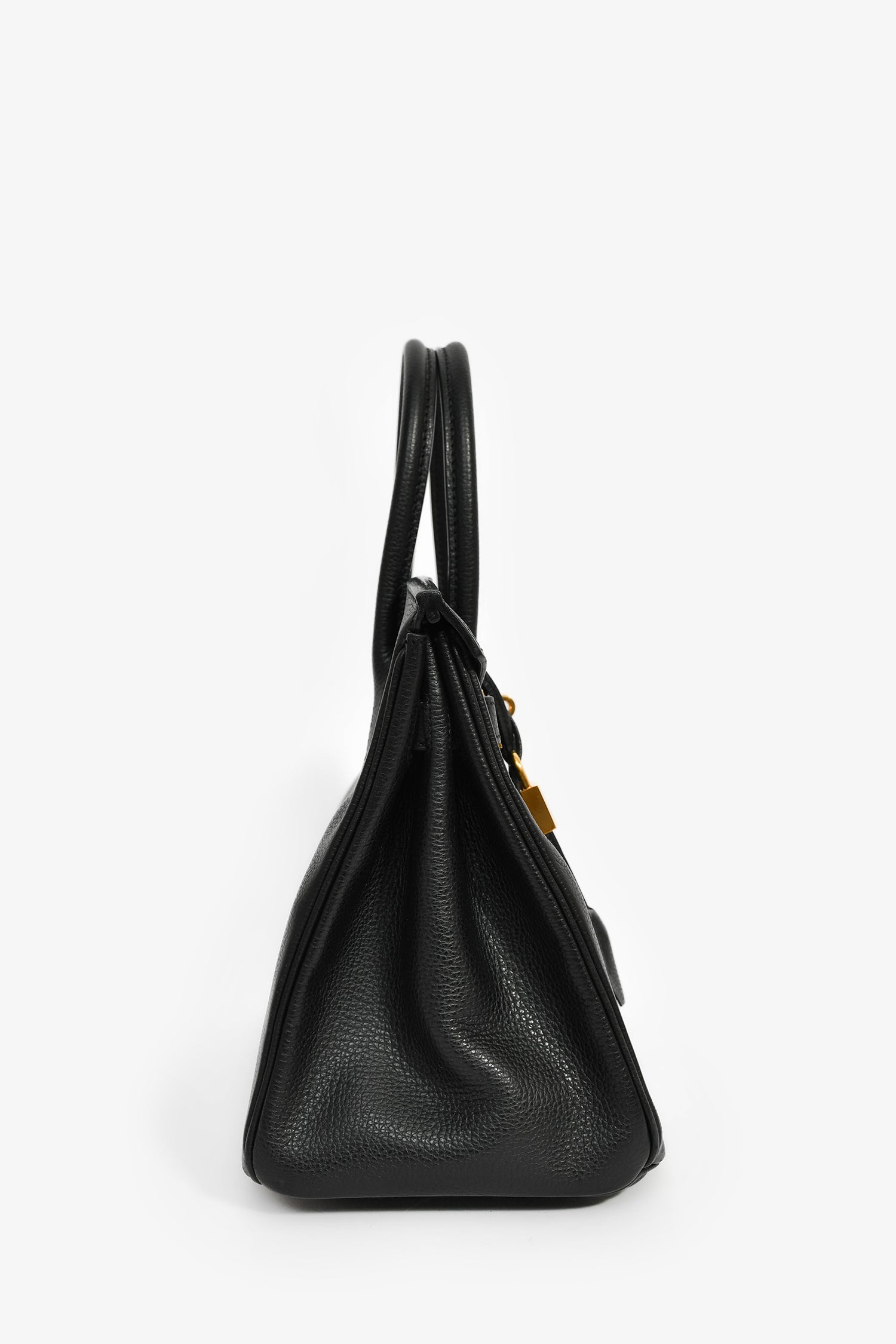 Hermès 2007 Black Vache Liegee Birkin 30. Dual rolled top handles. Front fold-over flap with pull-through straps and a turn-lock closure. 2 interior pockets; 1 zip and 1 slip. Gold-tone hardware. Tonal stitching. Inclusions: clochette, lock, and keys.