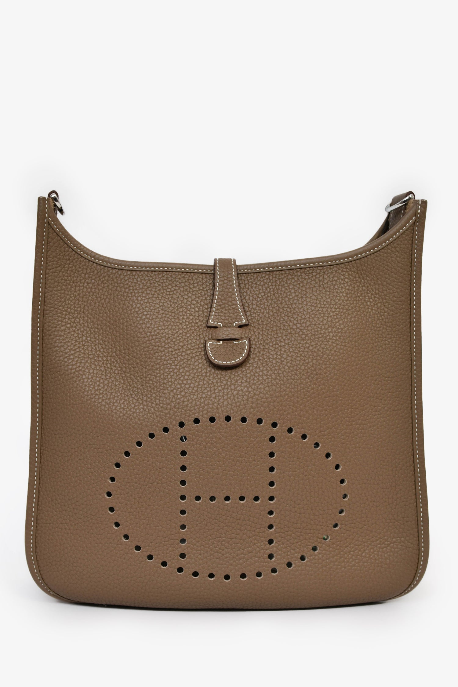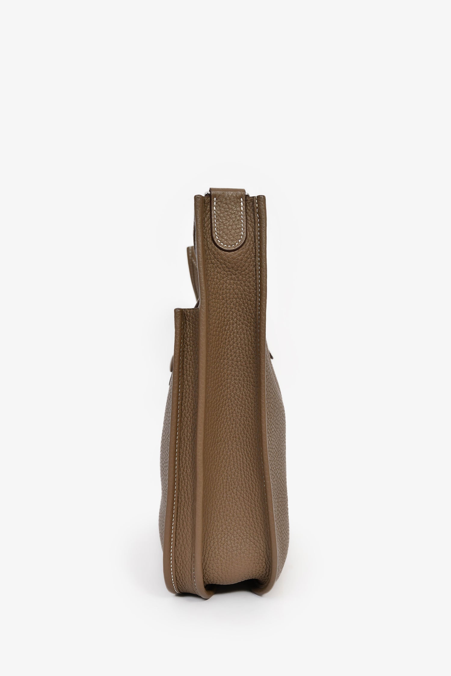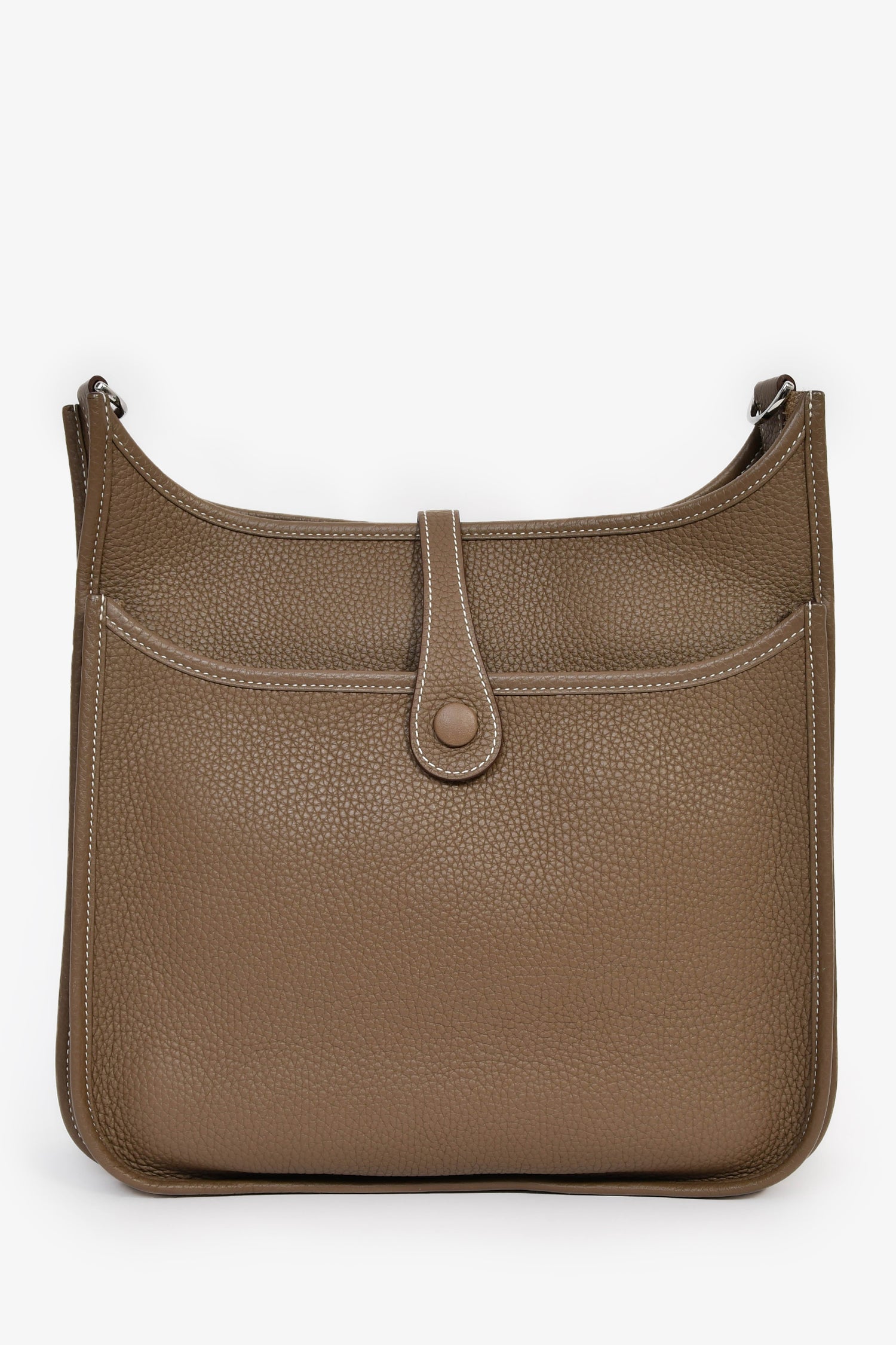 Hermès 2018 Etoupe Clemence Evelyne III 29. Fold-over strap with a snap closure. Attachable webbed crossbody strap. Suede-lined interior. Silver-tone hardware. Contrast stitching.