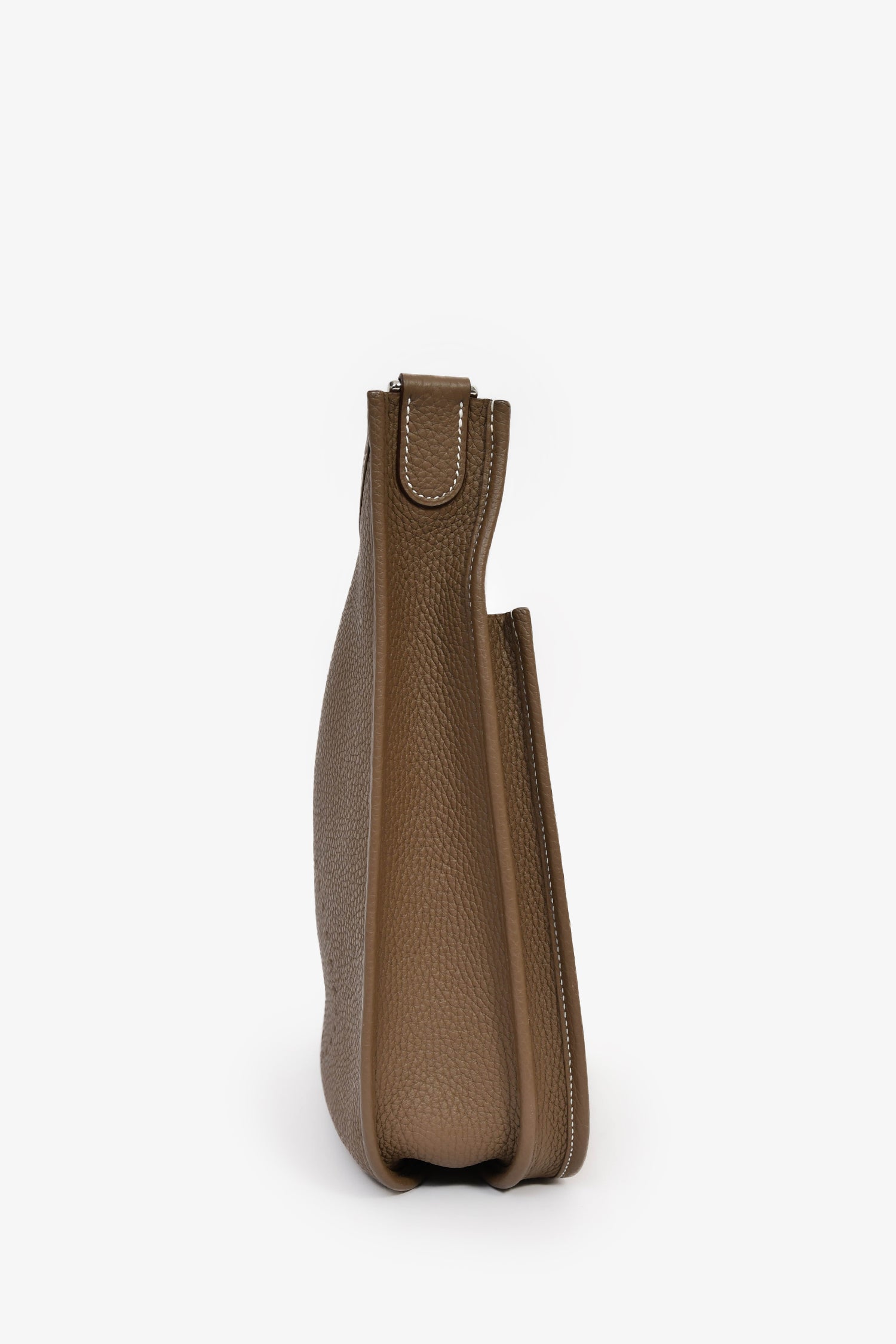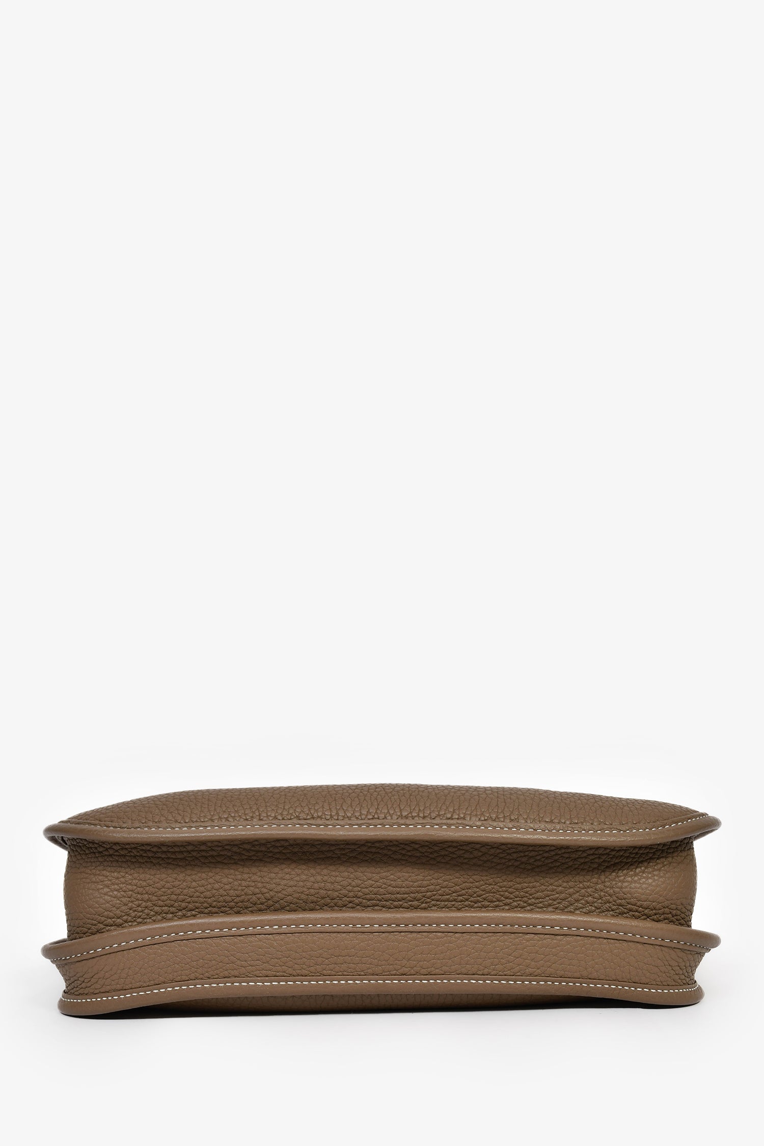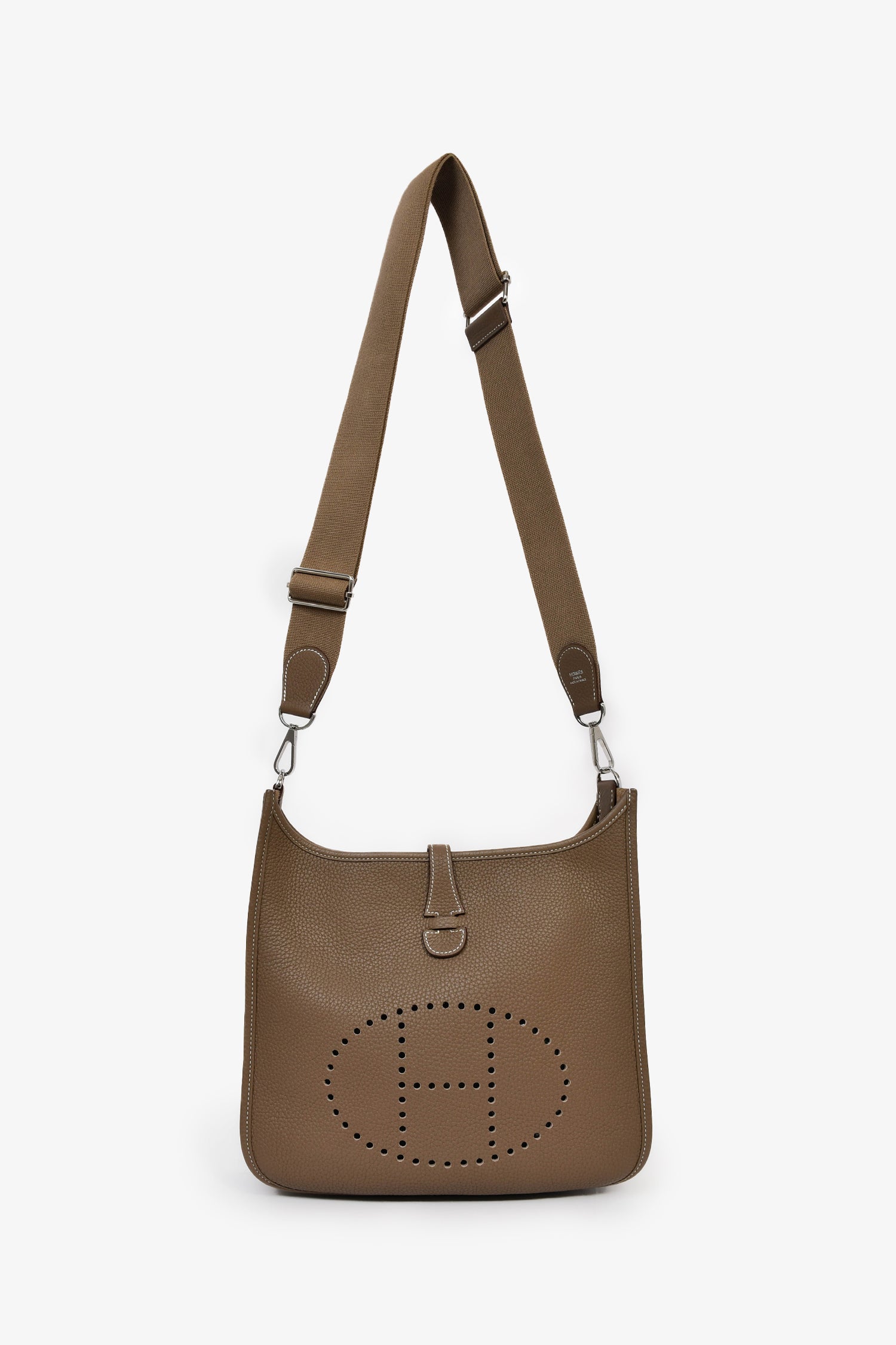 Hermès 2018 Etoupe Clemence Evelyne III 29. Fold-over strap with a snap closure. Attachable webbed crossbody strap. Suede-lined interior. Silver-tone hardware. Contrast stitching.