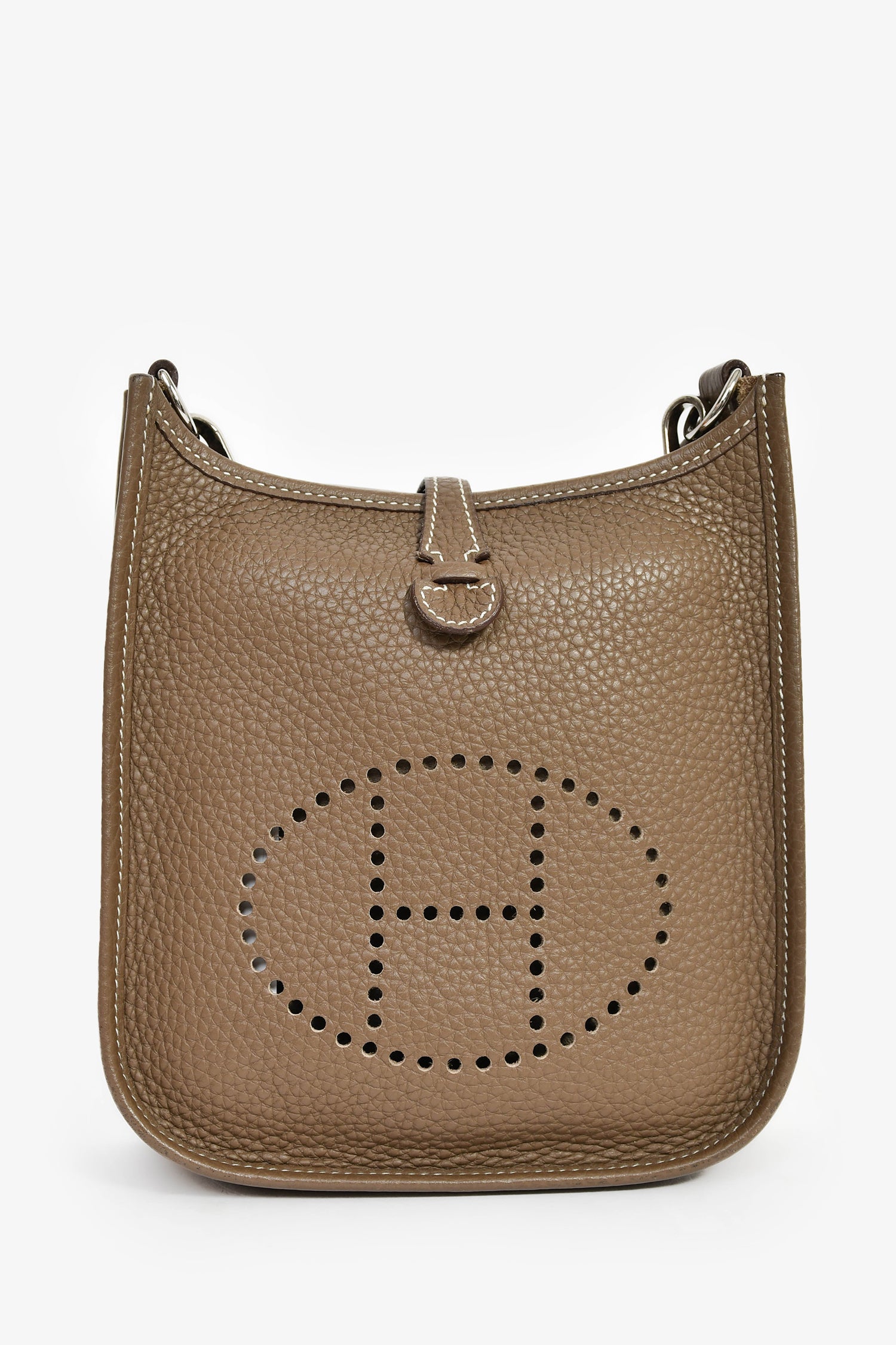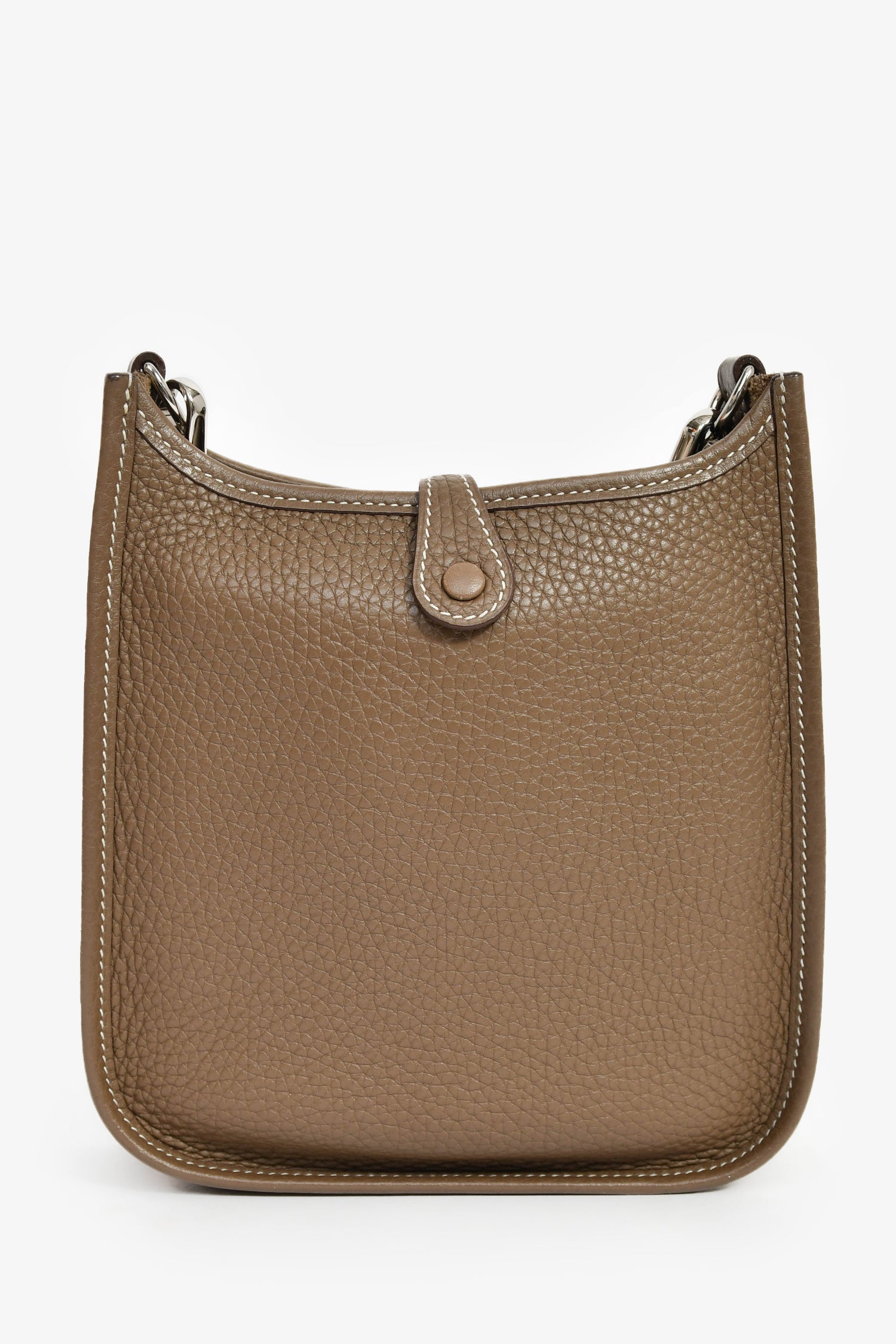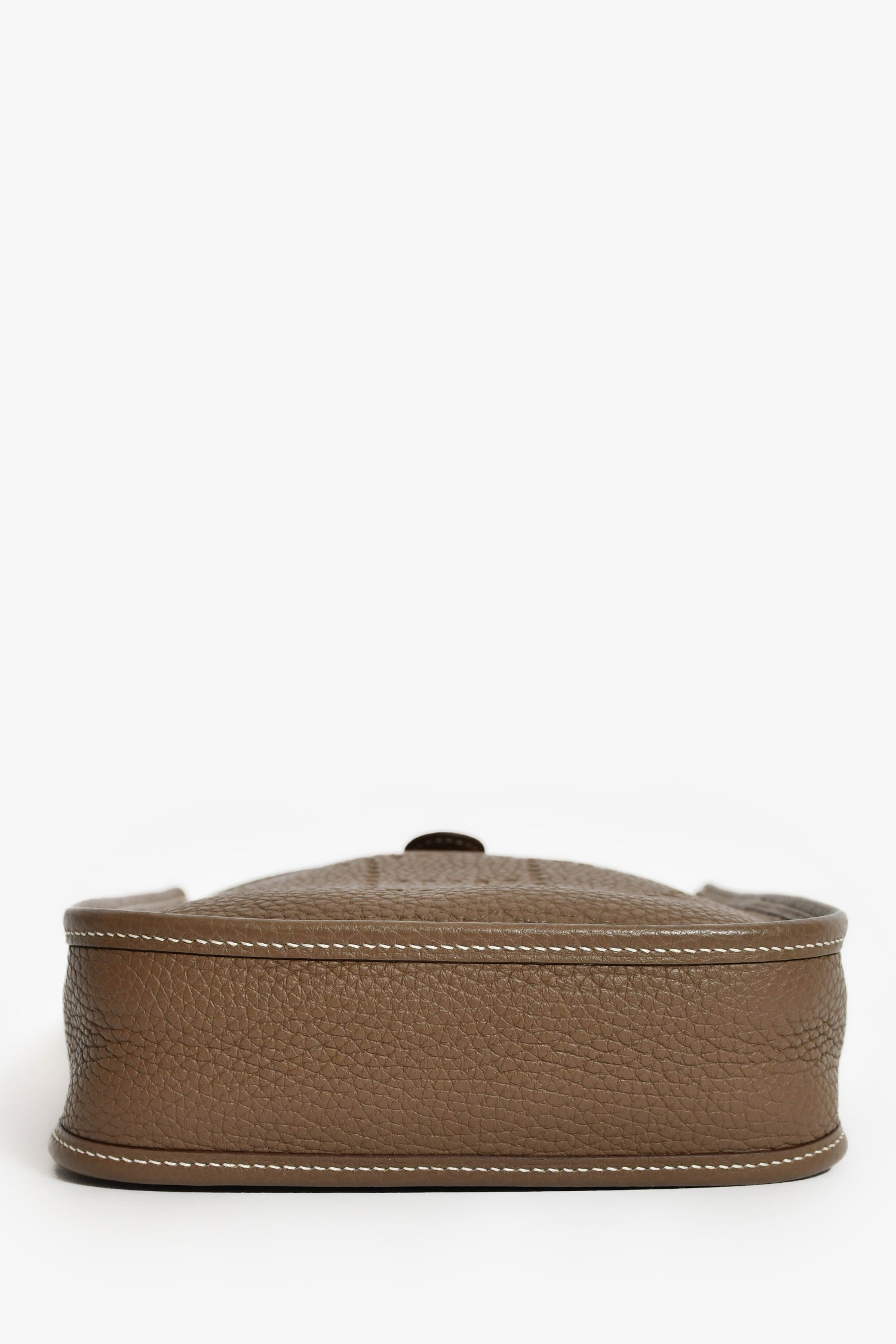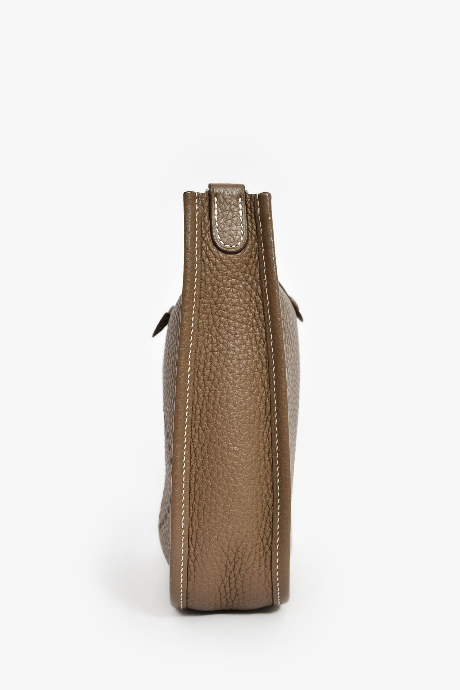 Hermès 2018 Taupe Clemence Leather Evelyne TPM. Fold-over singular strap with a snap closure. Webbed crossbody strap. Lined suede exterior. Silver-tone hardware. Tonal stitching.