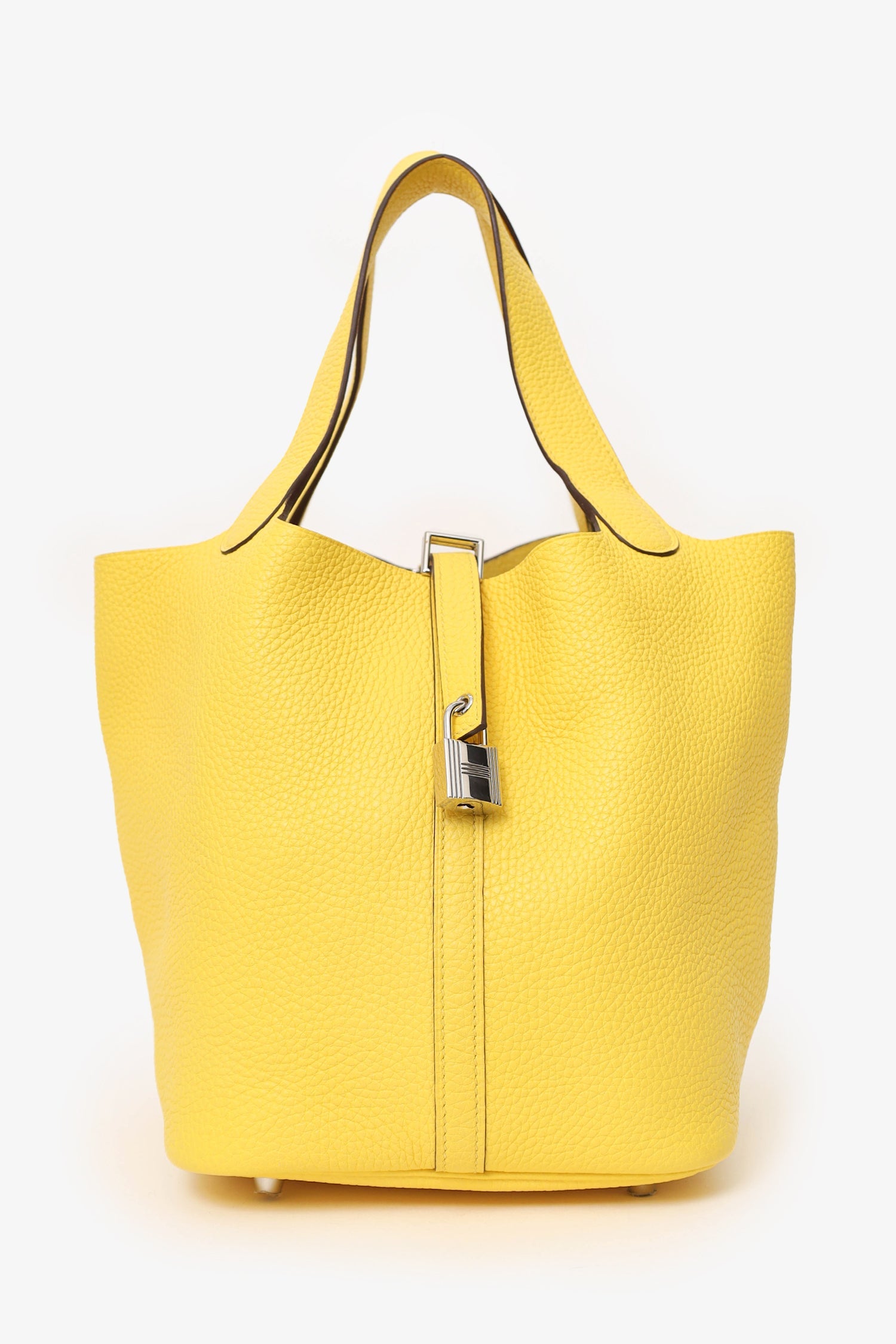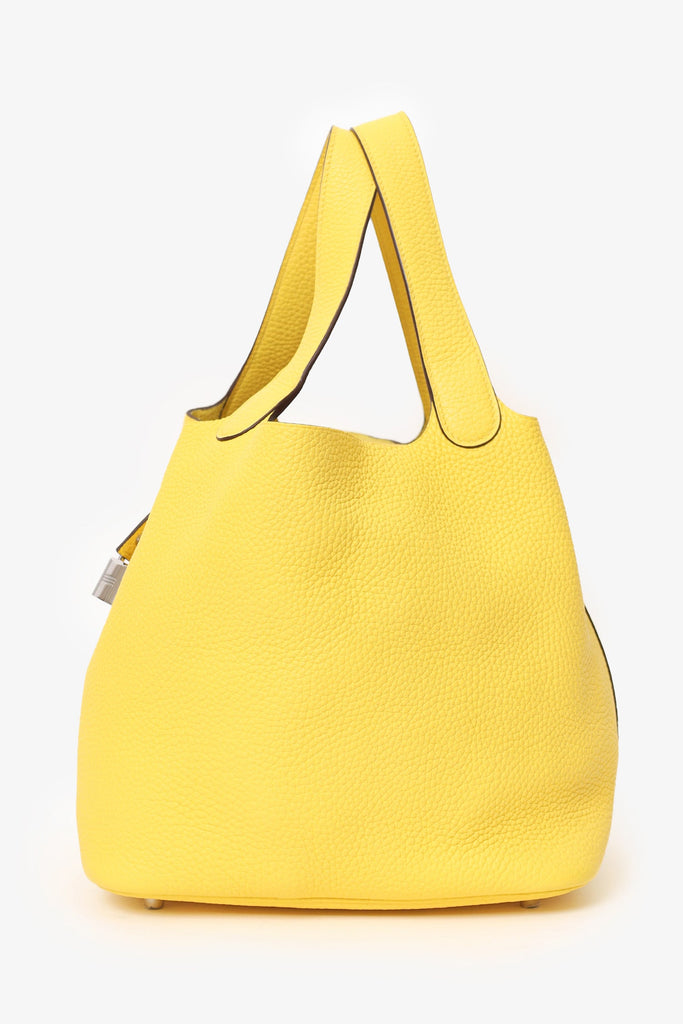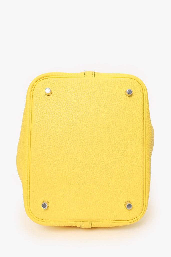 Hermès 2020 Jaune de Naples Clemence Picotin 22. Open top with cinch strap and lock closure. Twin top handles. Protective base studs. Silver-tone hardware. Tonal stitching.