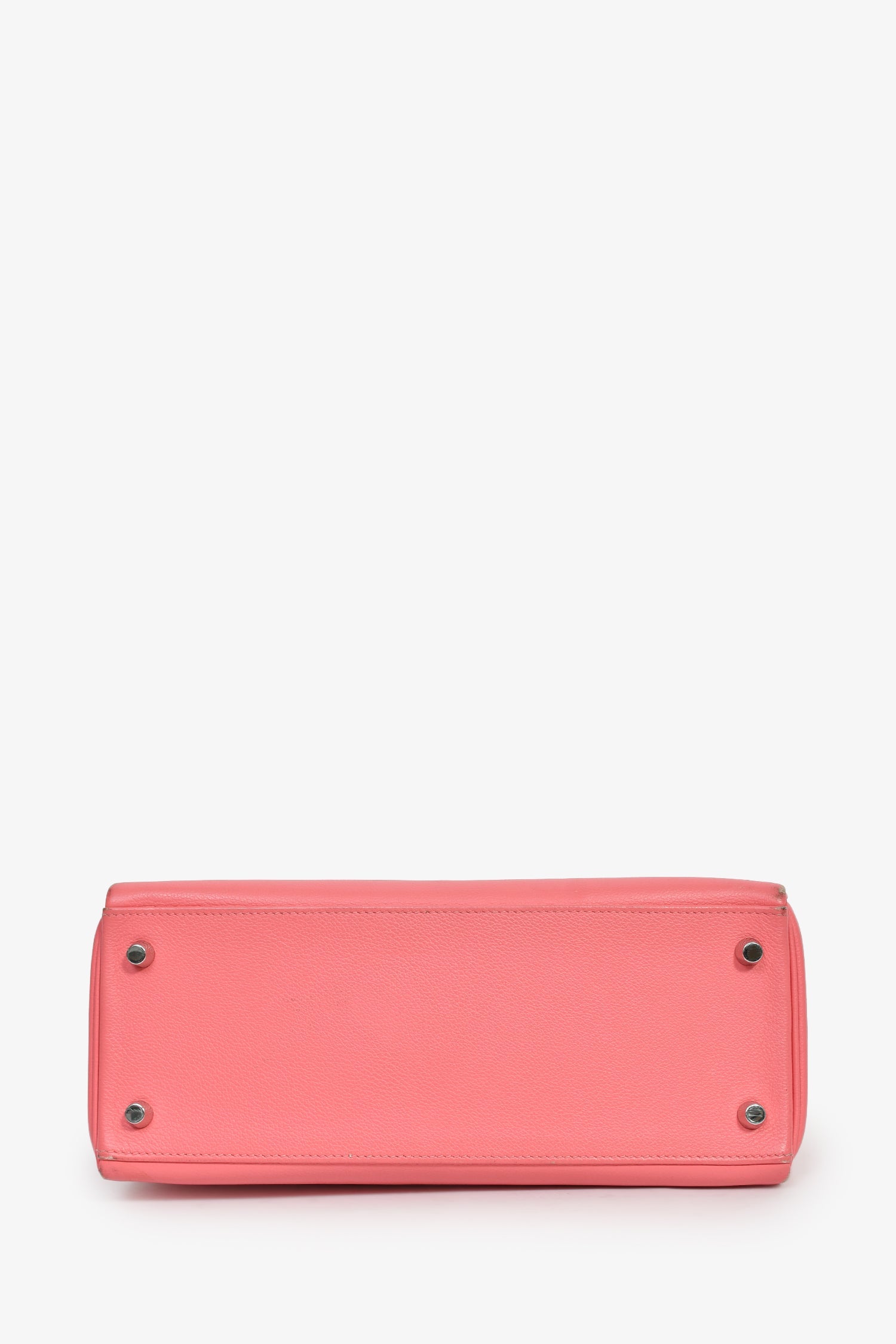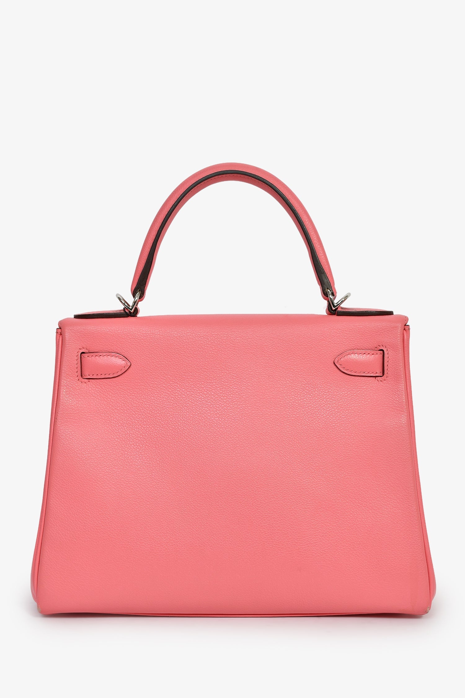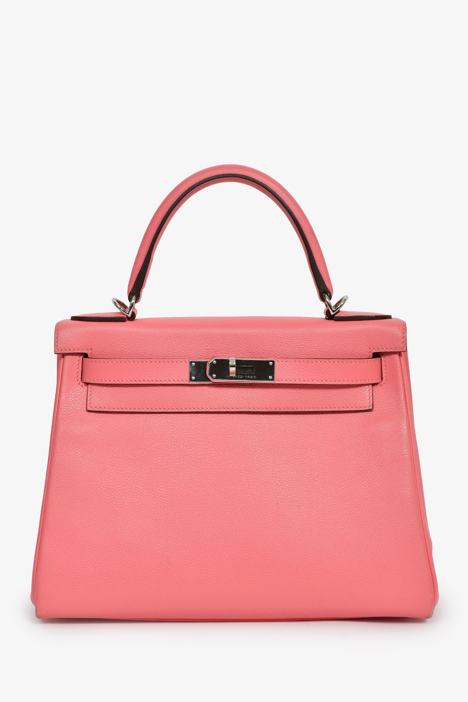 Hermès 2020 Rose D'Ete Evercolor Leather Verso Chevre Kelly Retourne 28. Single top handle. Fold-over flap. Turn-lock closure with pull-through straps. 1 zip and 2 pockets. Comes with an attachable strap, clochette, key, and lock. Silver-tone hardware. Tonal stitching.