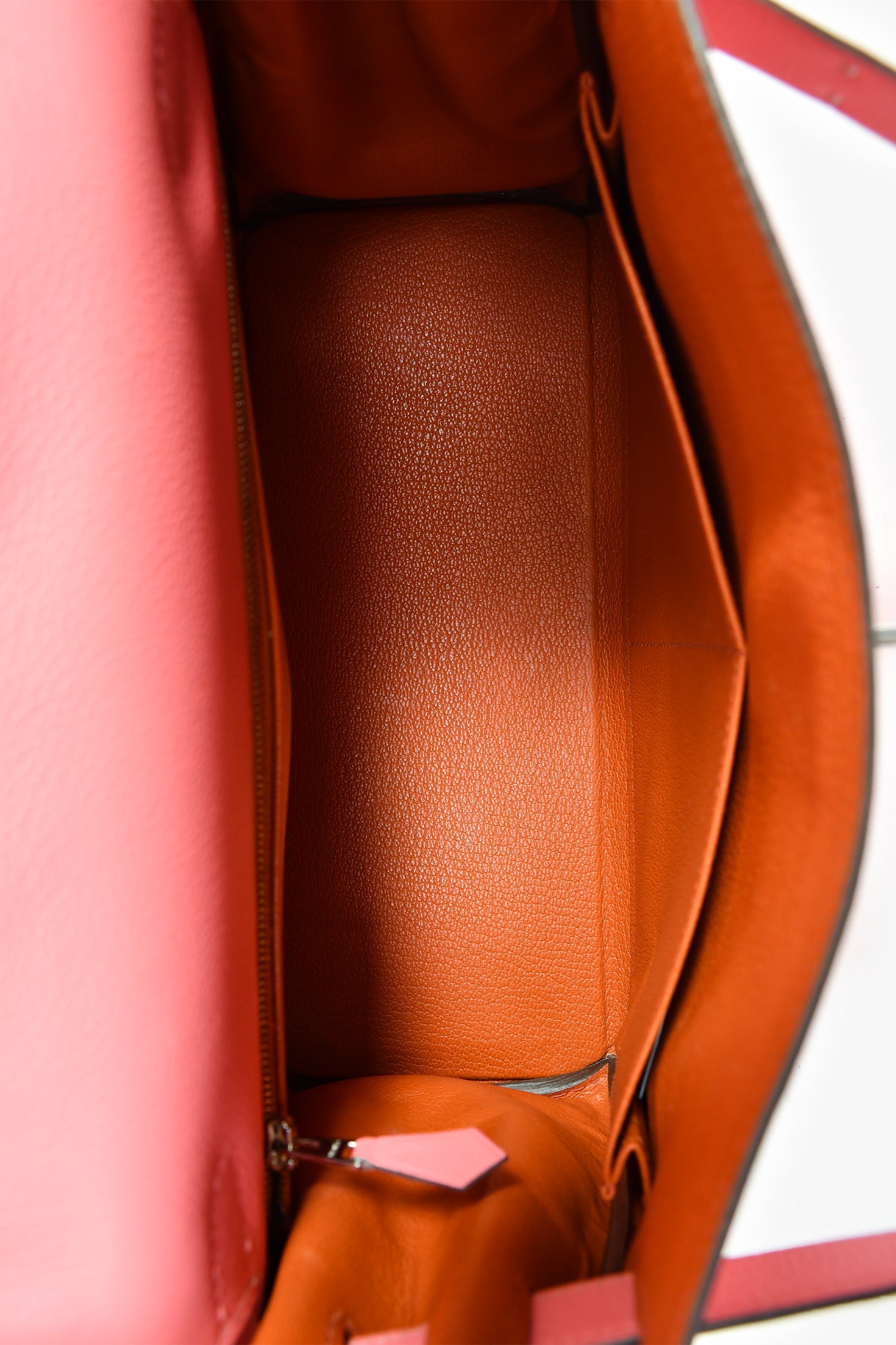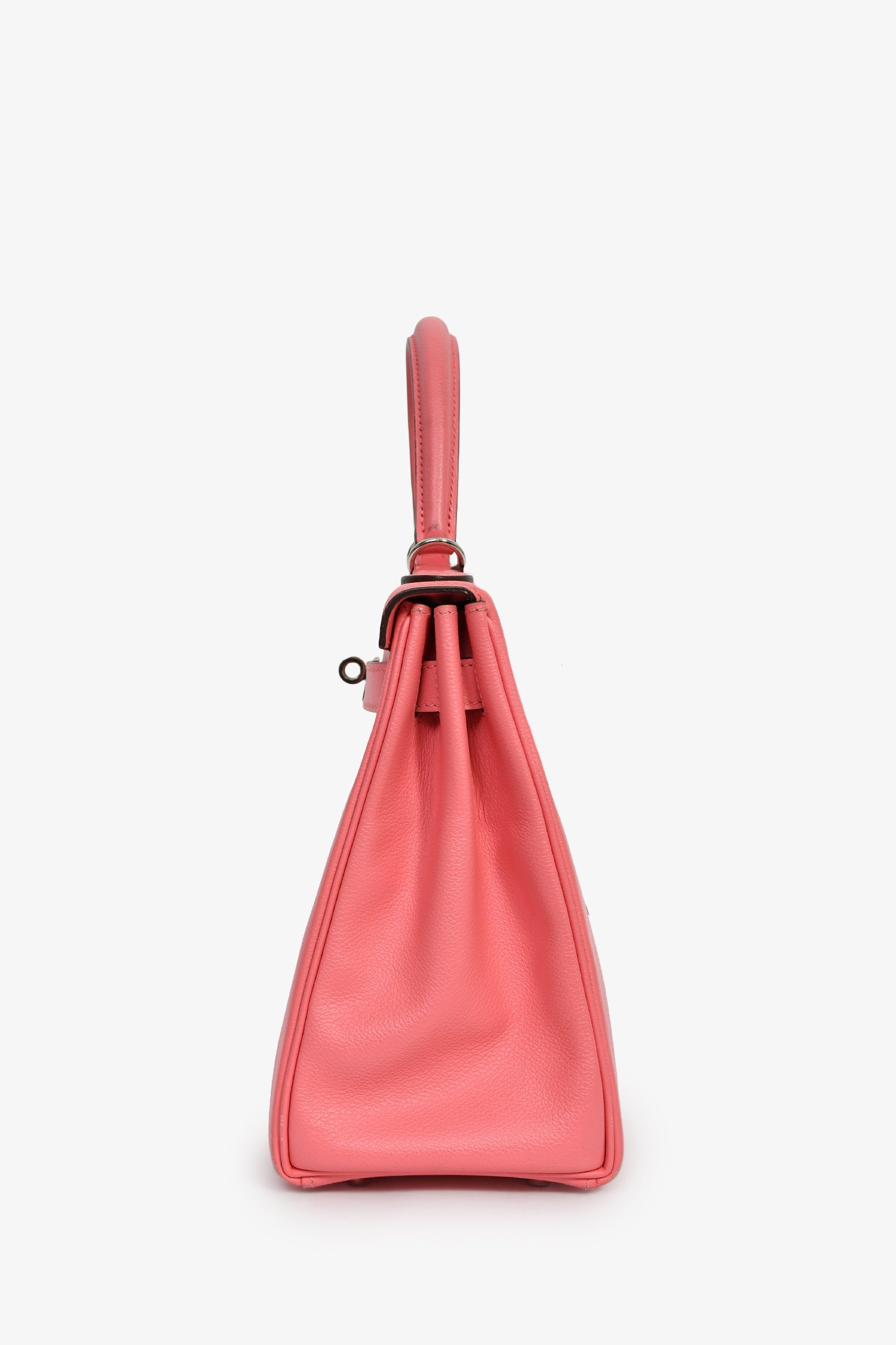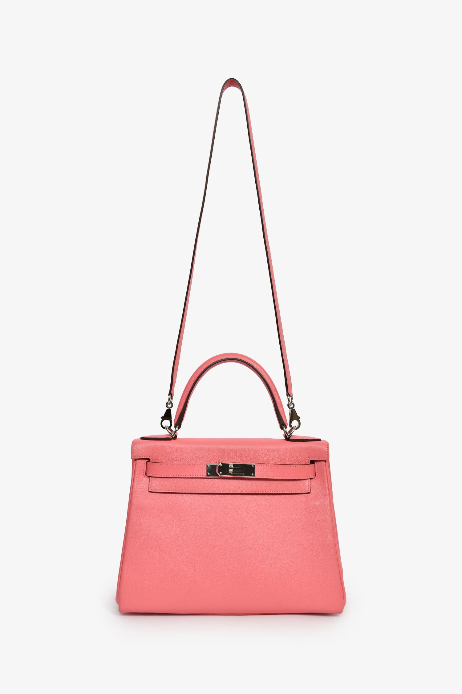 Hermès 2020 Rose D'Ete Evercolor Leather Verso Chevre Kelly Retourne 28. Single top handle. Fold-over flap. Turn-lock closure with pull-through straps. 1 zip and 2 pockets. Comes with an attachable strap, clochette, key, and lock. Silver-tone hardware. Tonal stitching.