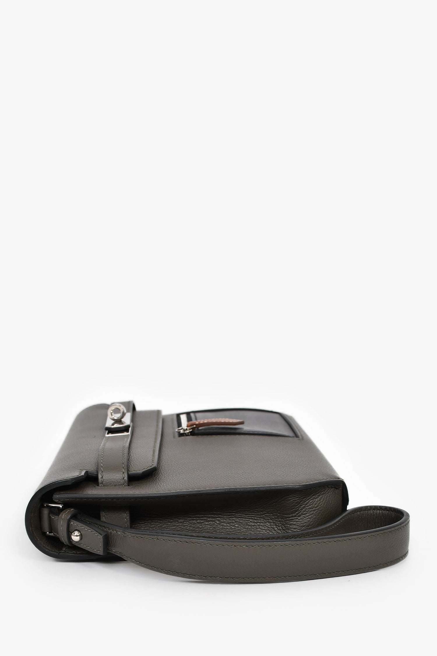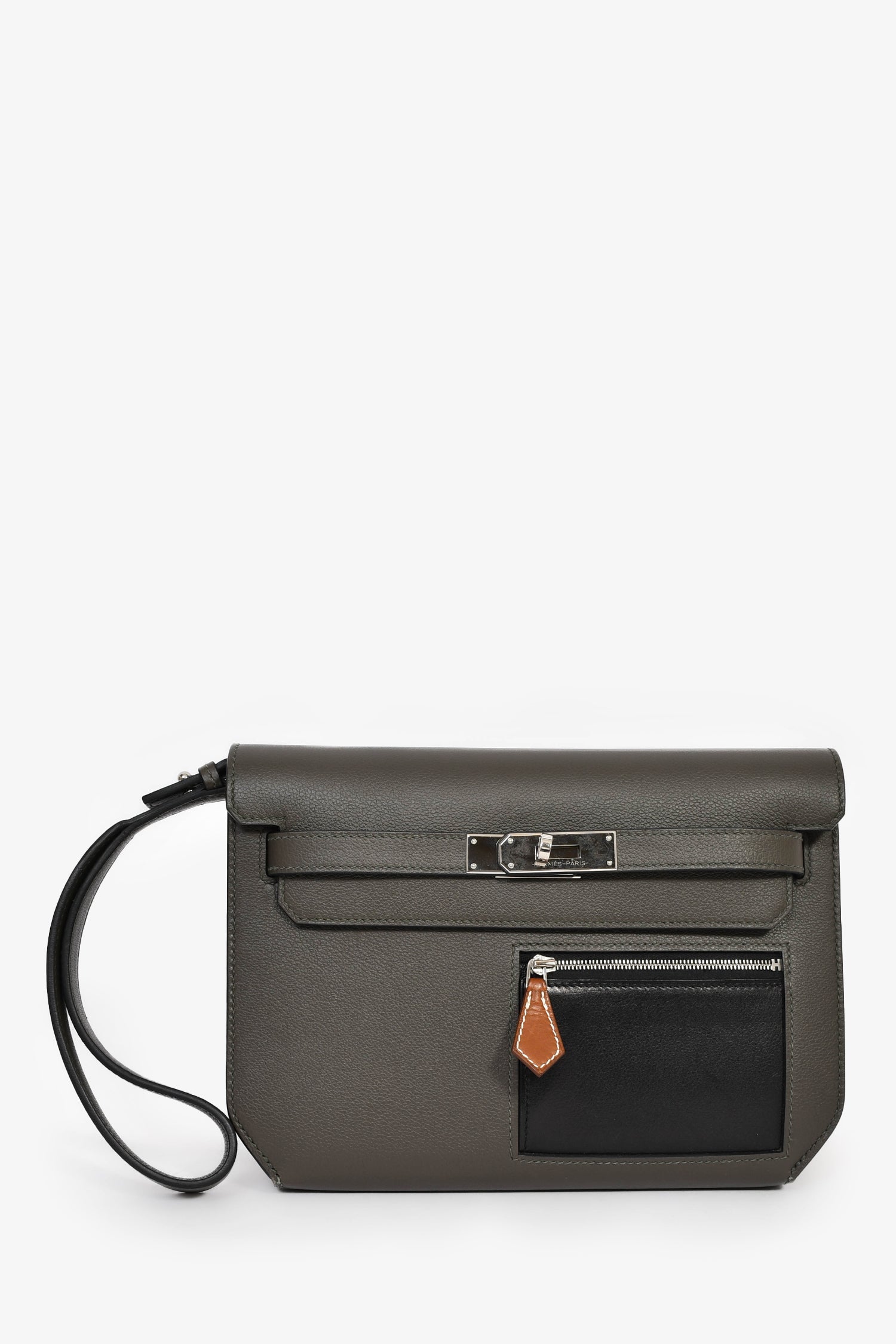 Hermès 2022 Vert De Gris/Black Leather Kelly Dépêches 25 Pouch. Fold-over flap with a turn-lock closure and 2 pull-through straps. 1 wristlet. 1 exterior zip pocket. 2 interior compartments. Tonal stitching. Palladium hardware. Tonal stitching.