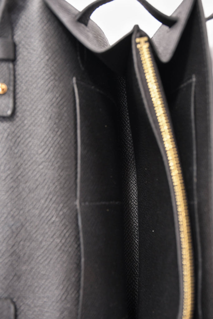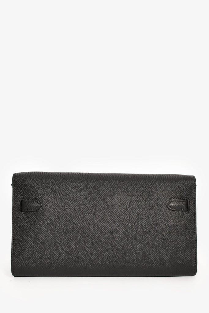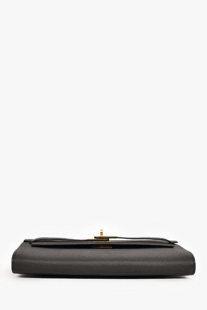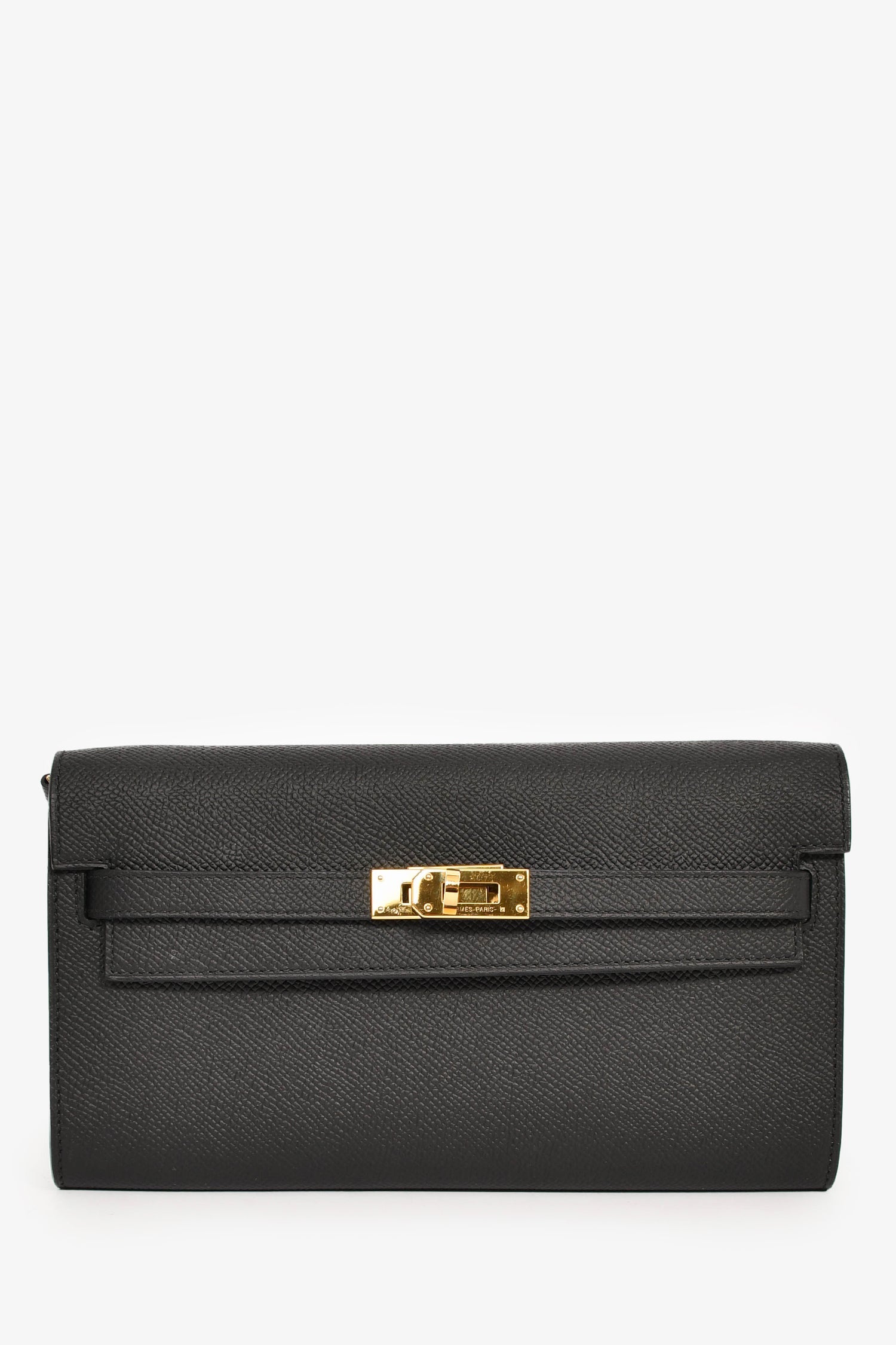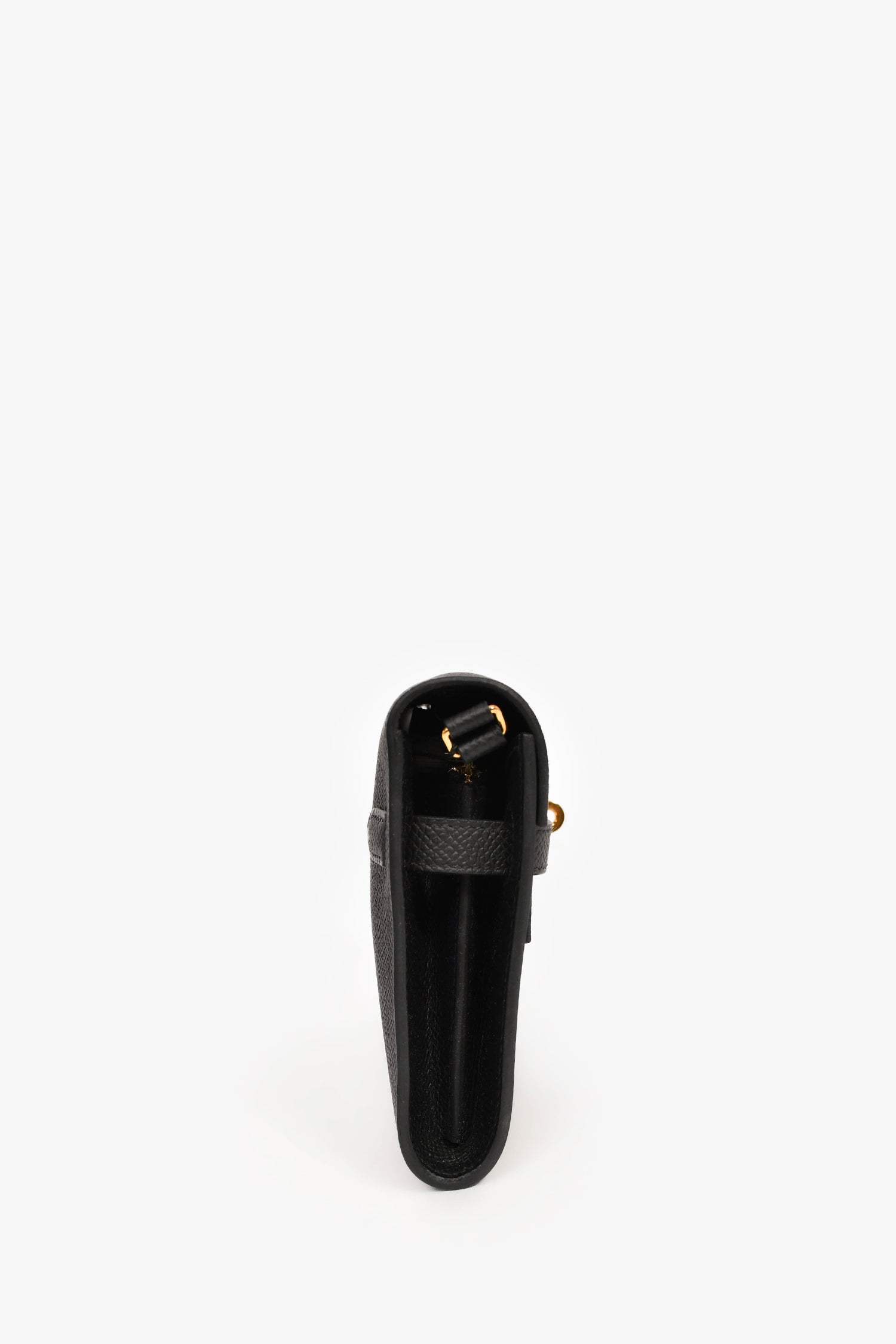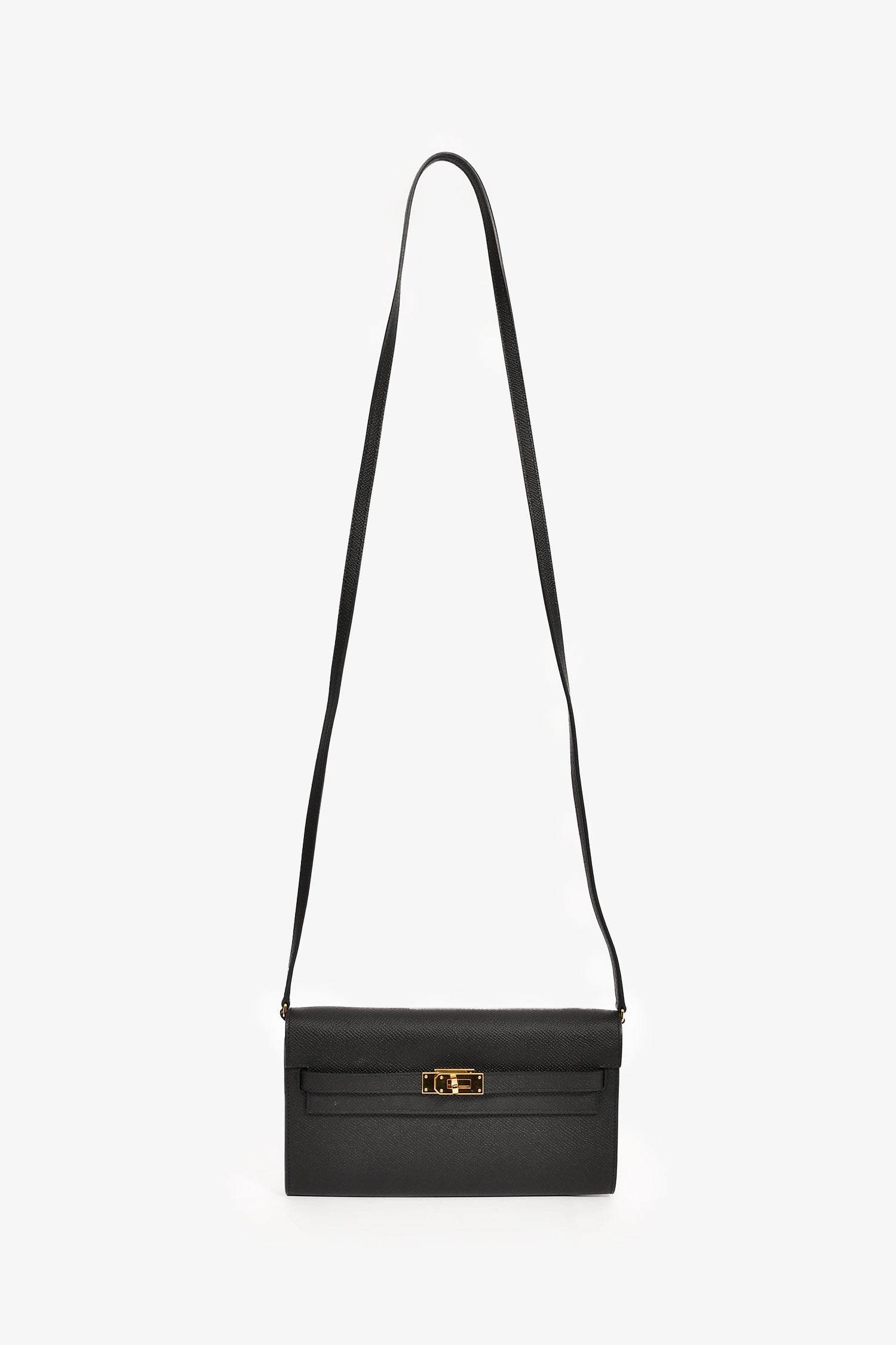 Hermès Black Epsom Leather Kelly Togo Crossbody. Front fold-over flap with straps and turn-lock closure. 3 main interior compartments; 2 open, 1 with zip closure. 4 interior slip pockets. Gold-tone hardware. Tonal stitching.