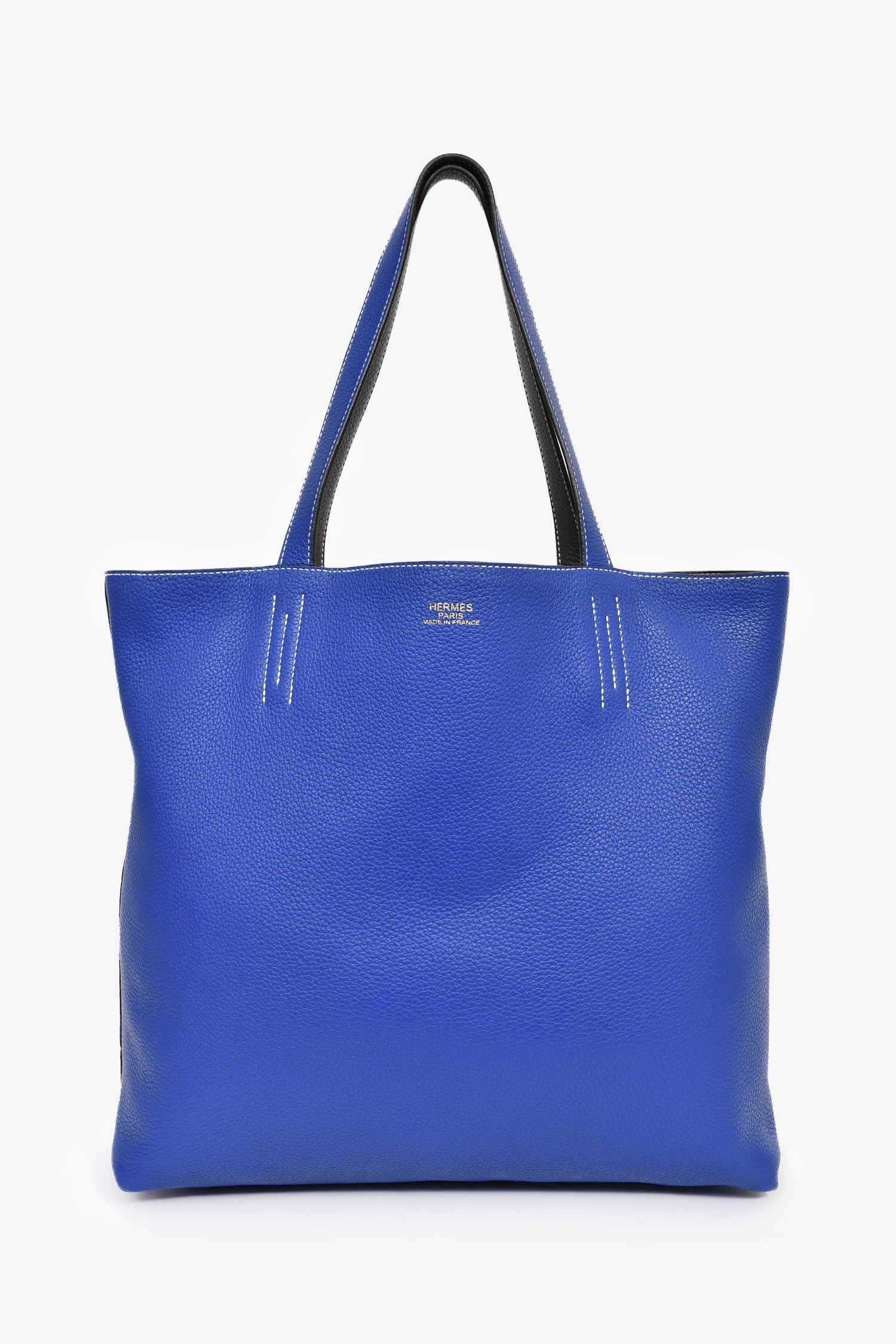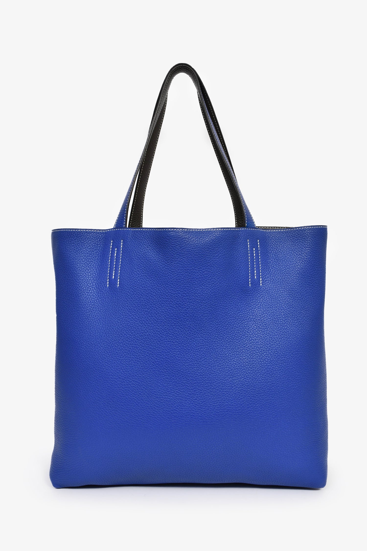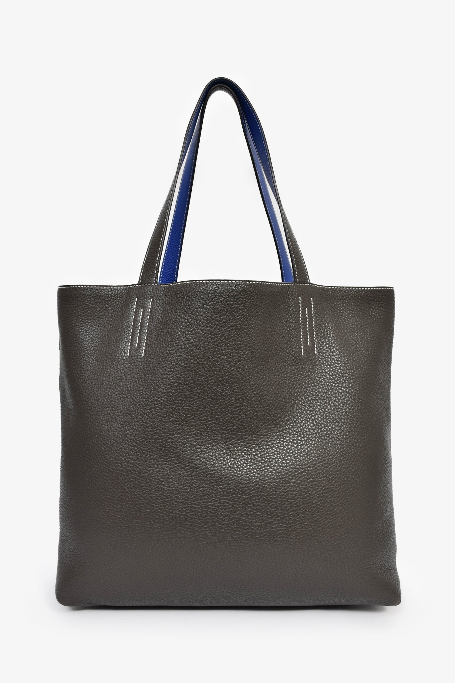 Hermès Blue/Grey Leather Reversible Tote. Open interior. Dual shoulder straps. Contrast stitching.