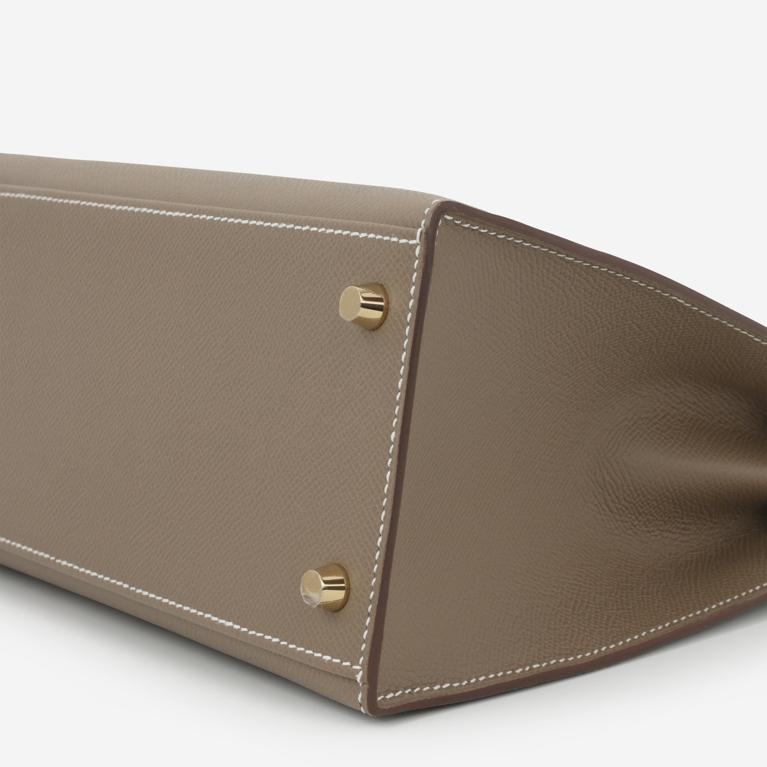 The Hermès Kelly 28 in Etoupe Epsom with Gold Hardware is a sophisticated blend of timeless elegance and modern functionality. Handcrafted in France from structured Epsom leather, this iconic handbag features the versatile Etoupe shade - a soft, neutral taupe that pairs effortlessly with any wardrobe and season.