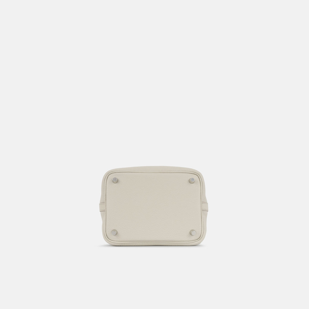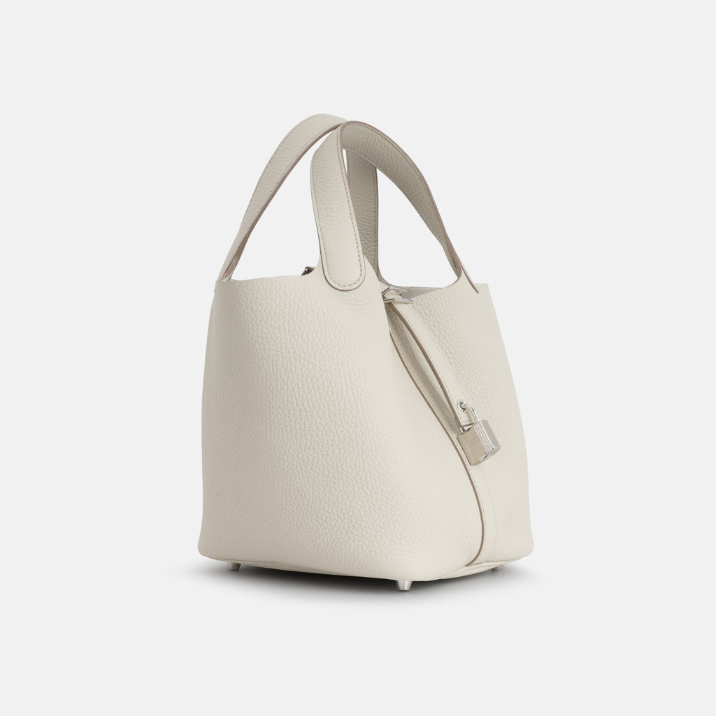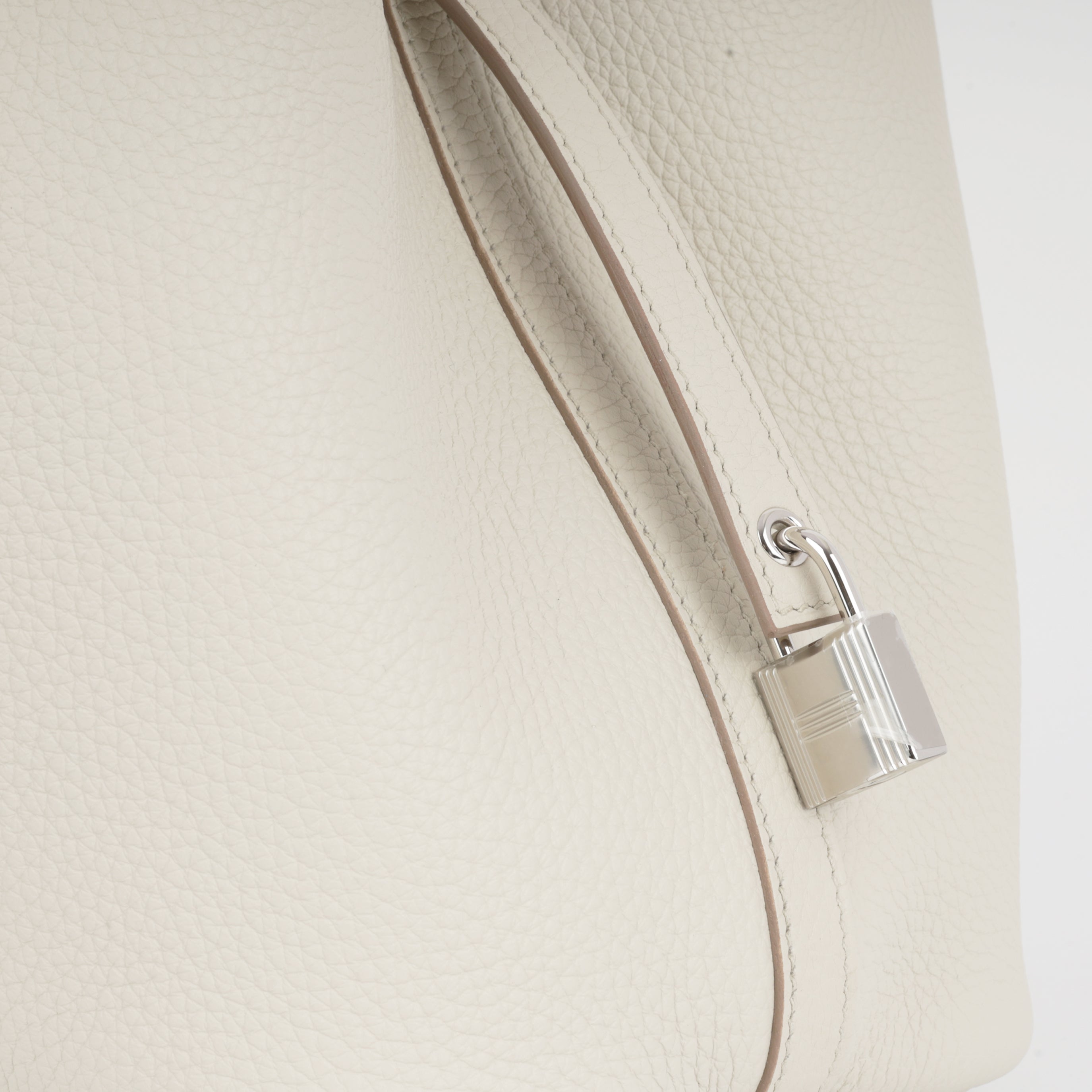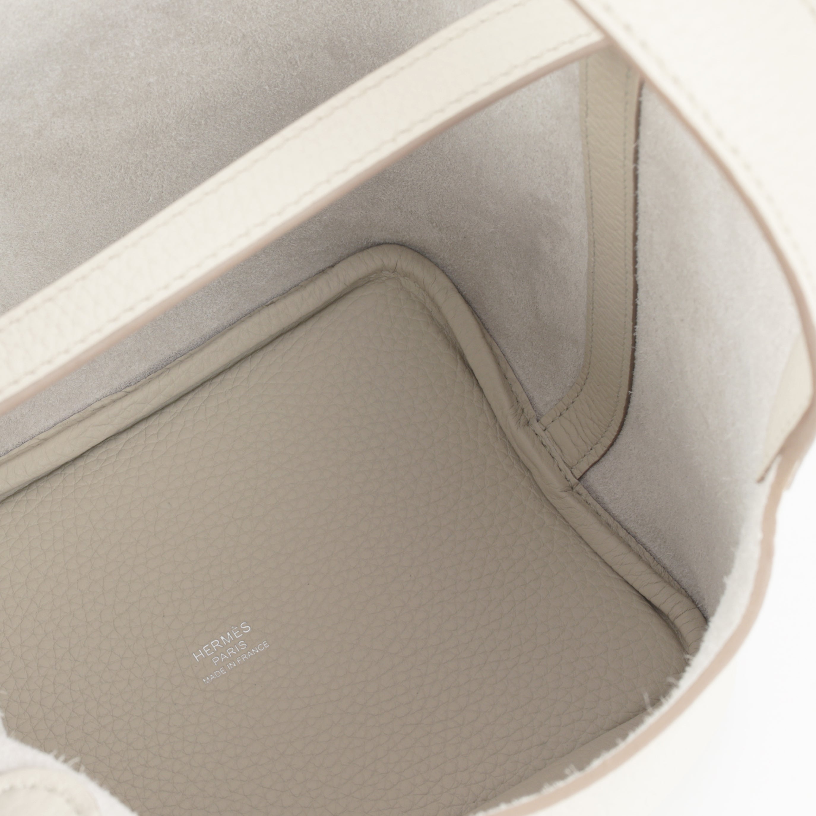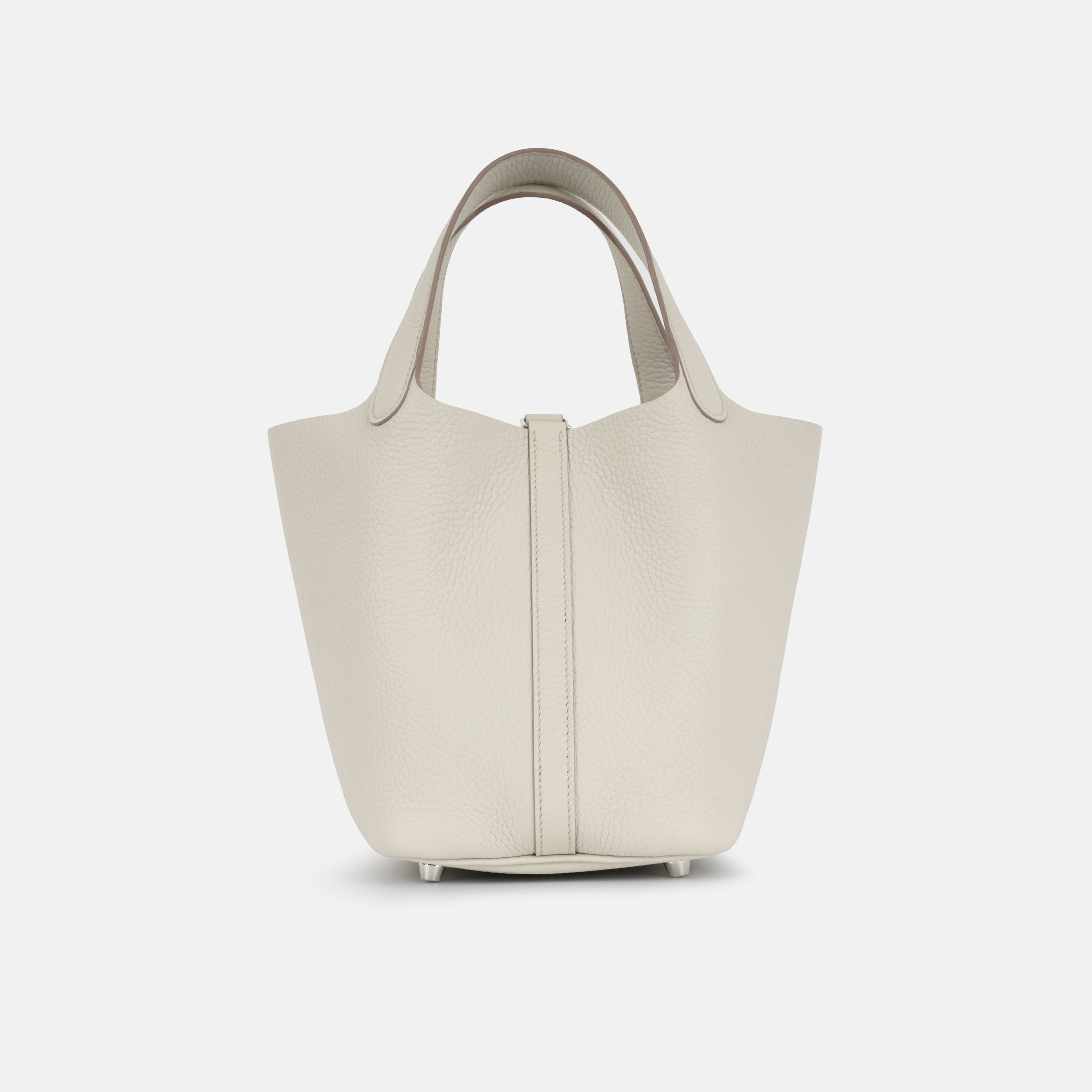 Crafted from supple Clemence leather, the Picotin 18 features a simple bucket shape with relaxed structure. Its Beton shade, a soft light grey, paired with palladium hardware, offers a contemporary neutral look suitable for casual or professional wear.