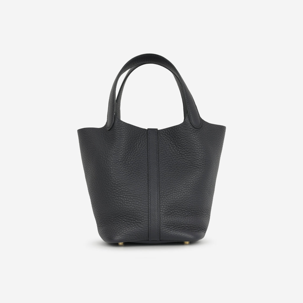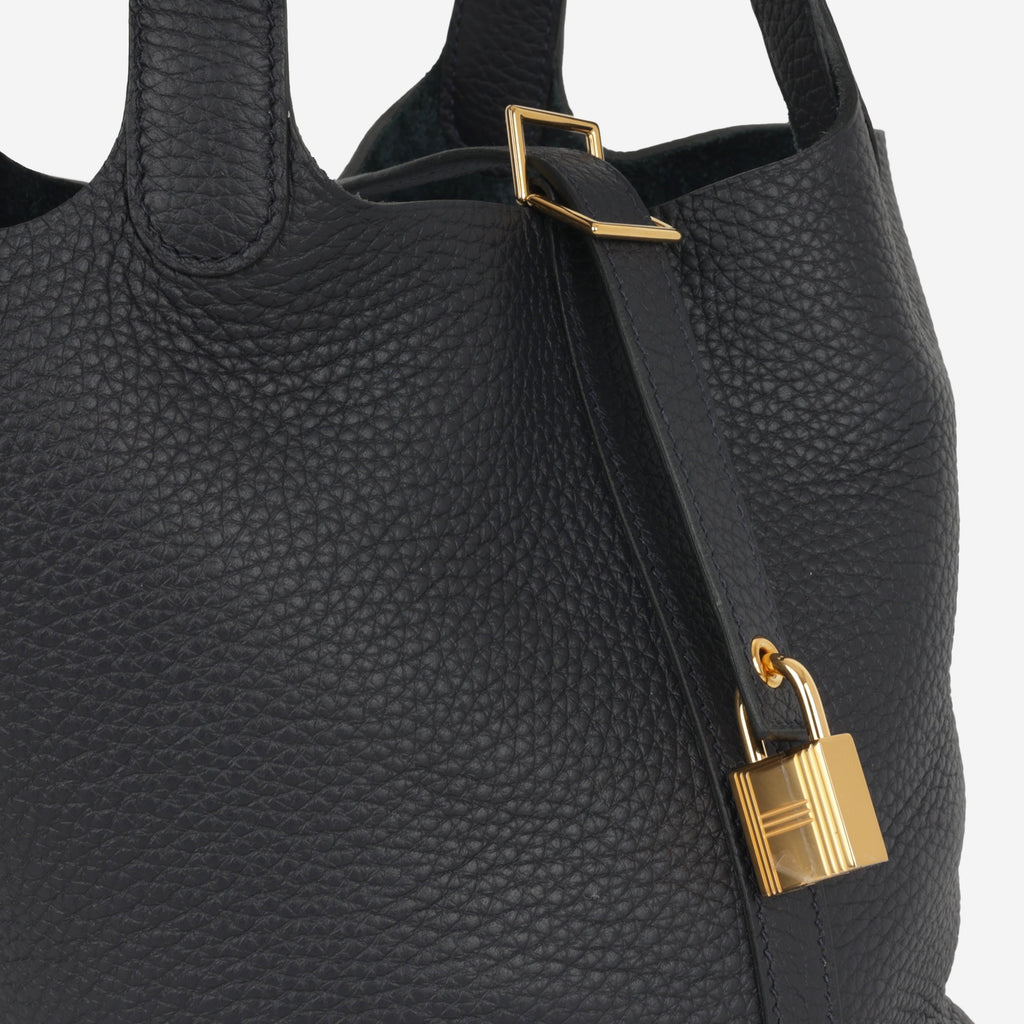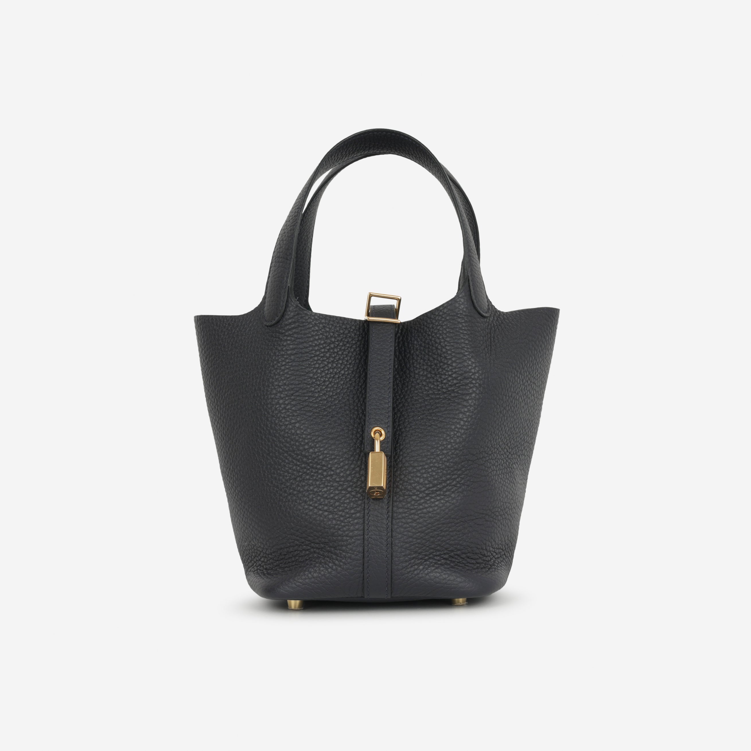 Sought-after Hermès Picotin 18 in Caban Clemence with Gold hardware. This compact tote is in great condition, showing gentle signs of wear while maintaining its timeless elegance and chic appeal. A perfect everyday piece that combines understated luxury with practicality.
