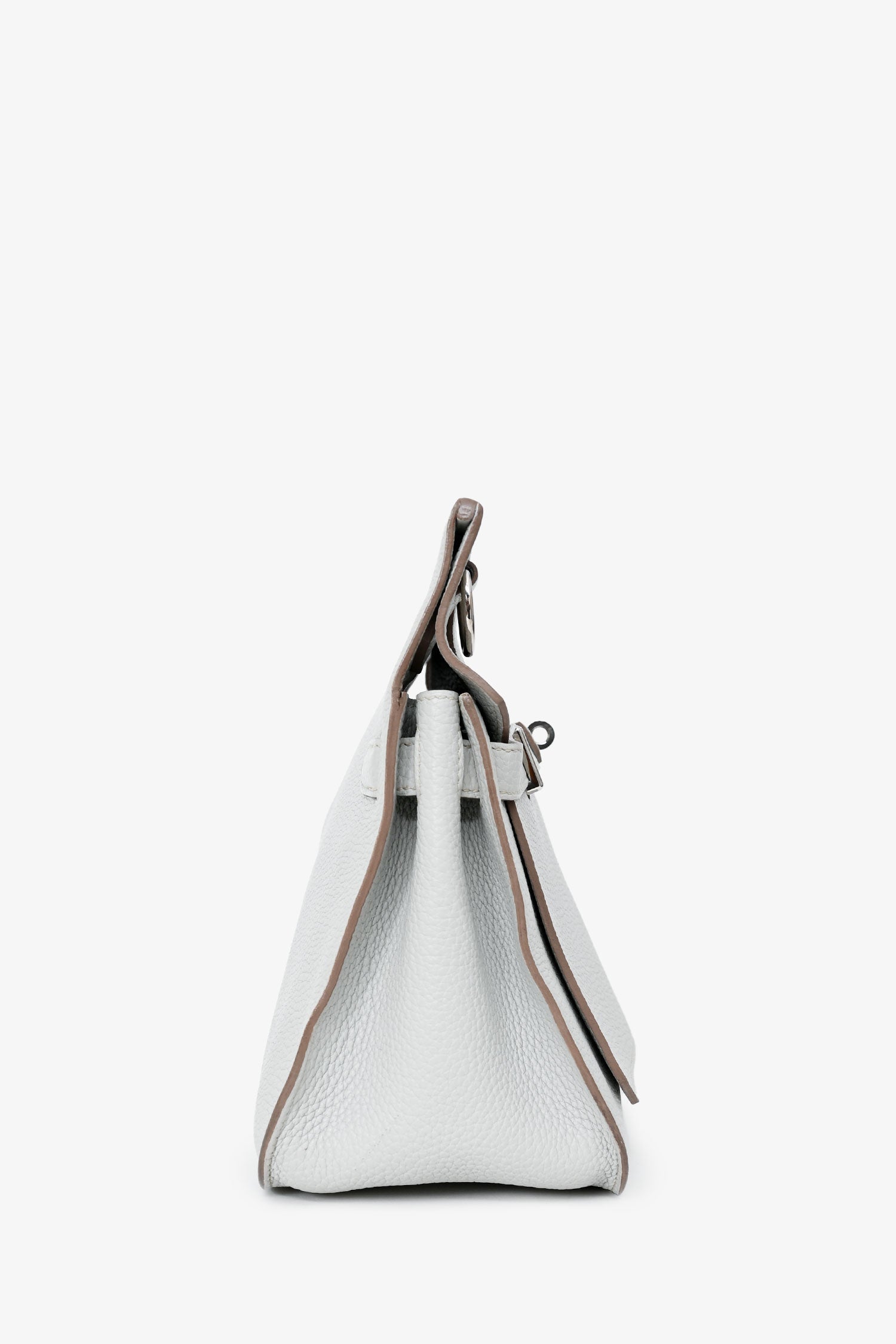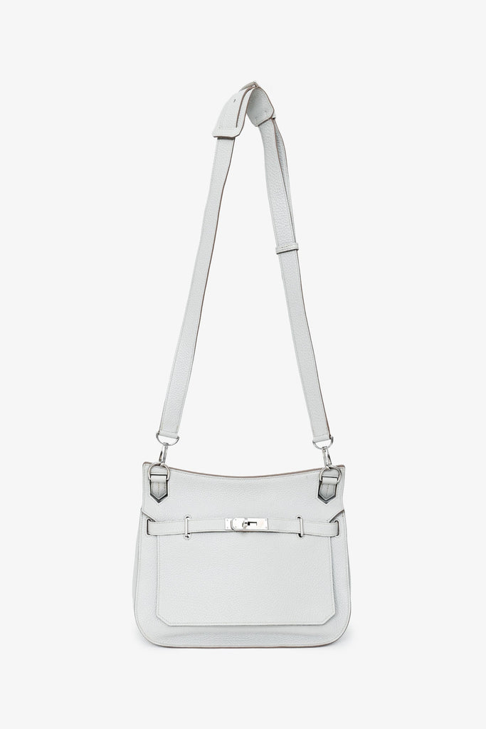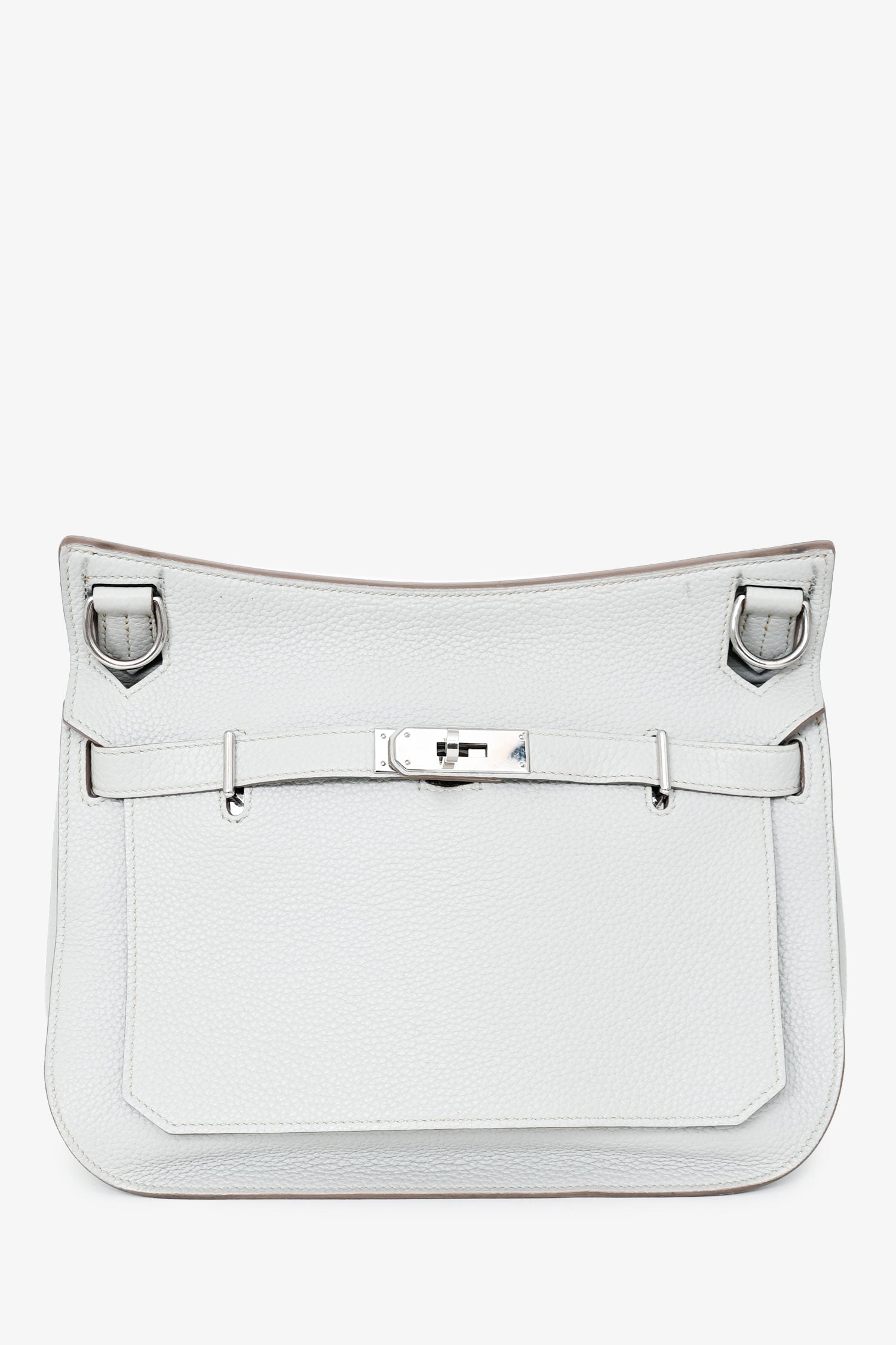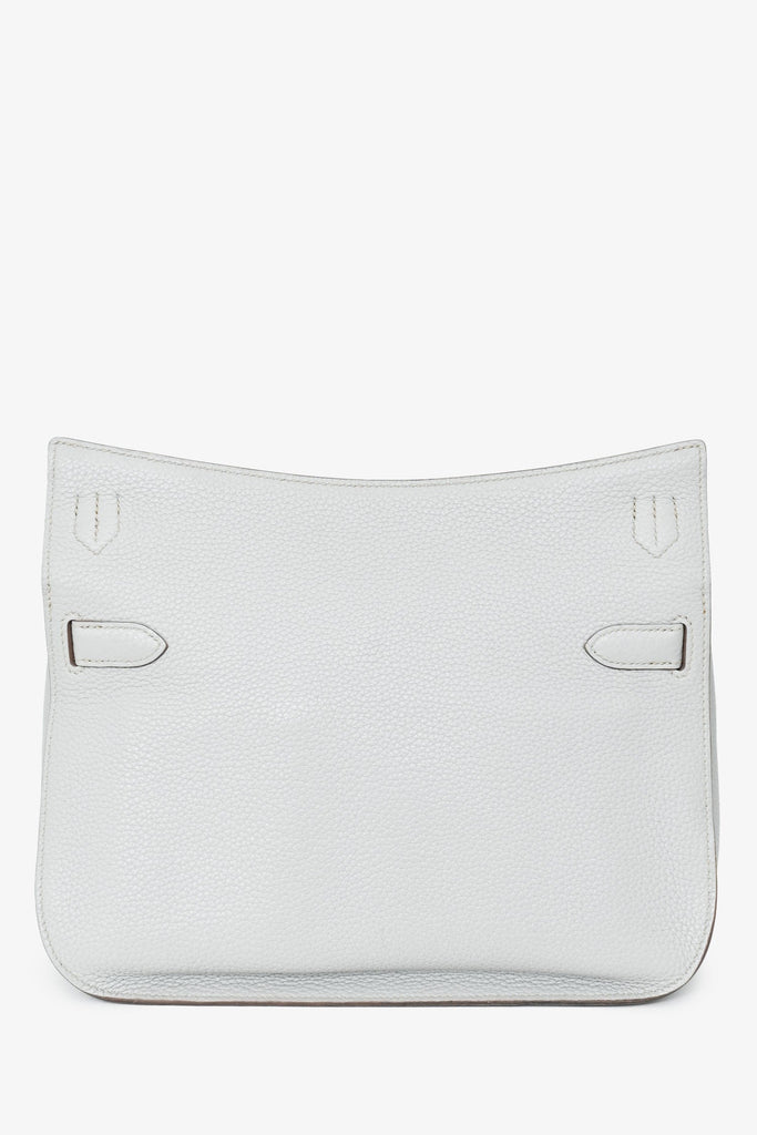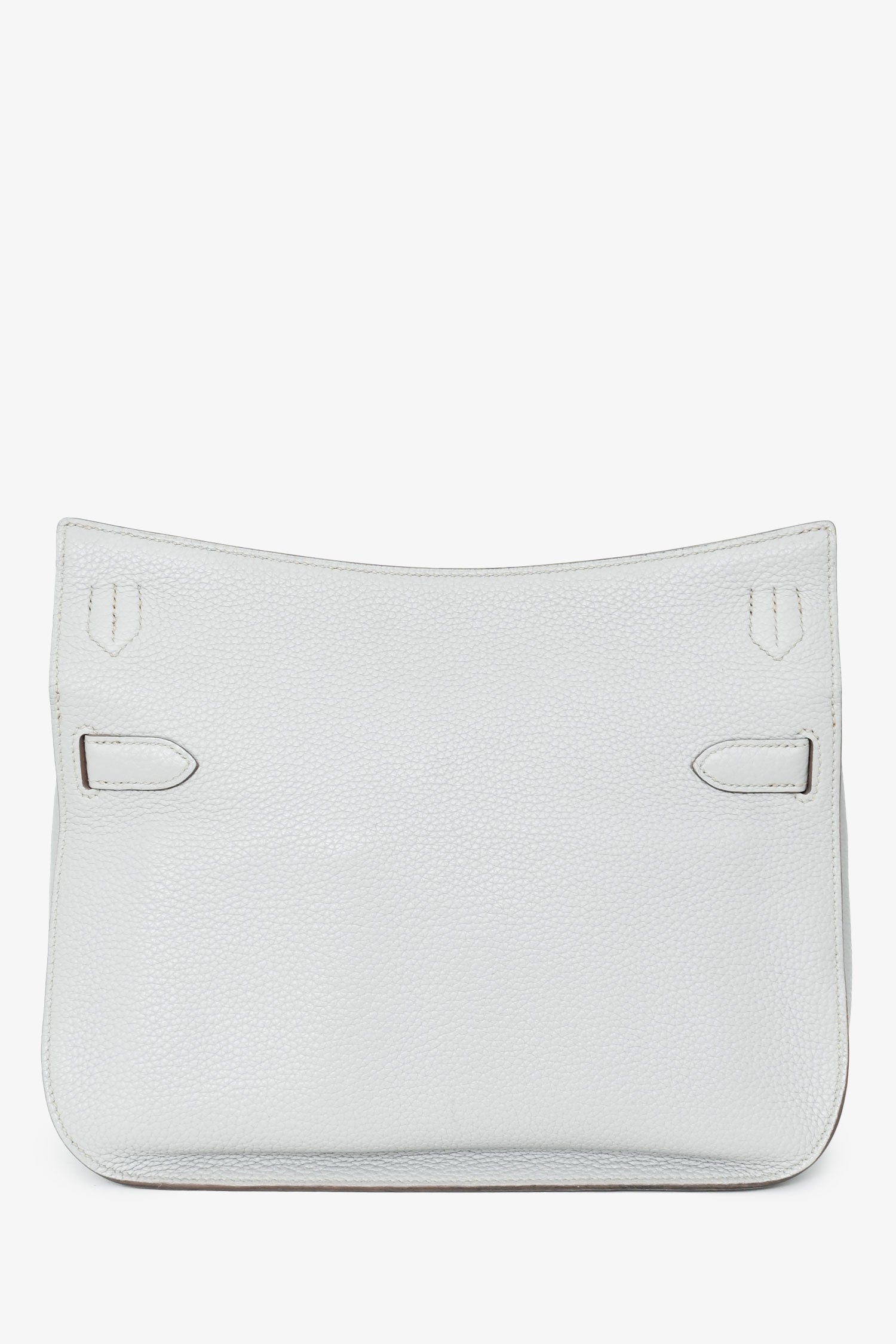 Hermes Light Grey Clemence Leather Jypsiere 28. Fold-over flaps with pull-through straps and turn-lock closure. Single attachable crossbody strap. 1 zip, 1 pen, and 1 slip pocket. Palladium-tone hardware. Tonal stitching.