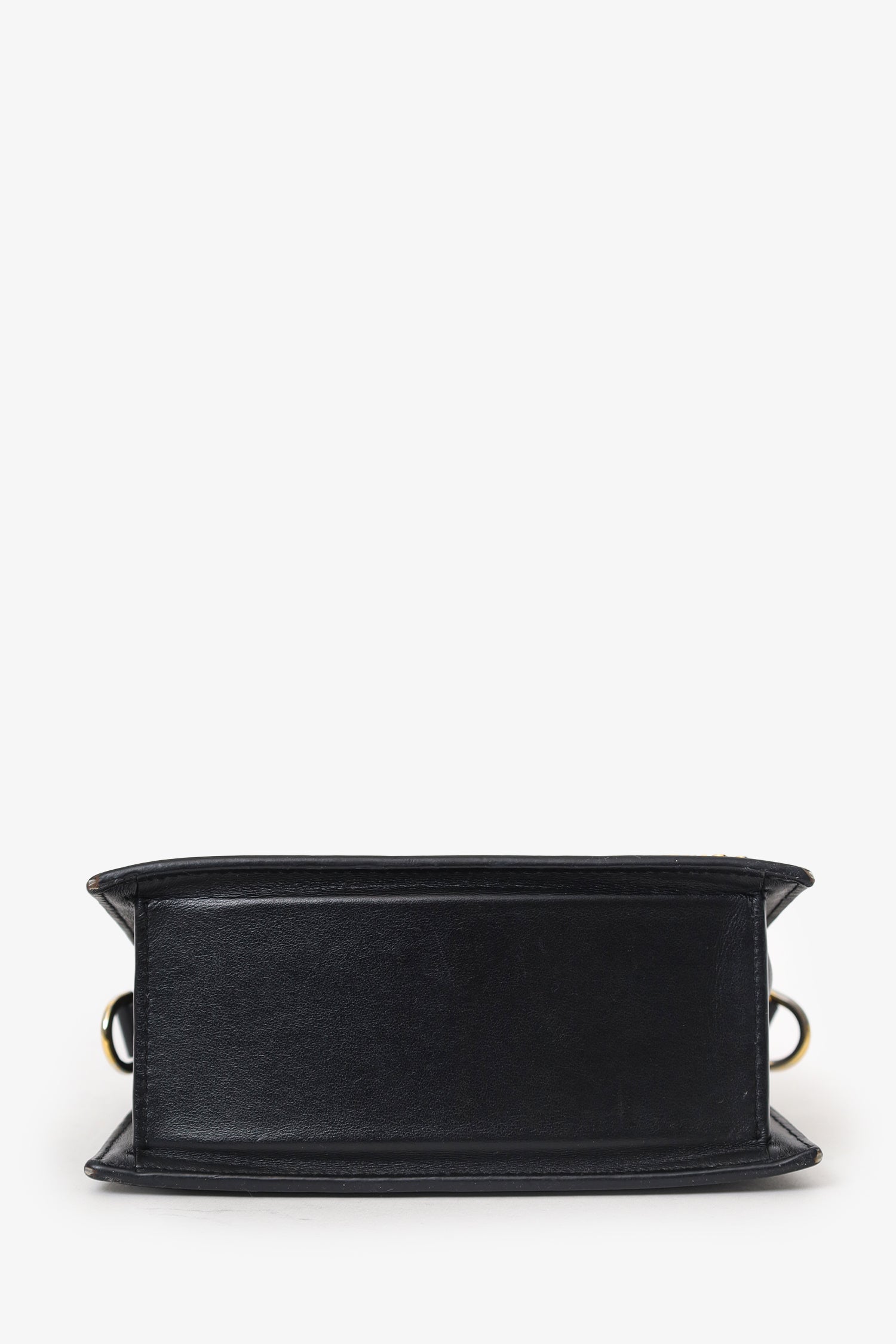 Jacquemus Black Leather 'Le Chiquito' Small Top Handle With Strap. Front fold-over flap with magnetic button closure. Top handle with adjustable strap with button-up closure. Removable and adjustable push pin crossbody strap with clasp closure. Single interior wall slip pocket. Gold-tone hardware. Tonal stitching.