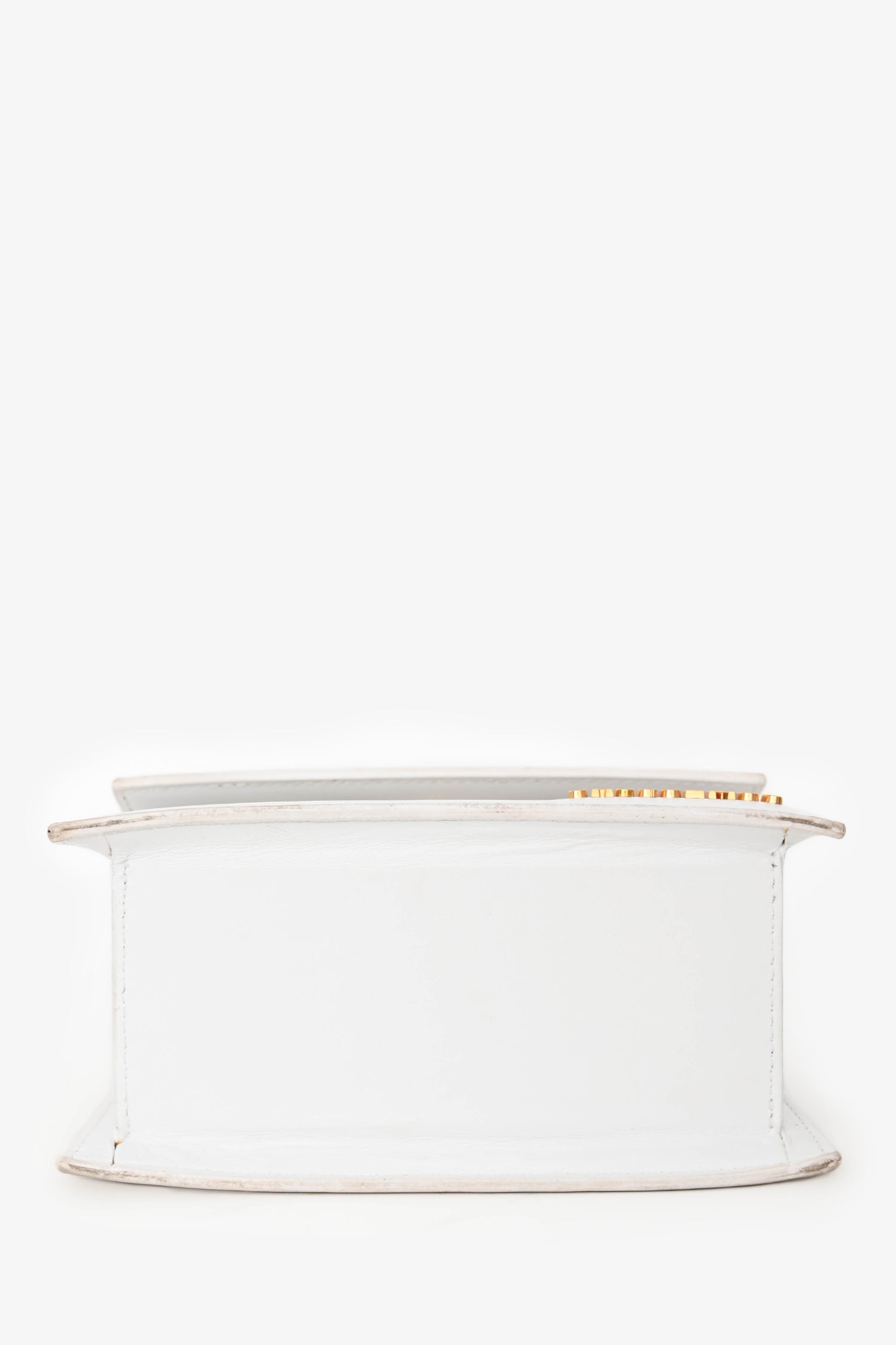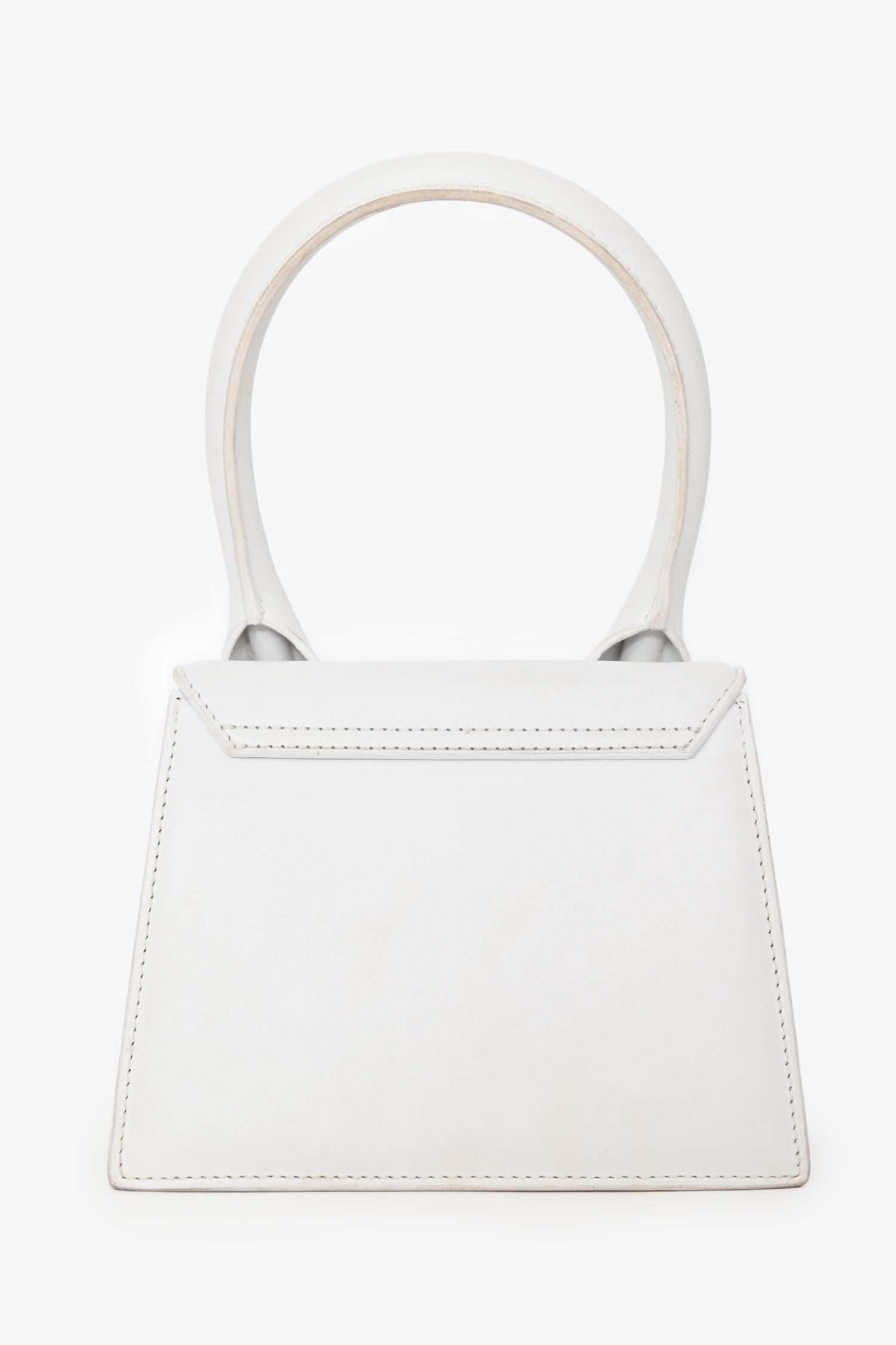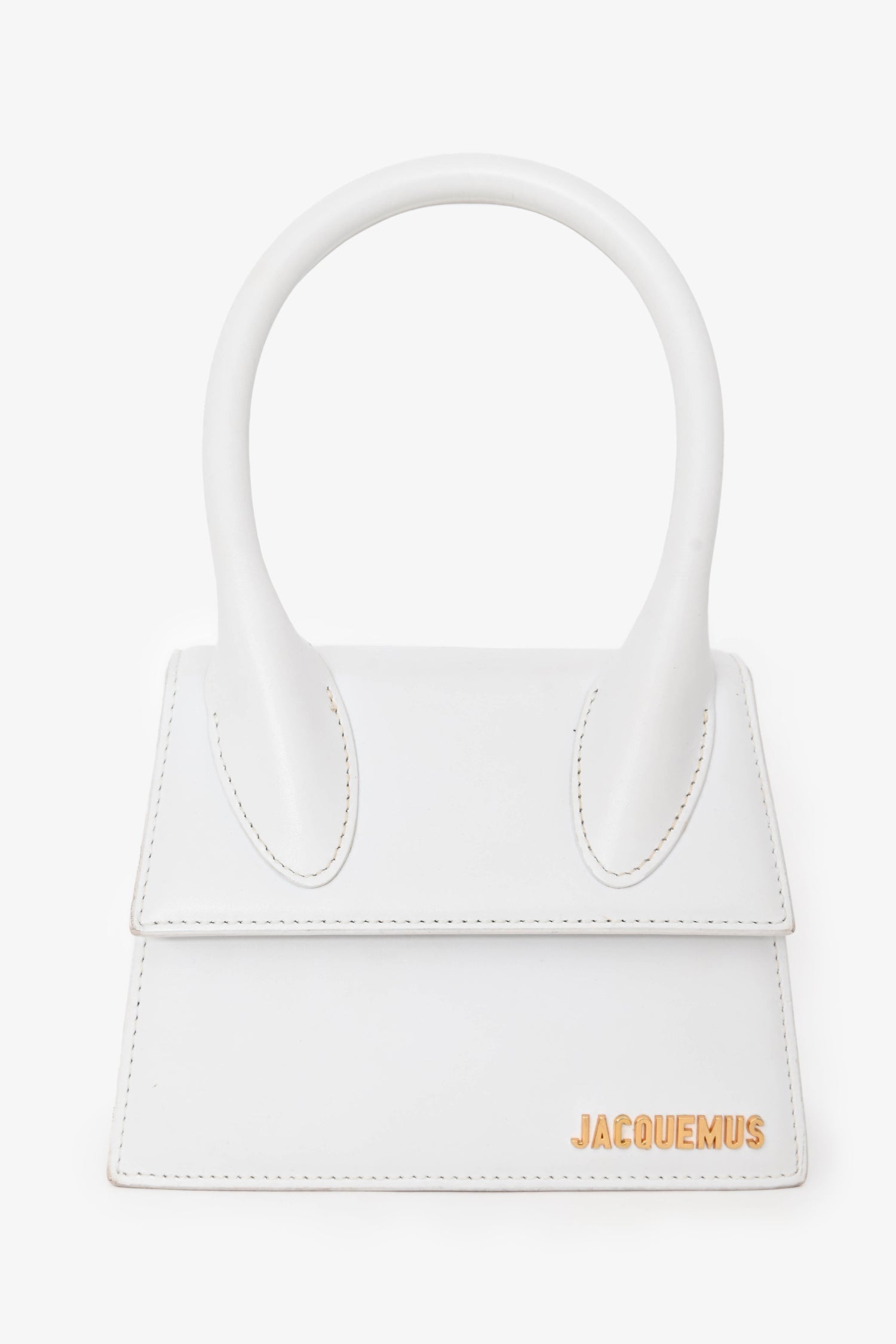 Jacquemus White Leather 'Le Chiquito Moyen' Top Handle Bag. Fold-over flap with snap closure. Single rolled top handle. Removable crossbody strap. Lined canvas interior with a slip compartment. Gold-tone hardware. Tonal stitching.