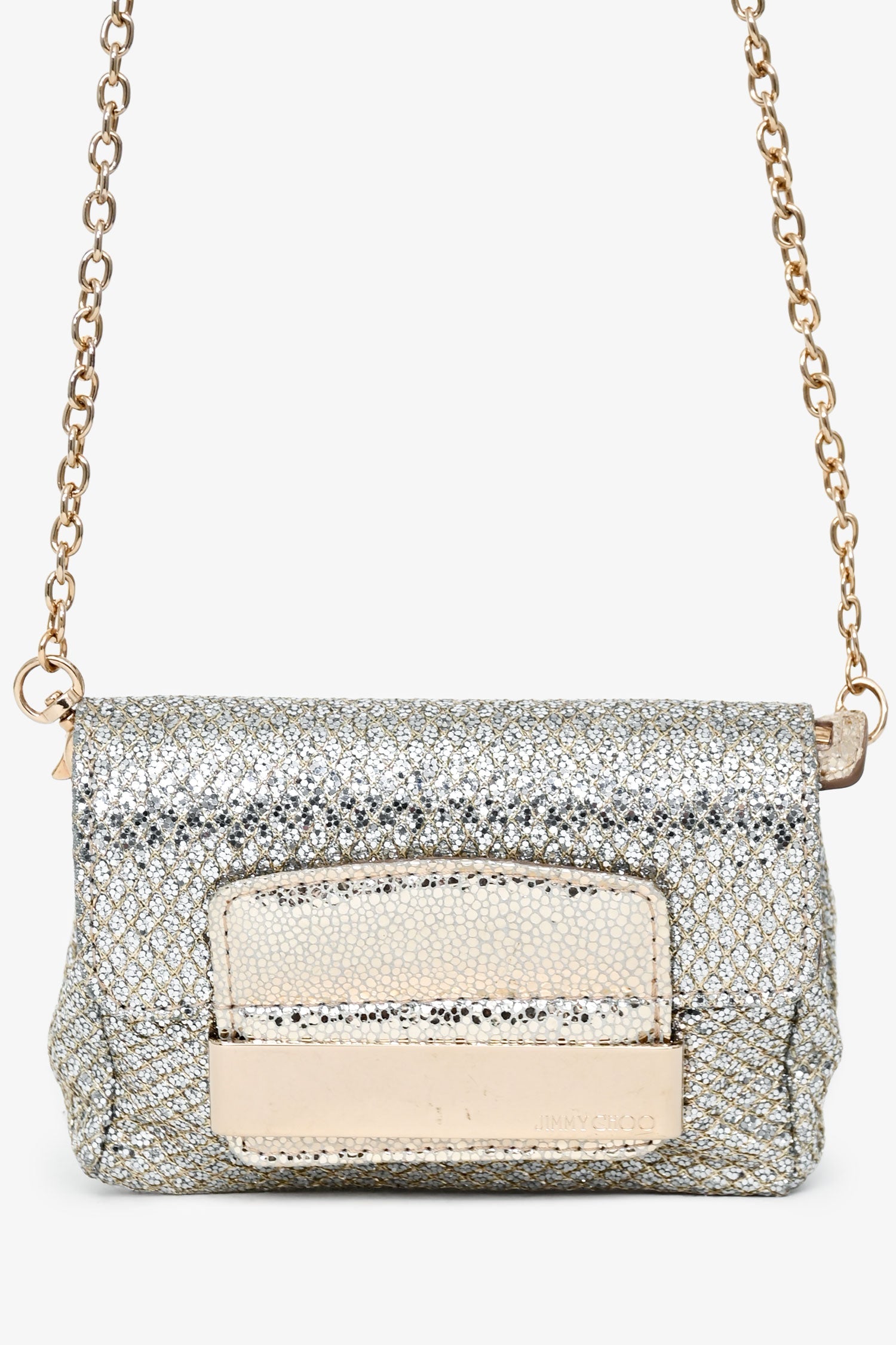 Jimmy Choo Silver/Gold Glitter 'Mini Caro' Shoulder Bag. Front fold-over flap with clasp closure. Interior top zip closure. Detachable chain strap. Lined interior. Gold-tone hardware. Tonal stitching.