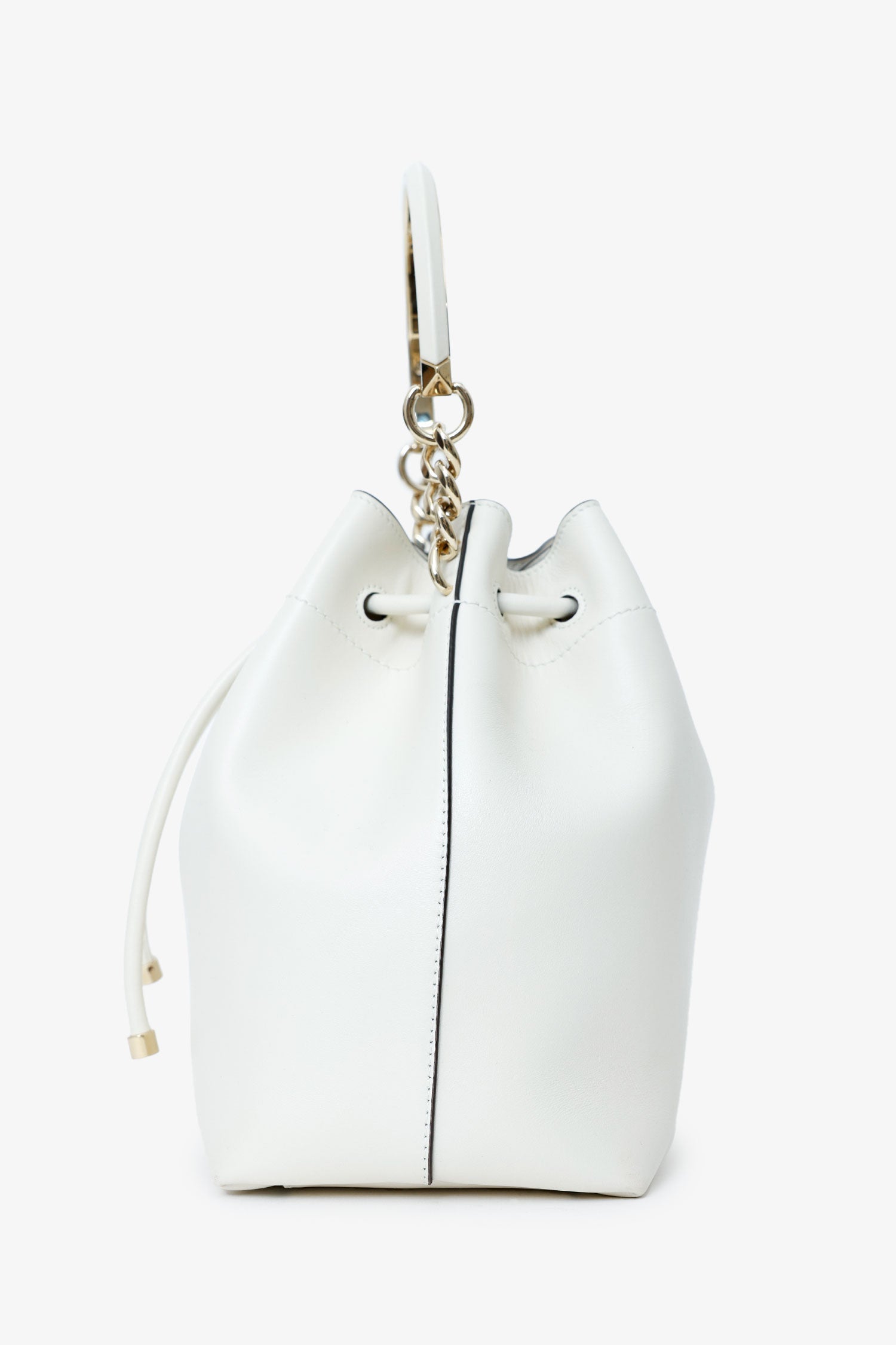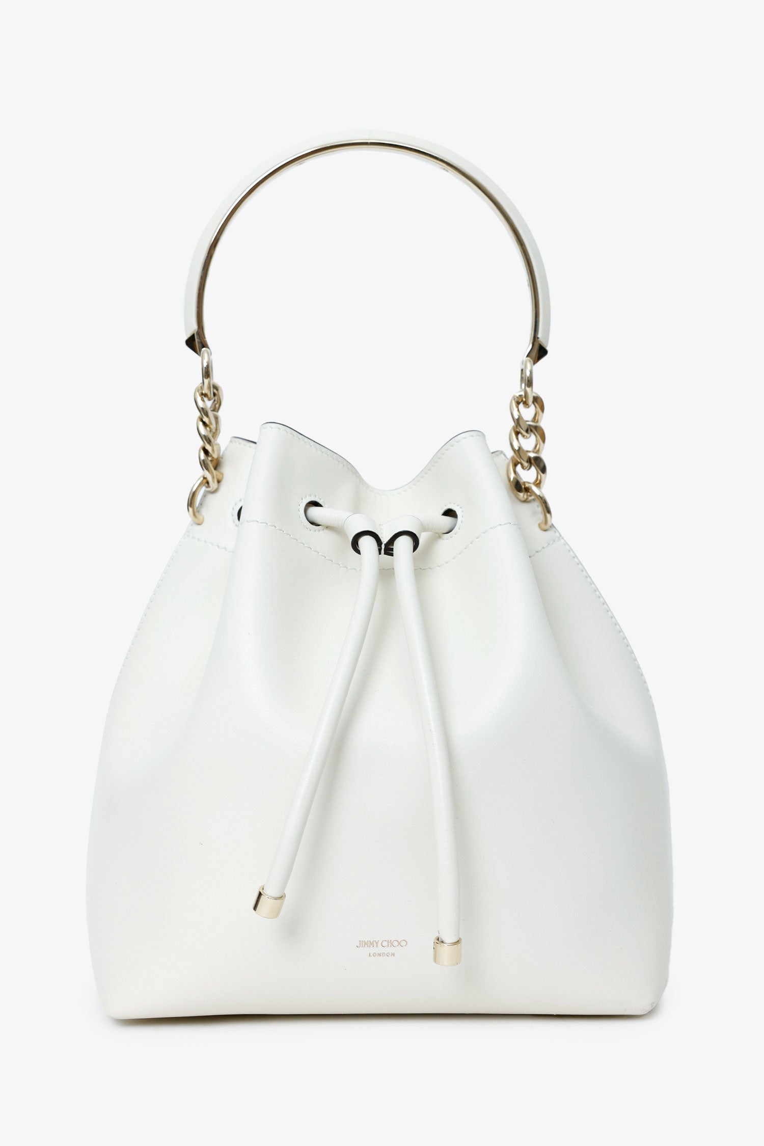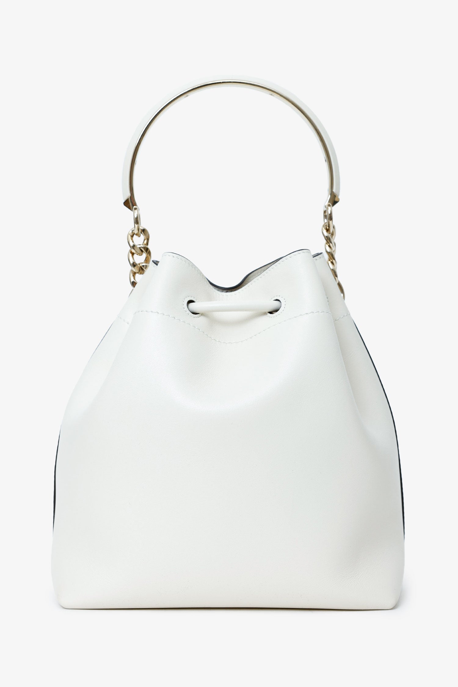 Jimmy Choo White Leather Bonbon Bucket Bag. Top cinch-cord closure. Top handle. Lined interior with rear zip pocket. Gold-tone hardware. Tonal stitching.